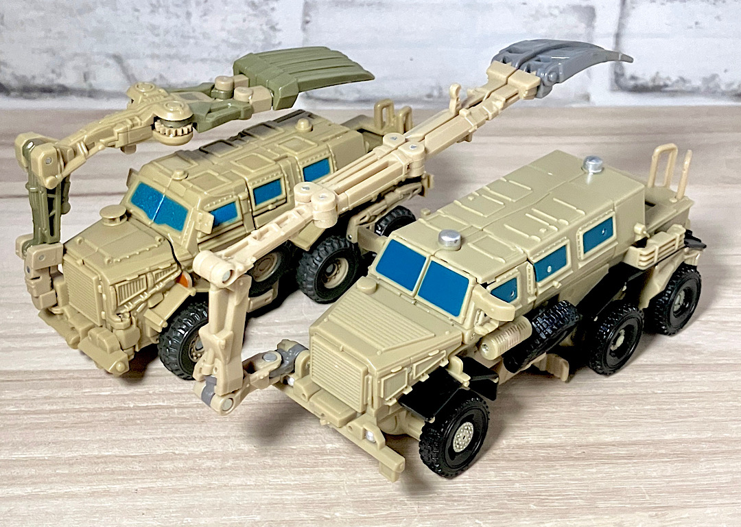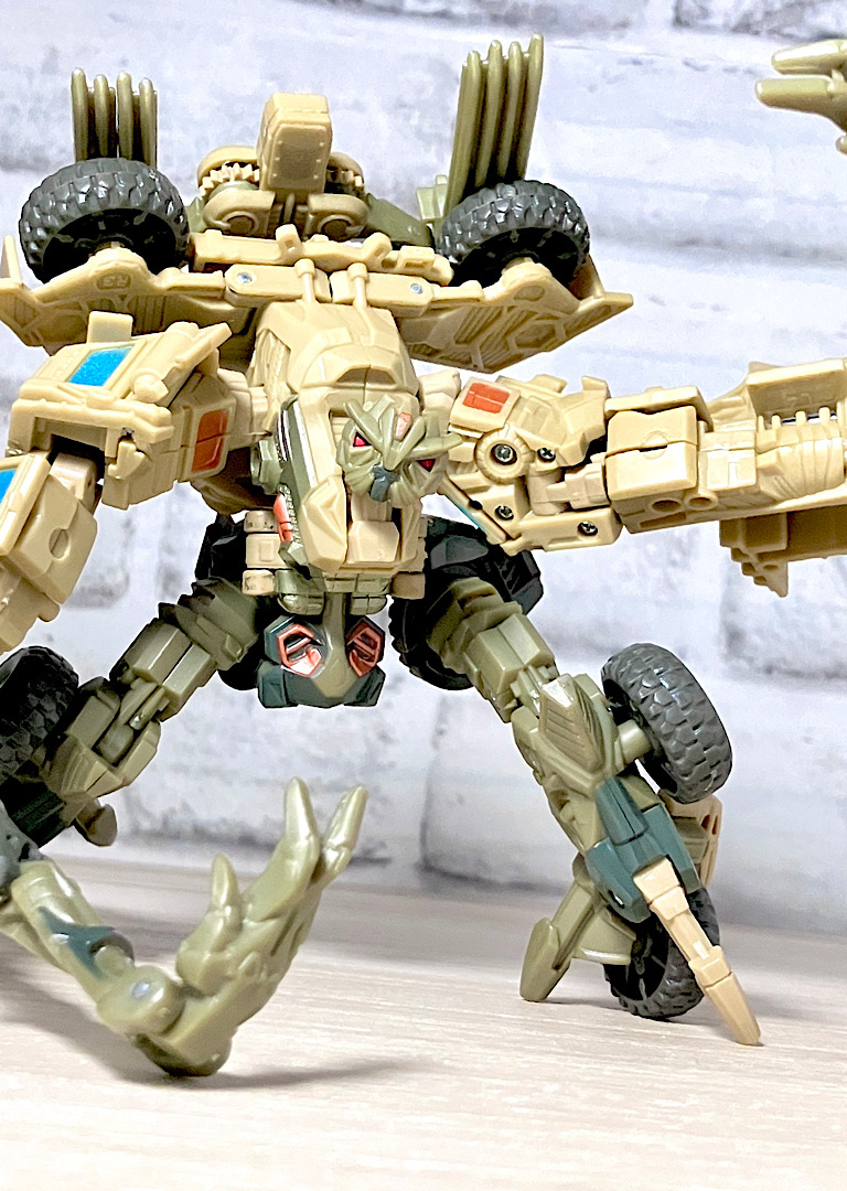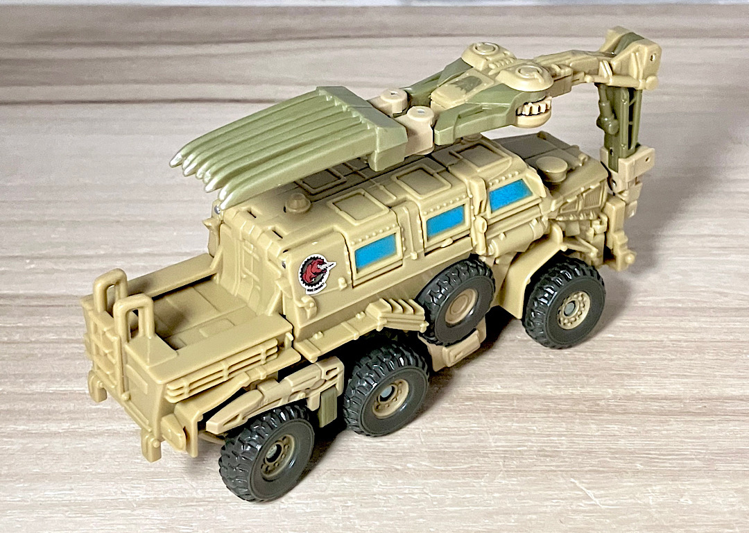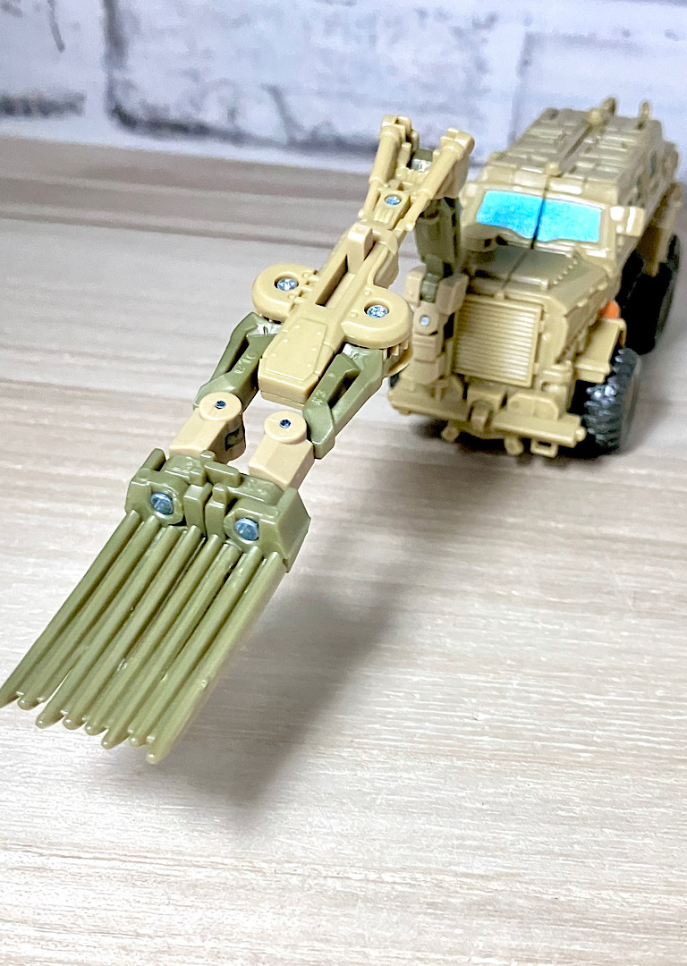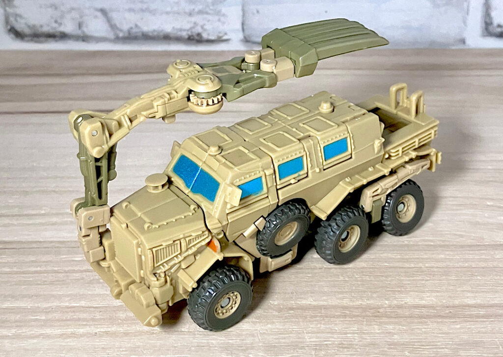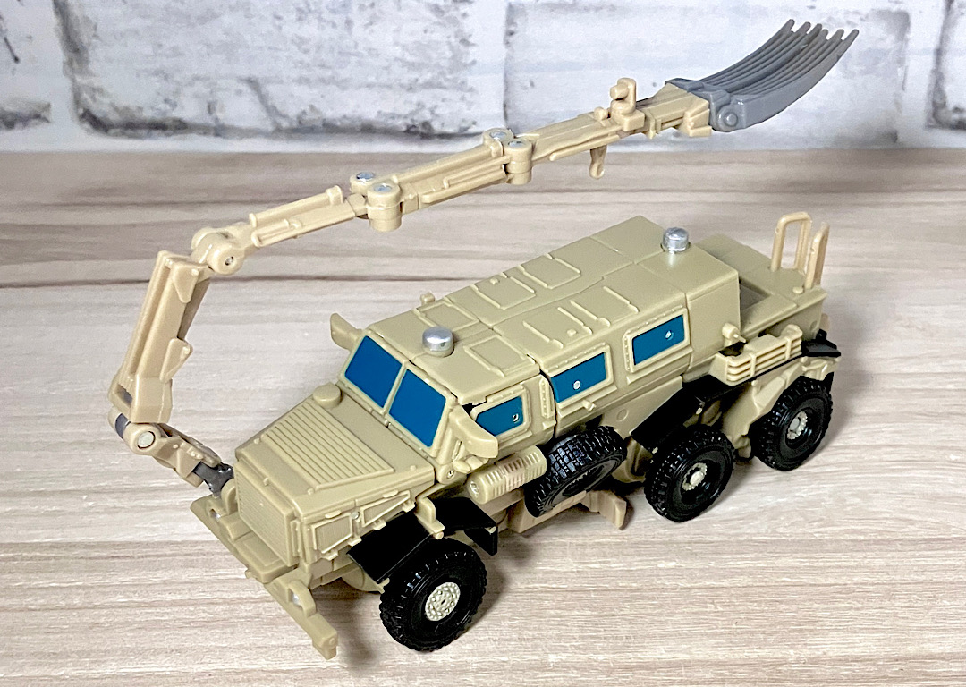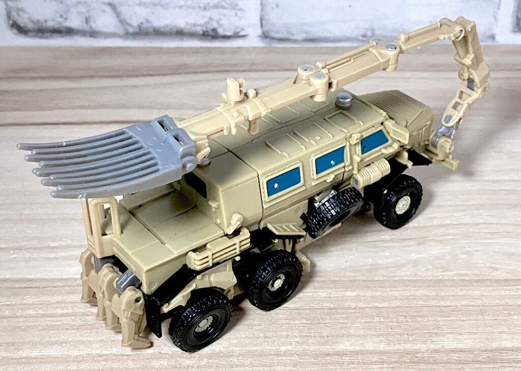 【ビークルモード】フォースプロテクション社の地雷除去特殊車両・バッファローに変形。映画トランスフォーマーの影響で認知度が爆上がりした車両のひとつでしょう。ベースが軍用車両のため、無骨でイカついシルエットがクールです。最大の特徴である地雷除去アームは実車よりも大きいのですが、これは映画でアレンジされた部分だったりします。