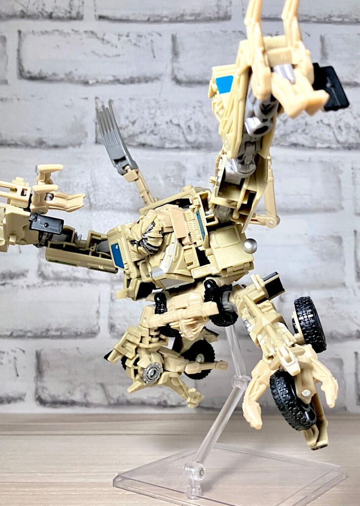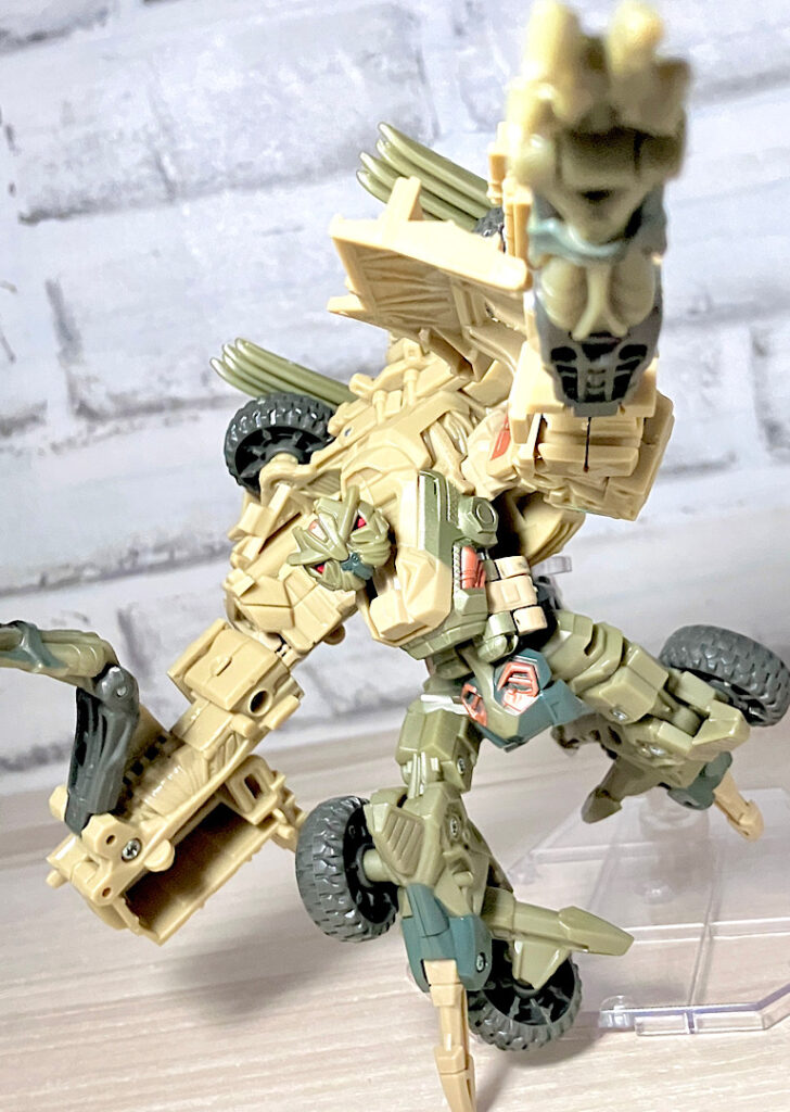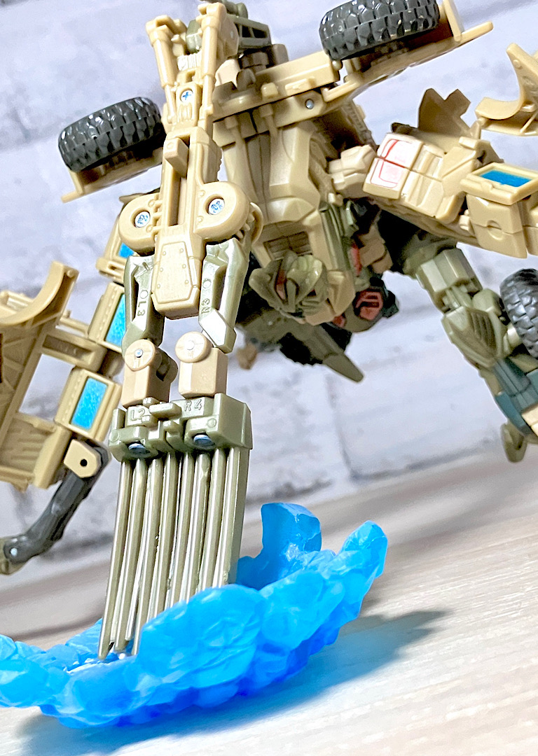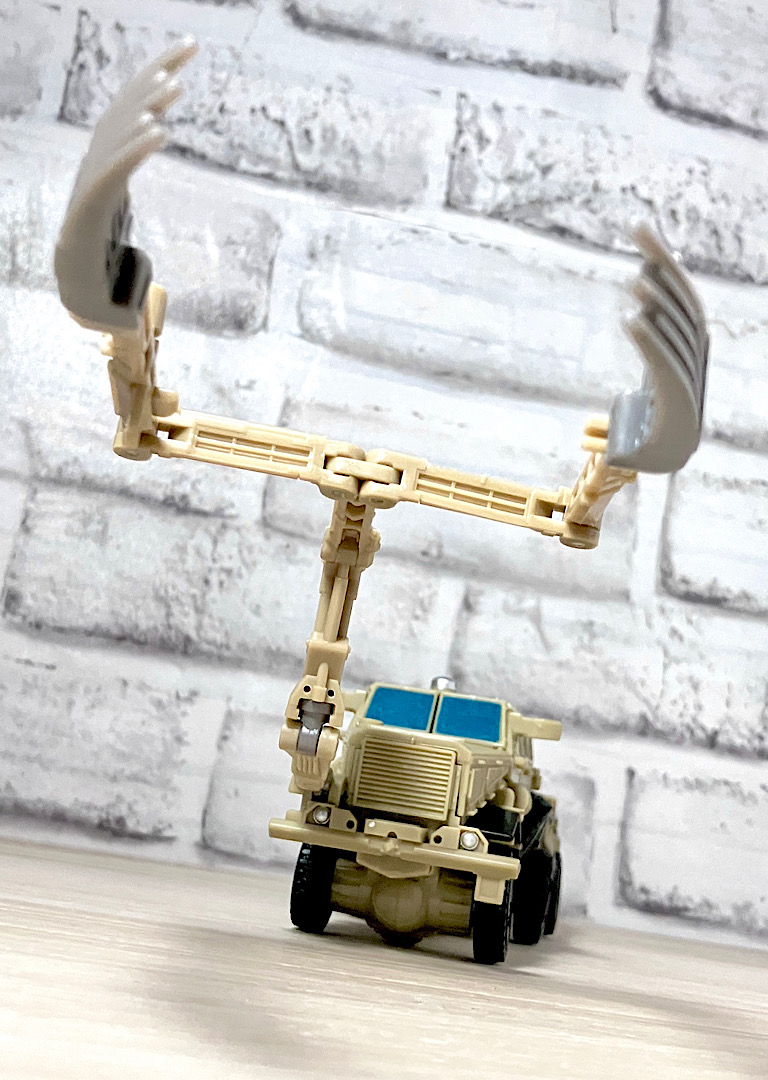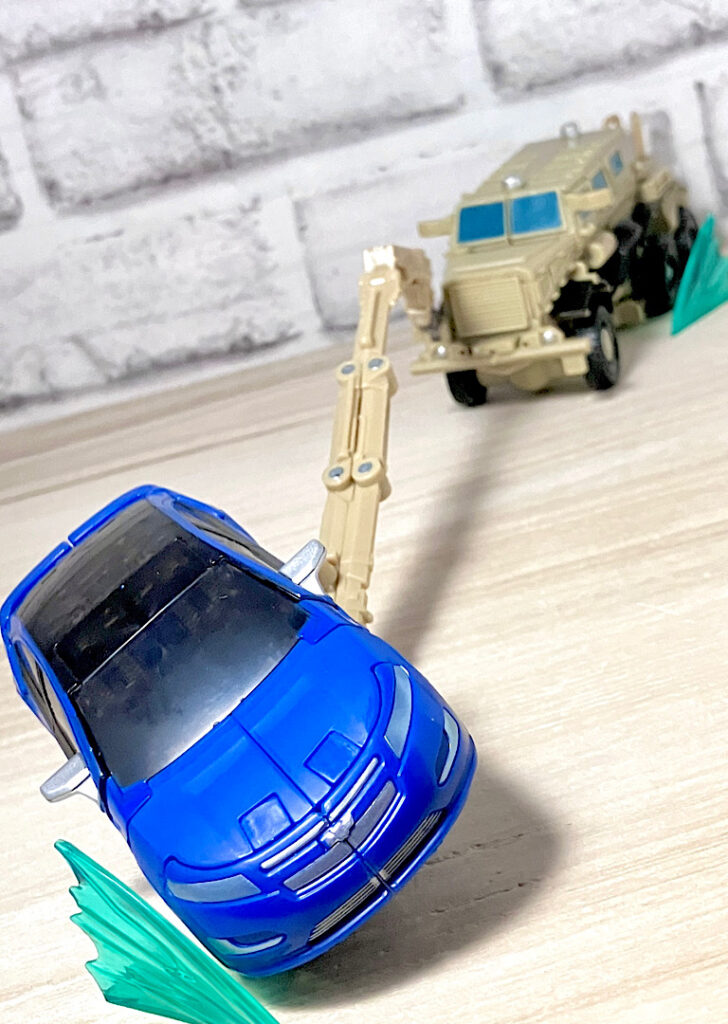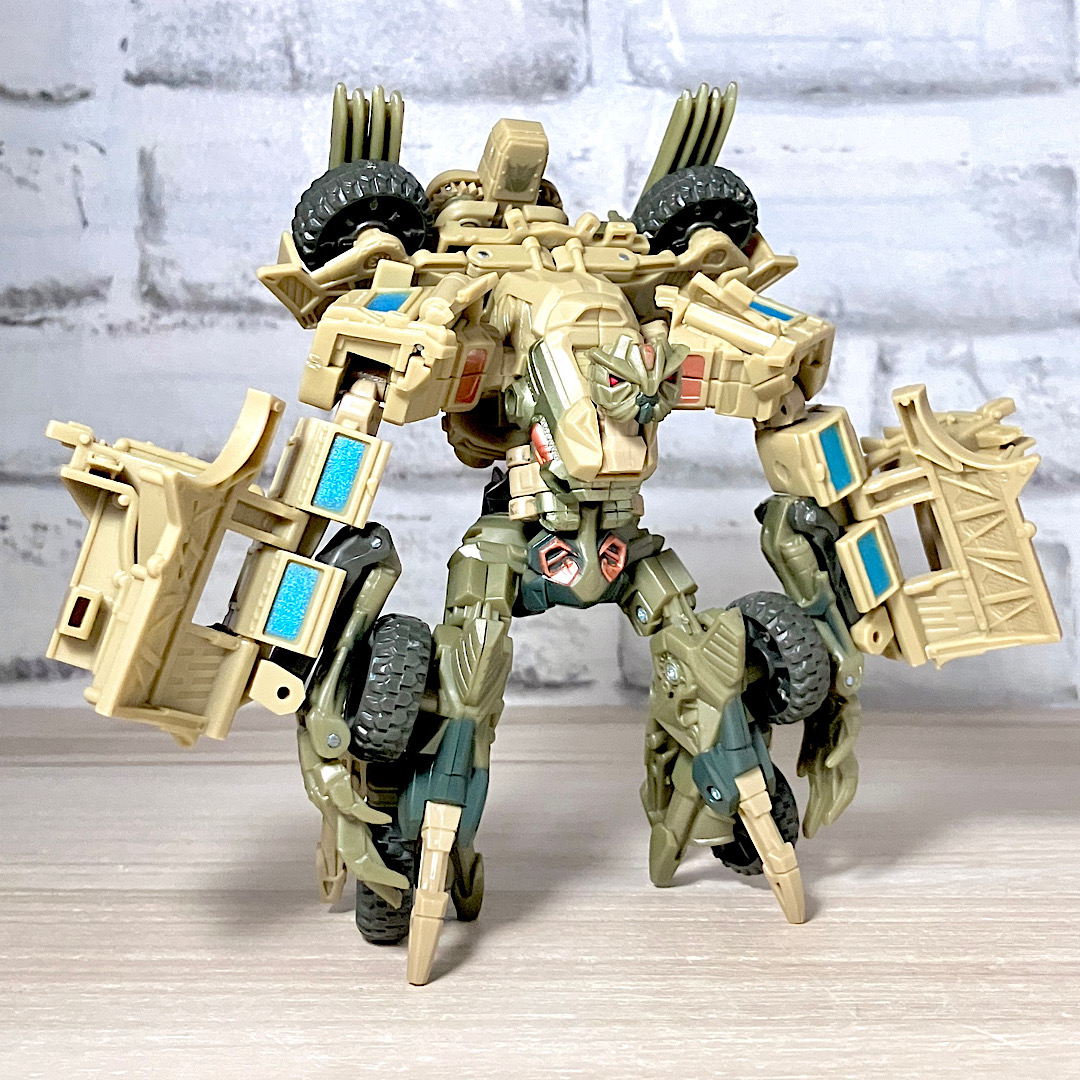 【ビークルモード】フォースプロテクション社の地雷除去特殊車両・バッファローに変形。映画トランスフォーマーの影響で認知度が爆上がりした車両のひとつでしょう。ベースが軍用車両のため、無骨でイカついシルエットがクールです。最大の特徴である地雷除去アームは実車よりも大きいのですが、これは映画でアレンジされた部分だったりします。