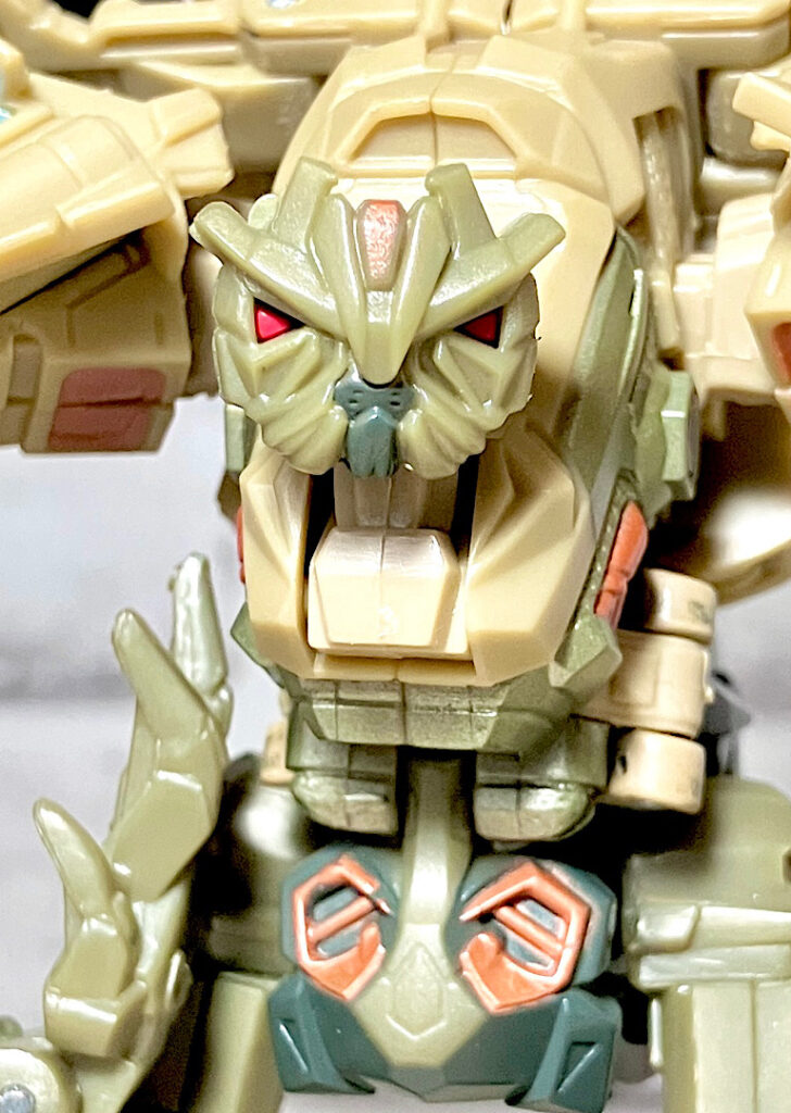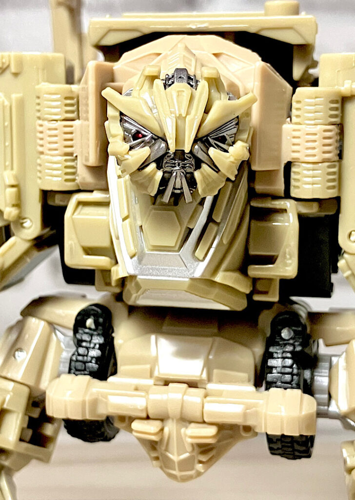 【アップ】クシャクシャっとなった梅干し顔(?)に、つぶらな瞳。情報量が多い実写頭部をかなり忠実に再現しています。この系の顔はリベンジ以降のコンストラクティコンにも引き継がれました(メタ的にはCG使い回し)。