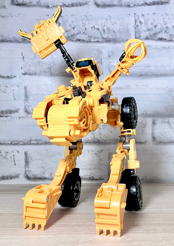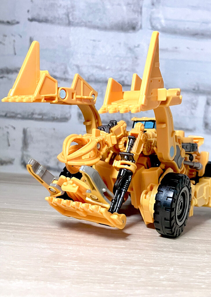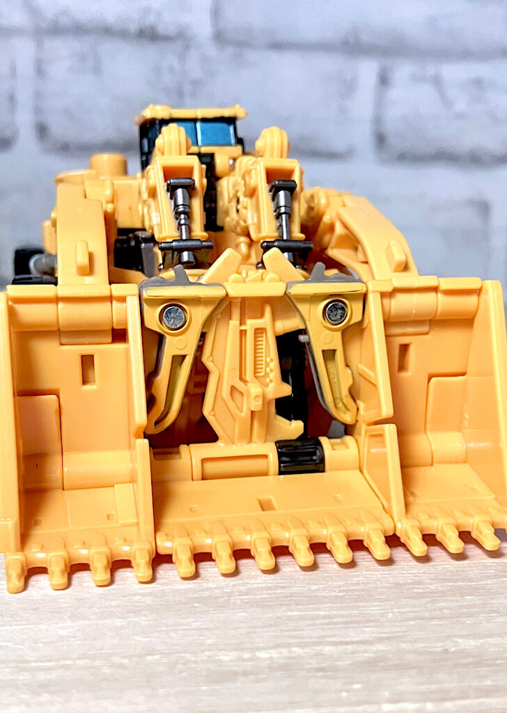 デザインは1作目のボーンクラッシャーから引き継いだようなモンスタースタイル。全身に散りばめられたブレードやタイヤなどの建機モチーフがたまりません。というかこれがホイルローダーから変形するオモチャということがにわかには信じがたいくらいのゴチャゴチャ具合ですね(ポジティブな意見です)。
