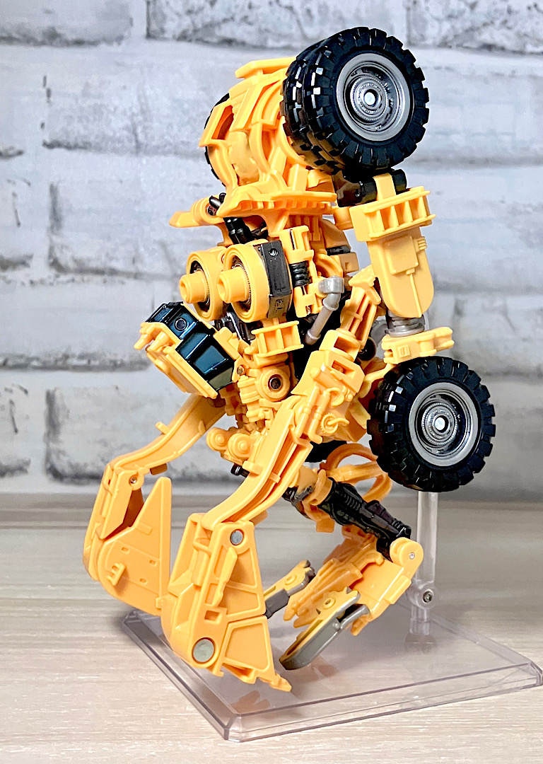 【変形】すごく難しそうに見えますし、実際最初は説明書とにらめっこしながらよくわからないパーツ移動をしていくことになるのですが、意味がわかるととても単純で面白い変態変形。タイヤとバケットが合わさって足になるところなんかはもはや芸術的です。