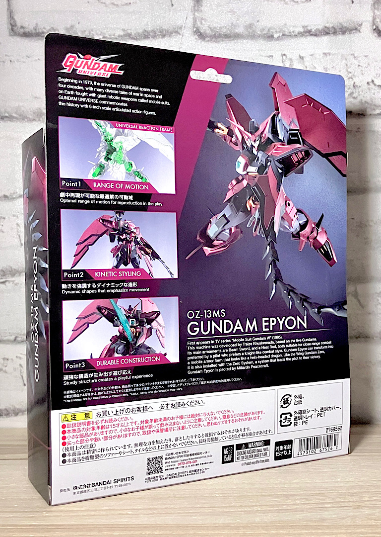 【パッケージ】ガンダムユニバースはワールドワイド展開を狙い、アメトイで標準的な6インチサイズ+過度なギミックやアクセサリを抑制した比較的低価格なコレクションライン。このたび内部フレームを一新してリニューアルスタートとなりました。ガンダムエピオンはリブートWAVE1のうちの1体。W系商品は北米展開を考えるとやっぱりはずせないですね。