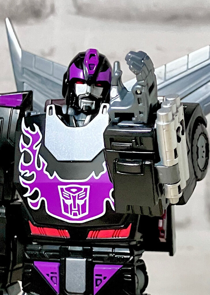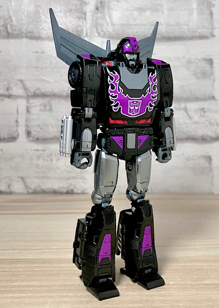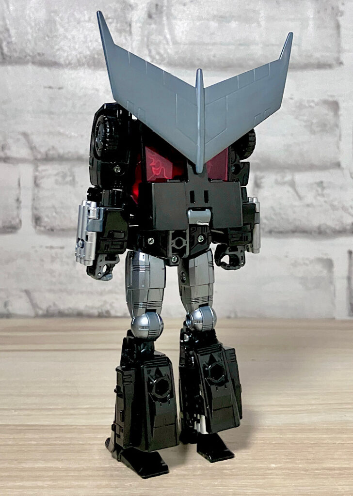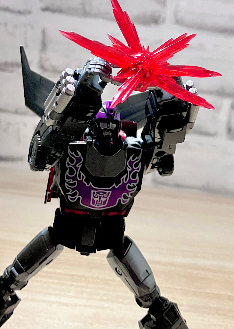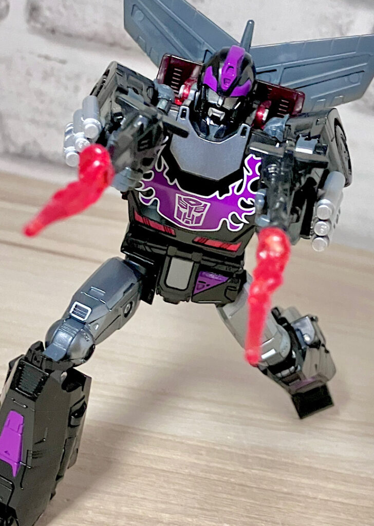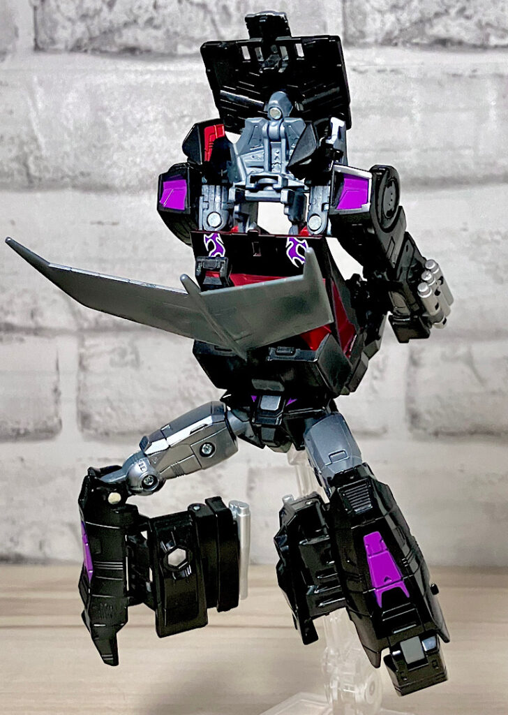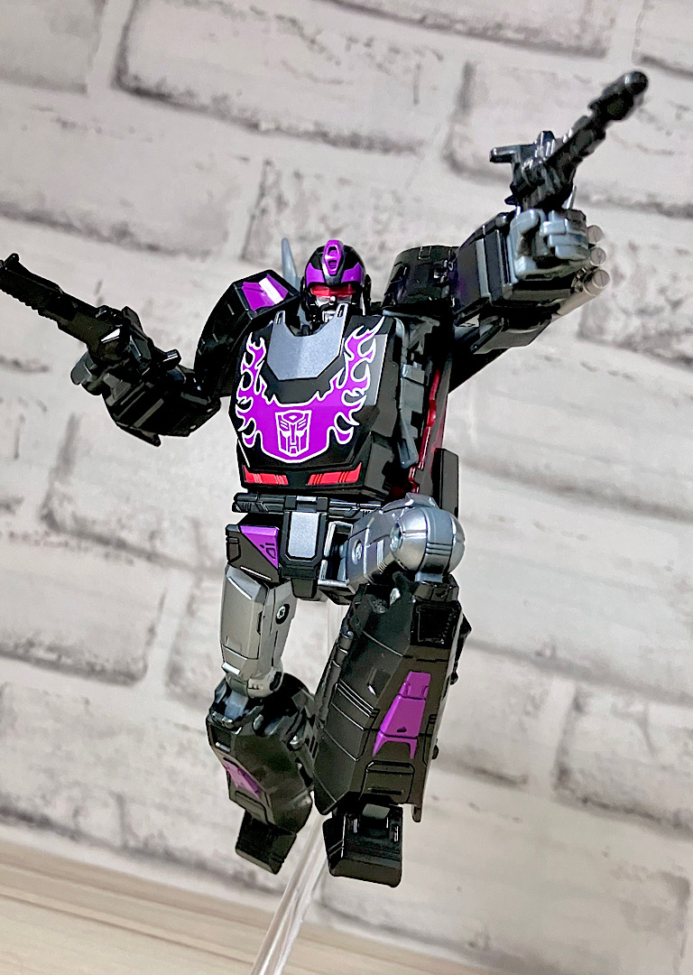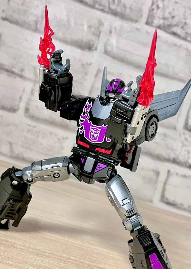 【ロボットモード】型としては傑作と名高いSSホットロッドのリデコ。サイズ(デラックスクラス相当)に対してひとつ上のクラス(ボイジャークラス)のコストを贅沢に使った非常に密度感のあるアイテムです。そしてカッコ悪くなるはずの無い黒リカラー!もう傑作確定ですね。