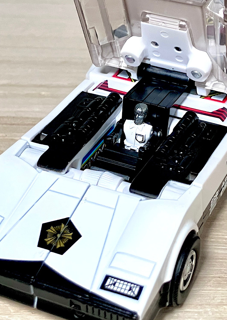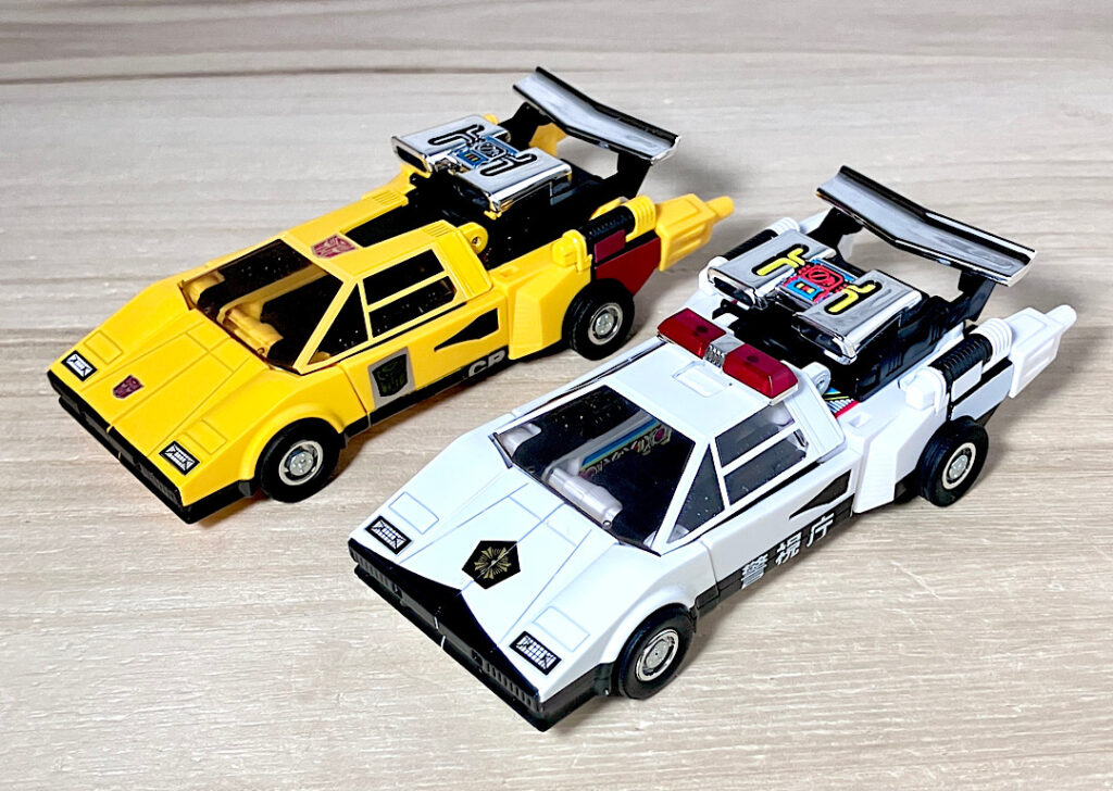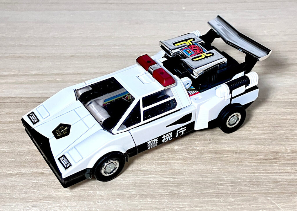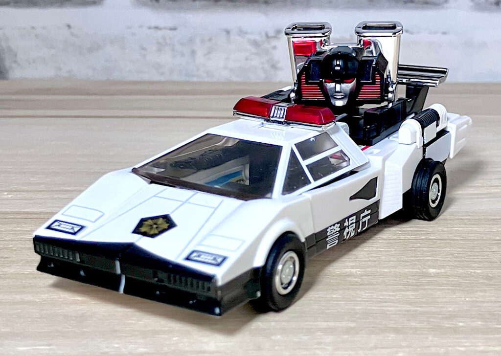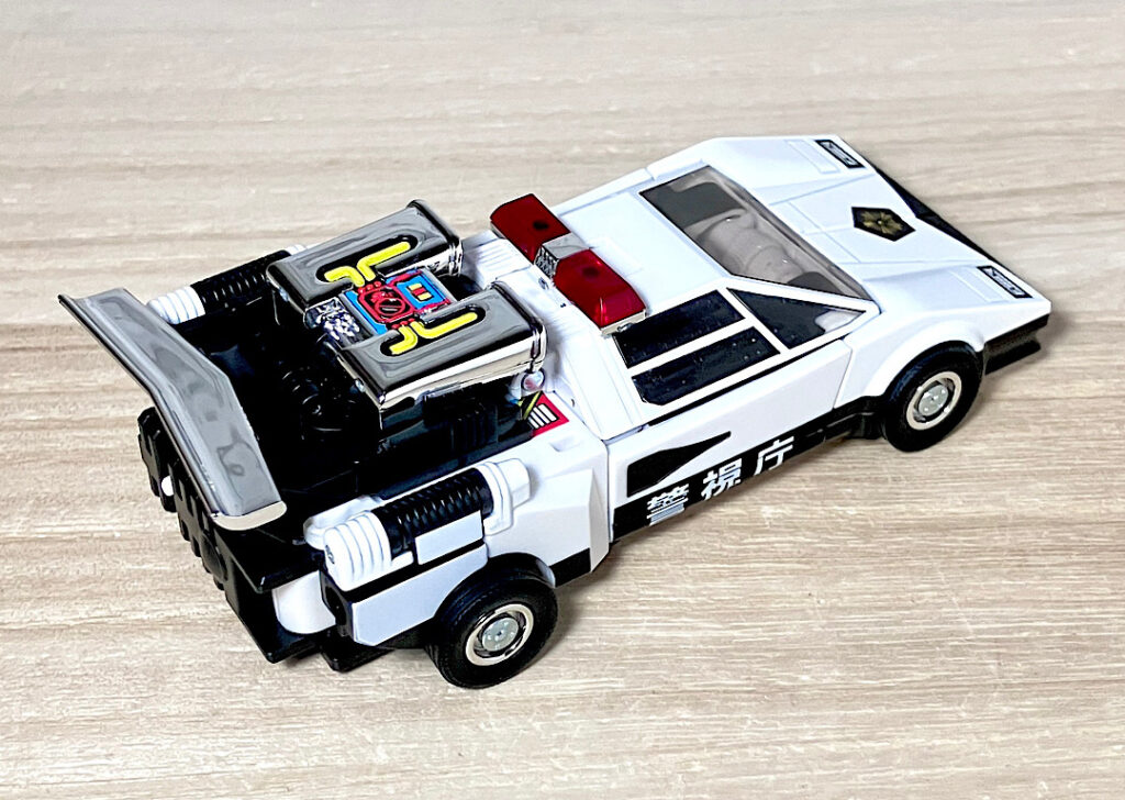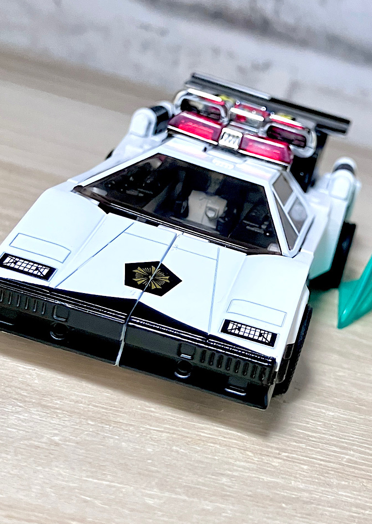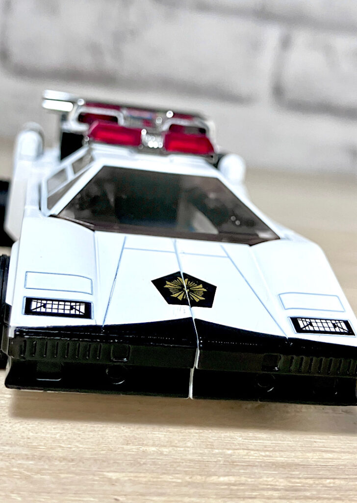 【ビークルモード】パッケージから出してビークルから行きましょう。コルドンはダイアクロン「カウンタックパトカータイプ」が元ネタの先祖返りリカラー。初出は2018年のマスターピースという新しめのキャラで、それがさらにG1仕様に遡ってリリースされるというまさに仮想復刻の極みみたいなアイテムです。たぶんダイアクロンのカウンタックパトカータイプとしても初復刻だと思うので、そういう意味でも価値ある商品ではないでしょうか。