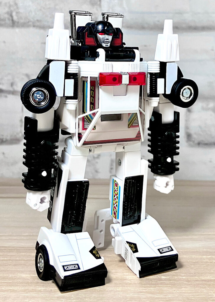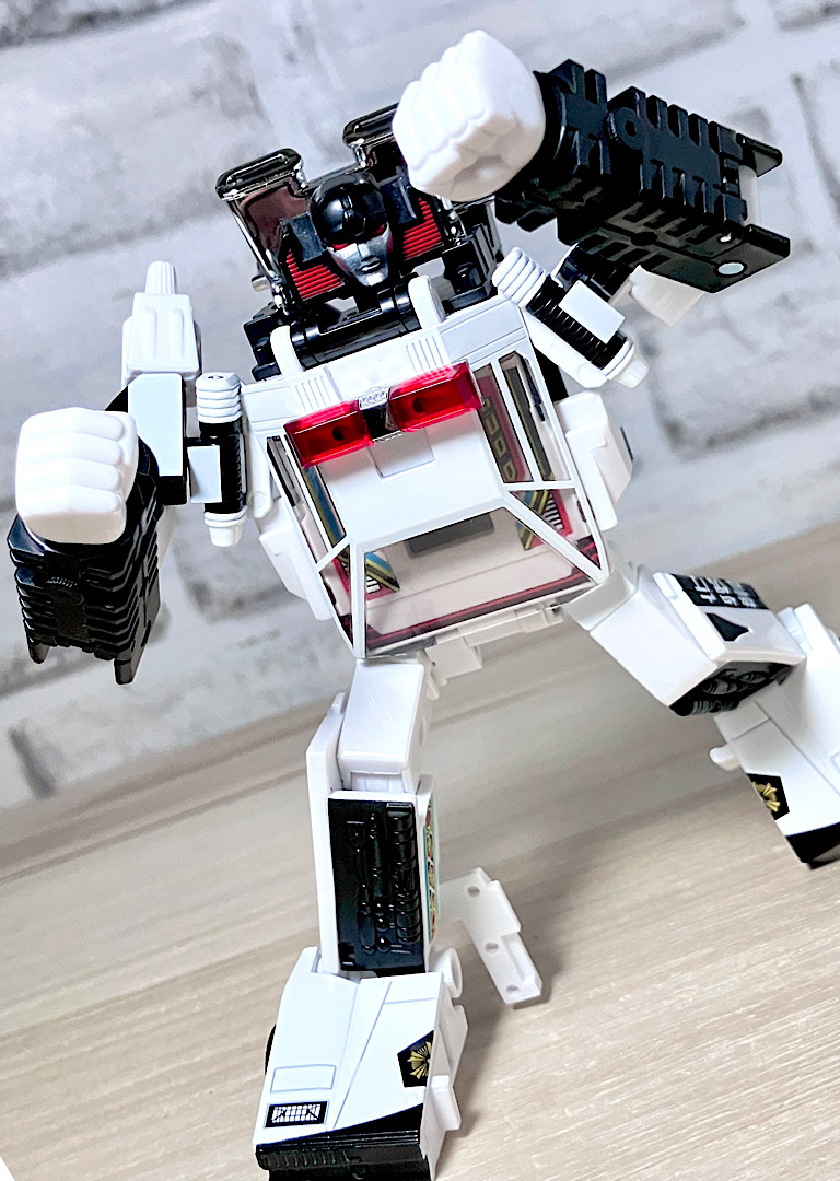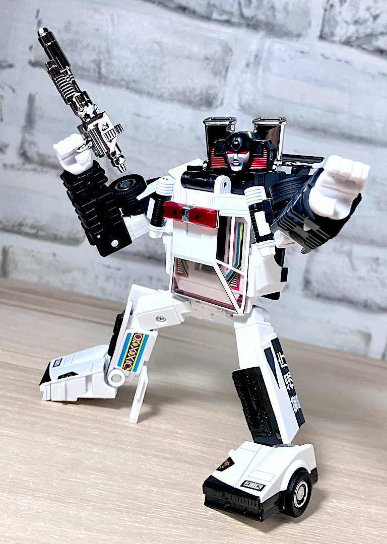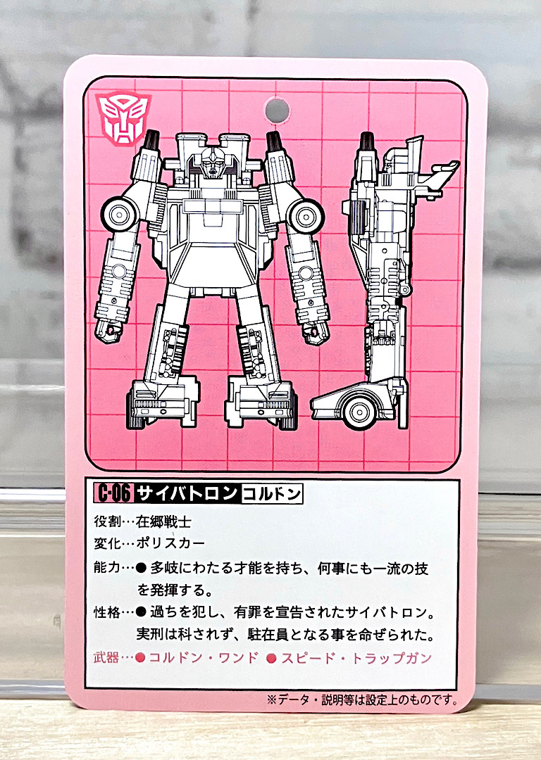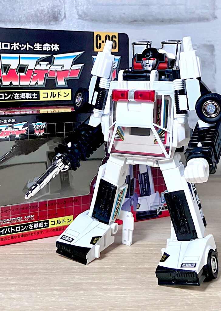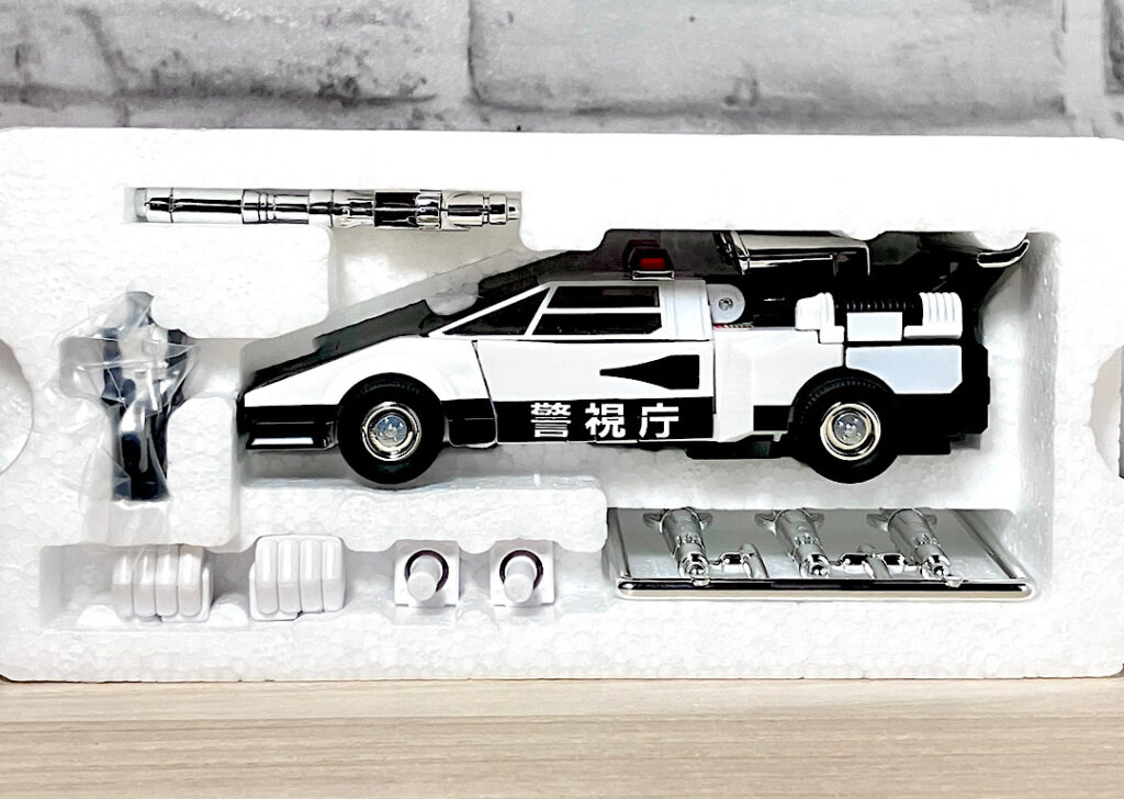 【ビークルモード】パッケージから出してビークルから行きましょう。コルドンはダイアクロン「カウンタックパトカータイプ」が元ネタの先祖返りリカラー。初出は2018年のマスターピースという新しめのキャラで、それがさらにG1仕様に遡ってリリースされるというまさに仮想復刻の極みみたいなアイテムです。たぶんダイアクロンのカウンタックパトカータイプとしても初復刻だと思うので、そういう意味でも価値ある商品ではないでしょうか。