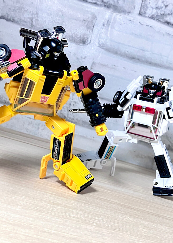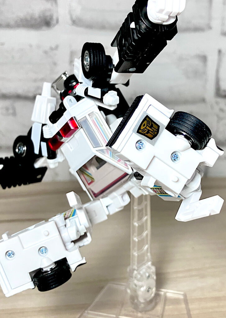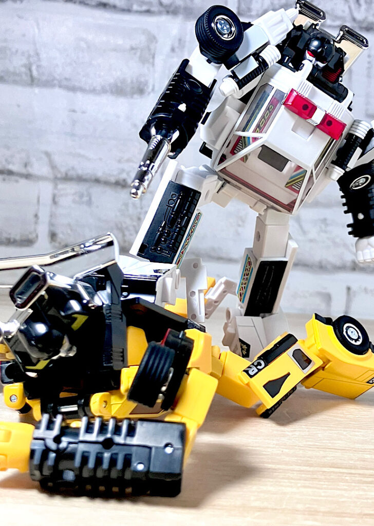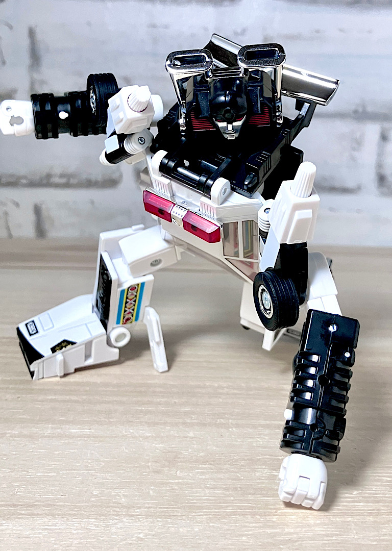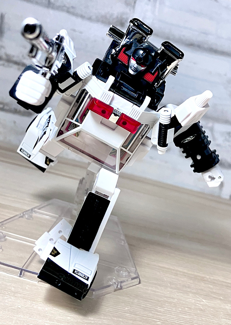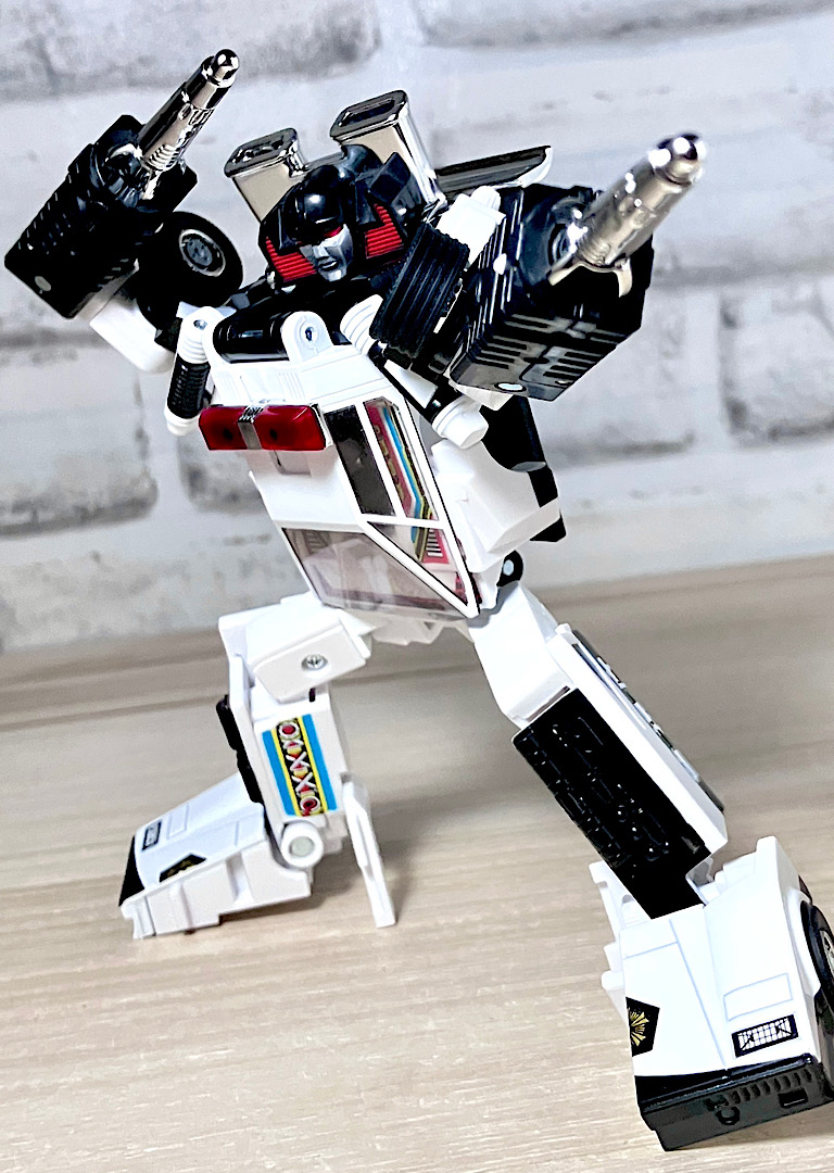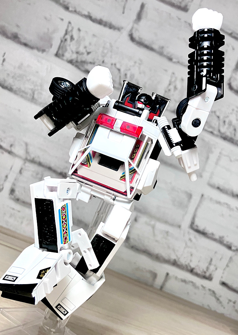 【ビークルモード】パッケージから出してビークルから行きましょう。コルドンはダイアクロン「カウンタックパトカータイプ」が元ネタの先祖返りリカラー。初出は2018年のマスターピースという新しめのキャラで、それがさらにG1仕様に遡ってリリースされるというまさに仮想復刻の極みみたいなアイテムです。たぶんダイアクロンのカウンタックパトカータイプとしても初復刻だと思うので、そういう意味でも価値ある商品ではないでしょうか。