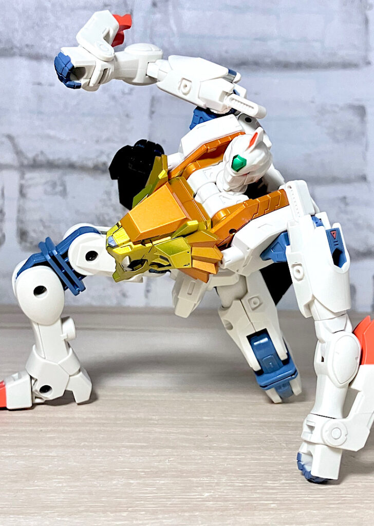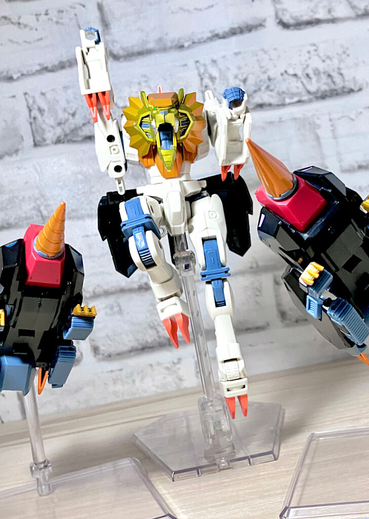 【ジェネシックギャレオン】ライオン型メカに変形。というかこの形態では(ジェネシック)ギャレオンと呼ばれます。勇者シリーズの集大成として王道のモチーフで、背中にくっついた余剰パーツもブースターユニットなどに見えるので問題なし。すらっとしたスタイルもカッコいいです。ガイガーのスタイルがそもそもギャレオンから逆算されたようなバランスなんですよね。