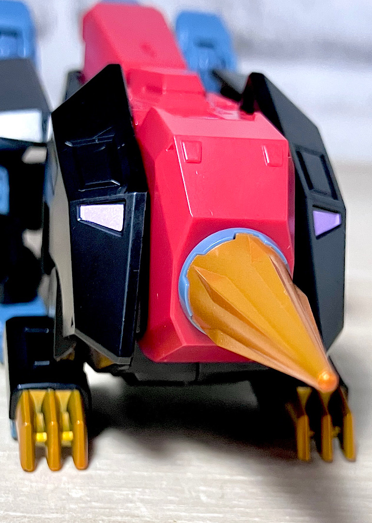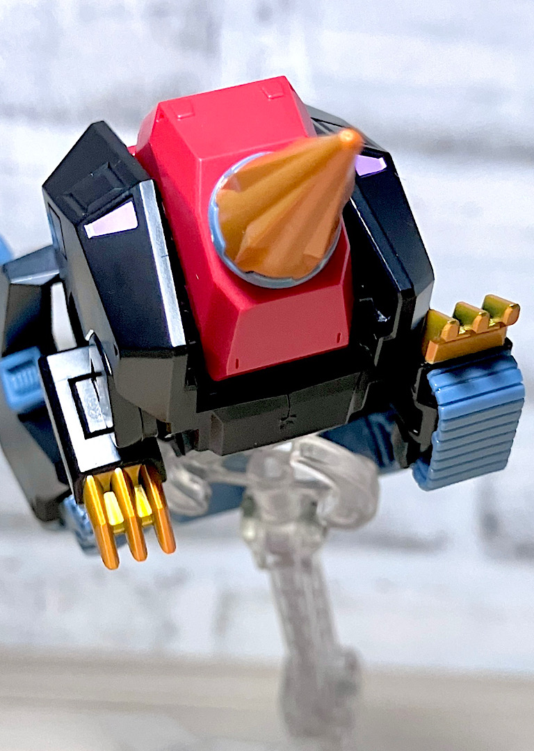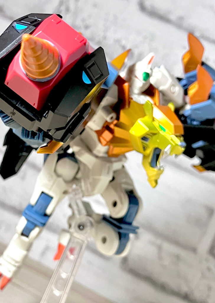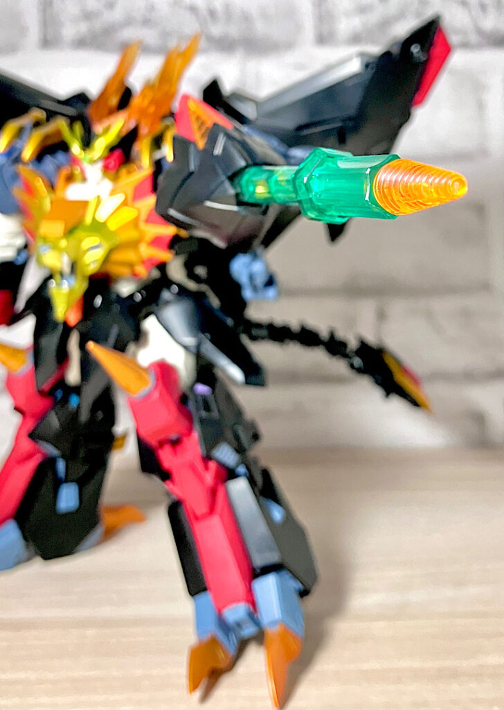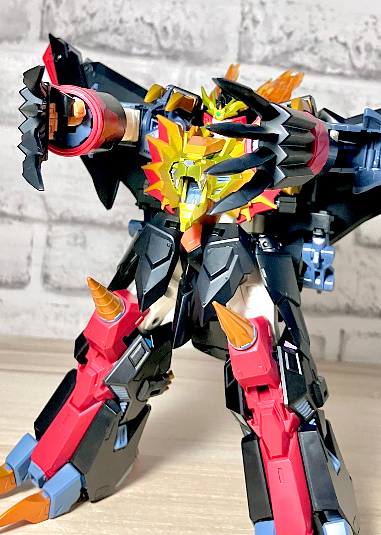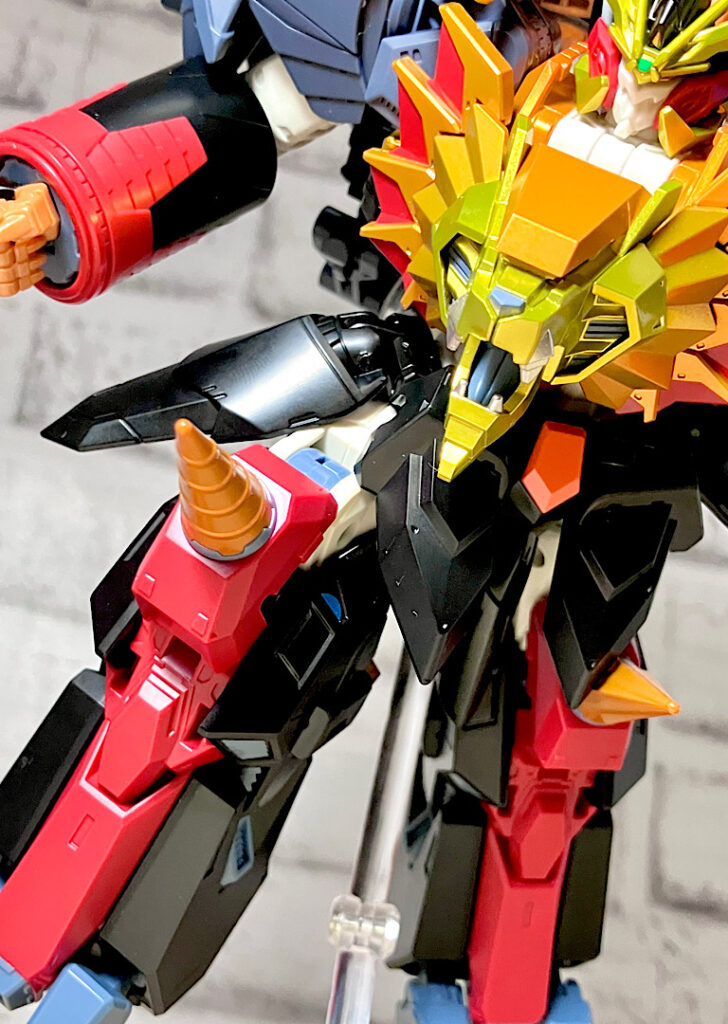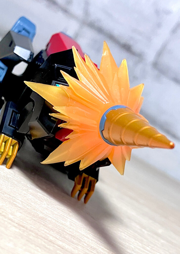 【アップ】というわけで頭部は再現しきれていない部分があるものの、色分けも頑張ってますし、トゲトゲのこまかさもギリギリ繊細にならないくらいに収まっています。前回のバーンブレイバーンより気を使わないで遊べる感じ。
