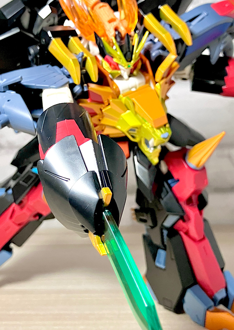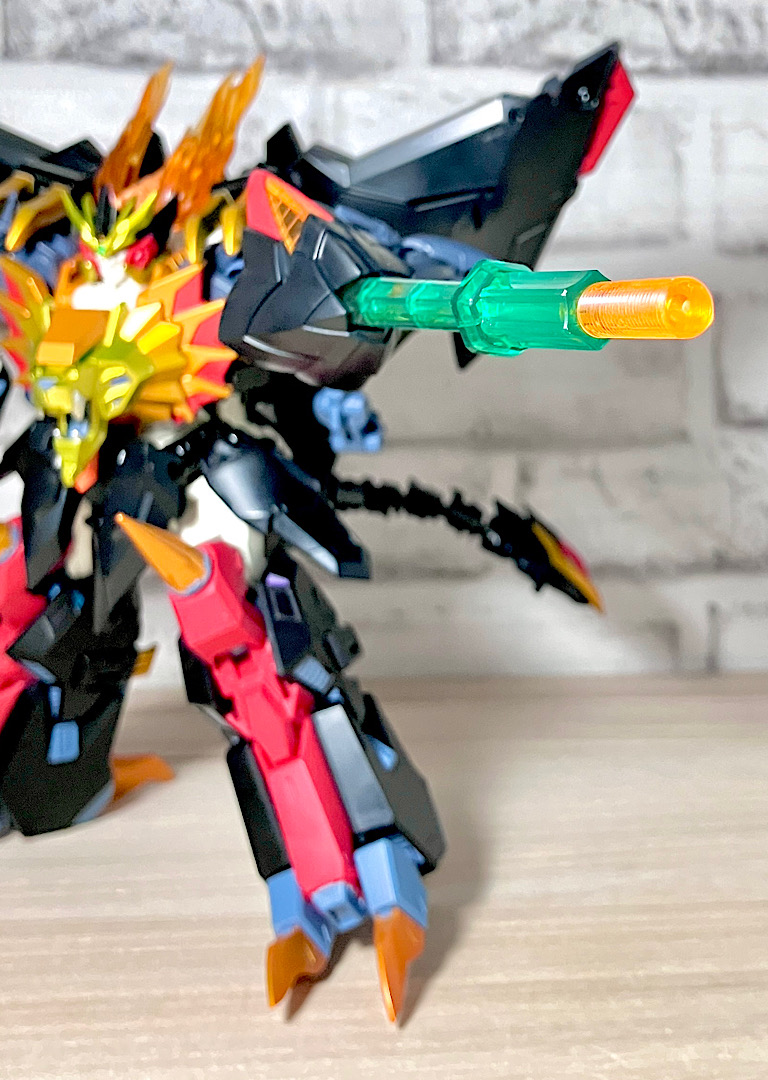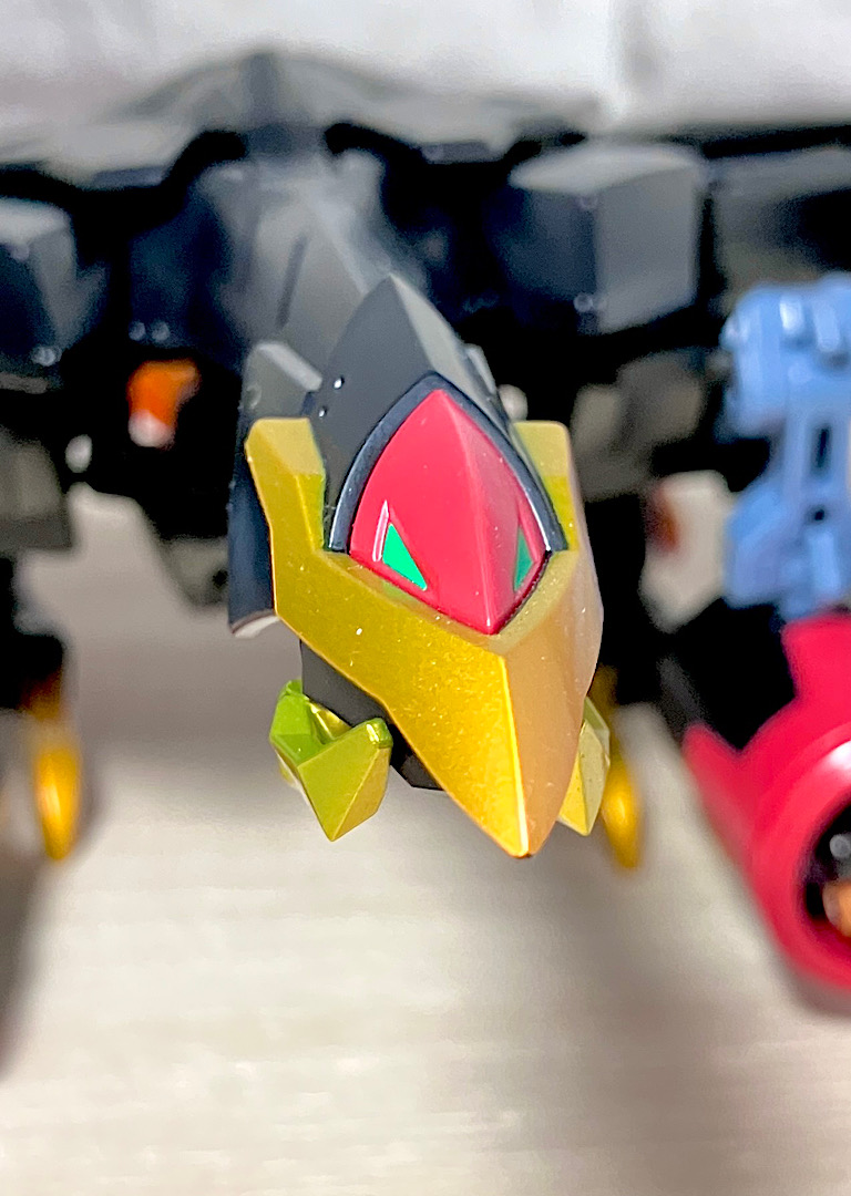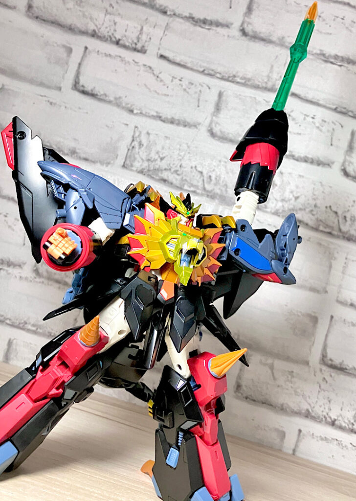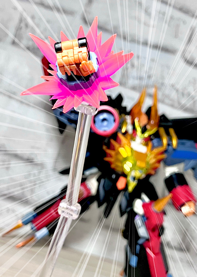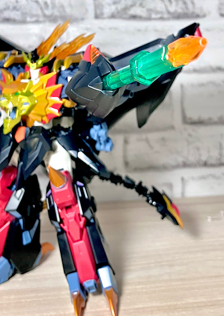 【アップ】というわけで頭部は再現しきれていない部分があるものの、色分けも頑張ってますし、トゲトゲのこまかさもギリギリ繊細にならないくらいに収まっています。前回のバーンブレイバーンより気を使わないで遊べる感じ。