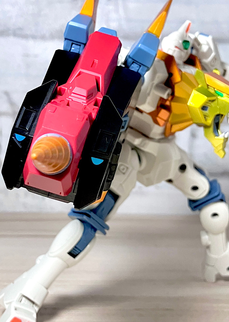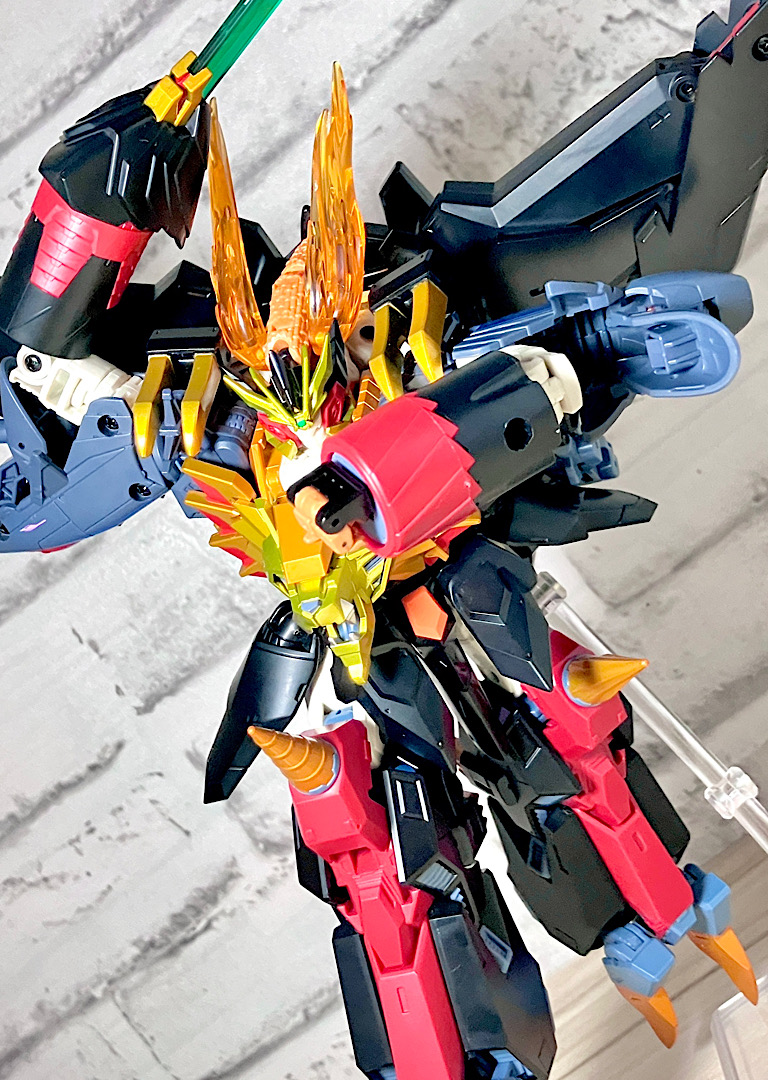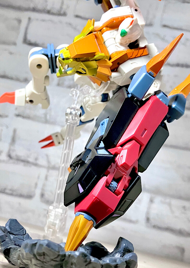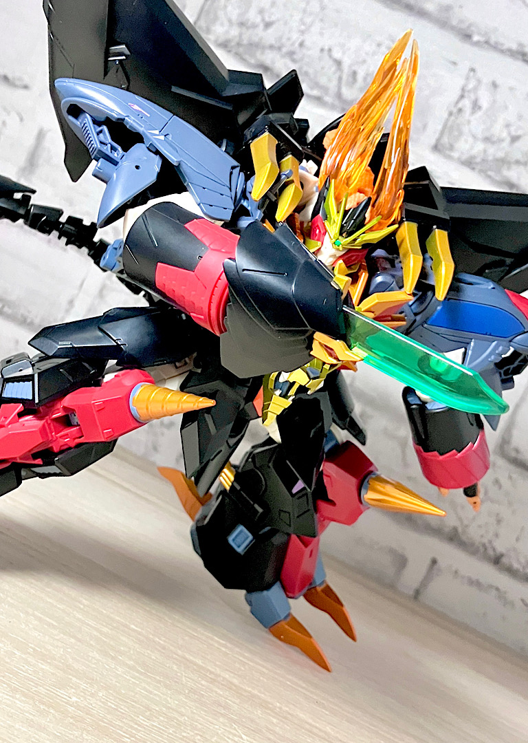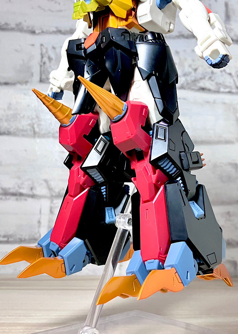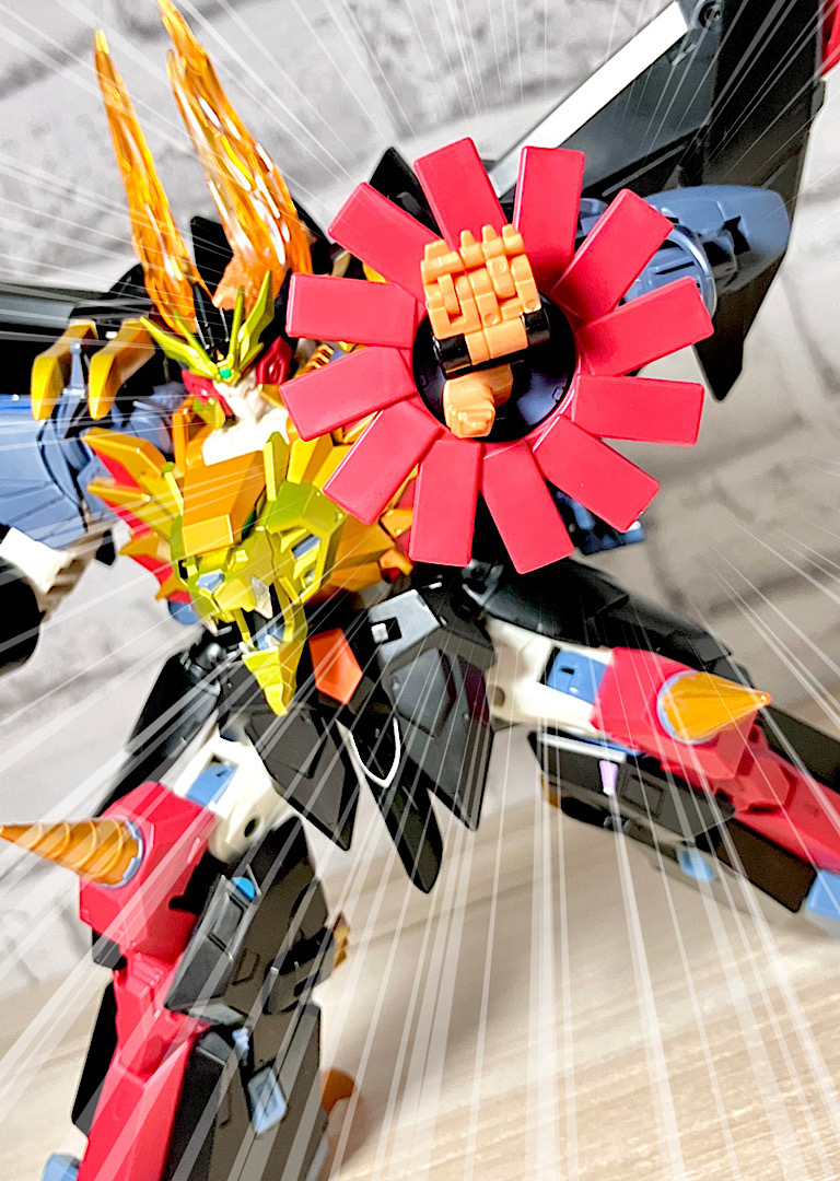 【アップ】というわけで頭部は再現しきれていない部分があるものの、色分けも頑張ってますし、トゲトゲのこまかさもギリギリ繊細にならないくらいに収まっています。前回のバーンブレイバーンより気を使わないで遊べる感じ。