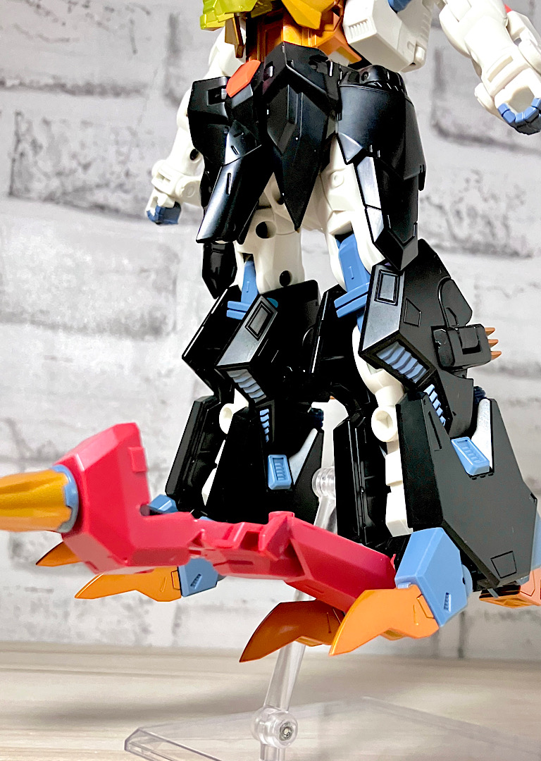 【可動】肩まわりはよく動くように工夫はされておりますが、接続位置がやや下寄りでポーズによっては違和感が。脚部は変形の都合もあってヒザが二重関節になっており、非常に優秀です。