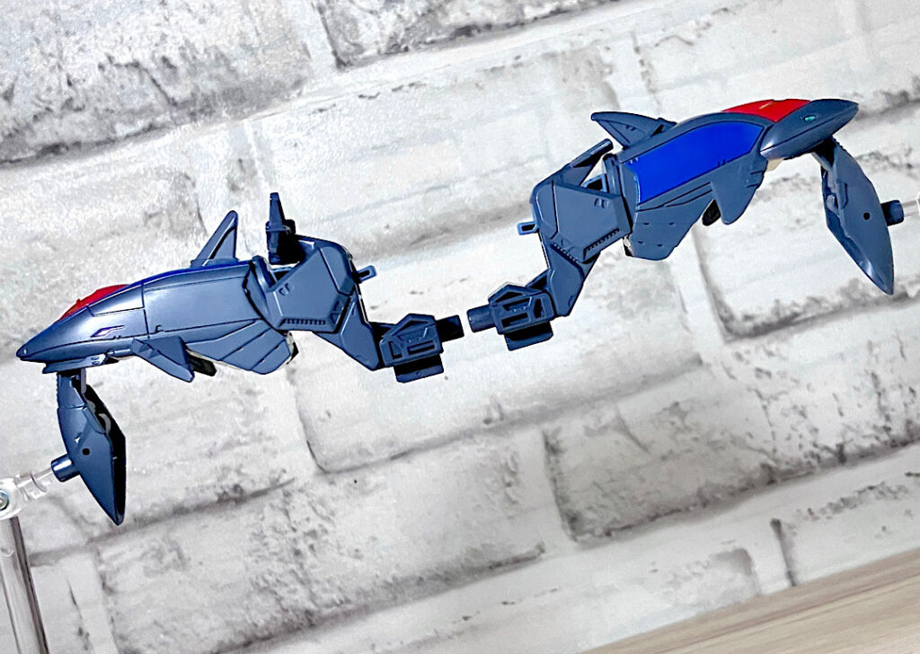 可動はほとんどありませんが、一応オビレを動かすことができます。ちなみにちゃんとサメとイルカでオビレの向きも違っていたりします。