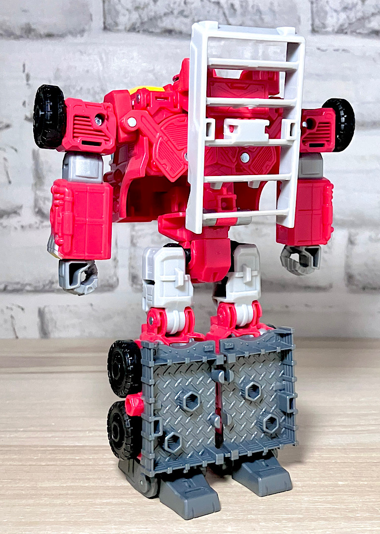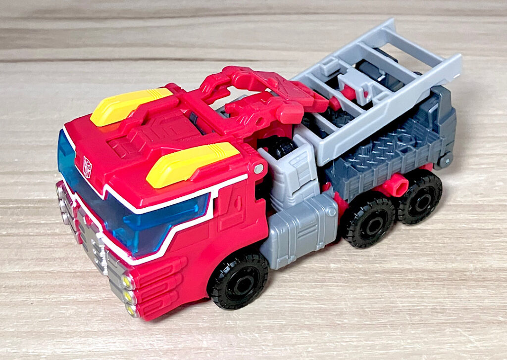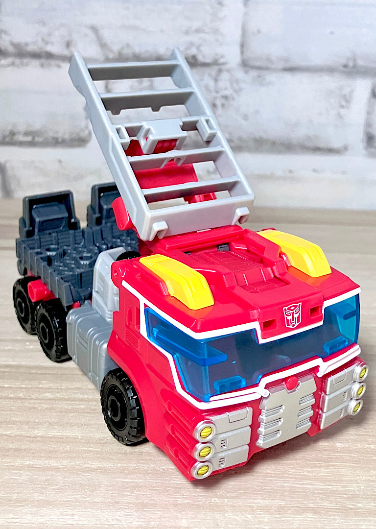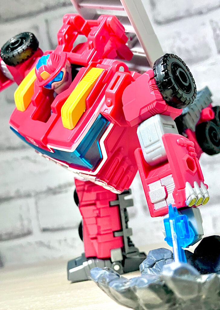 【ビークルモード】消防車に変形。極端にデフォルメされたキッズトイ風味が特徴です。元のバルクヘッドのビークルの形状をうまい具合に活用していてさすが!