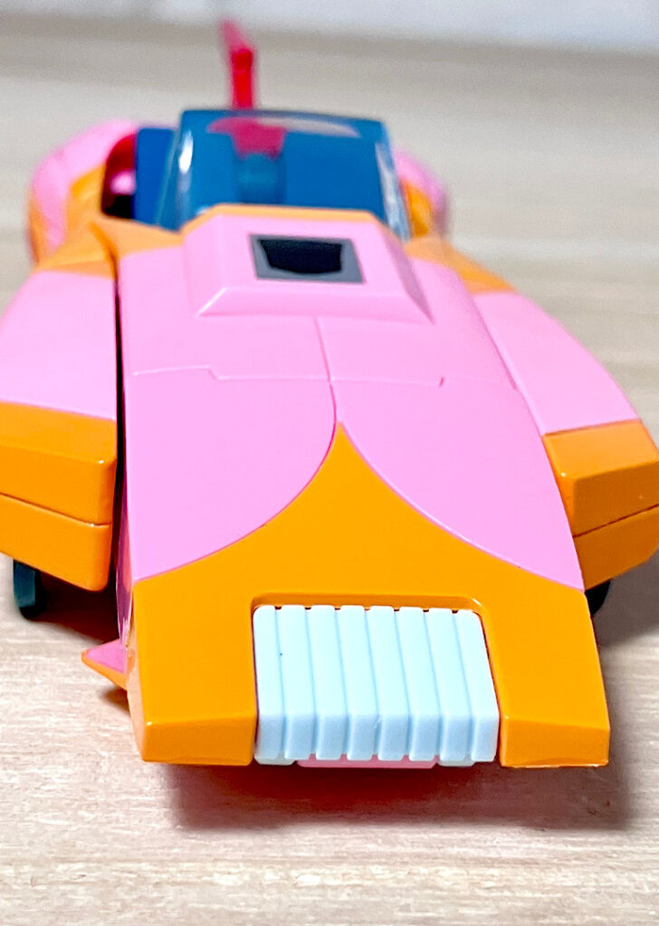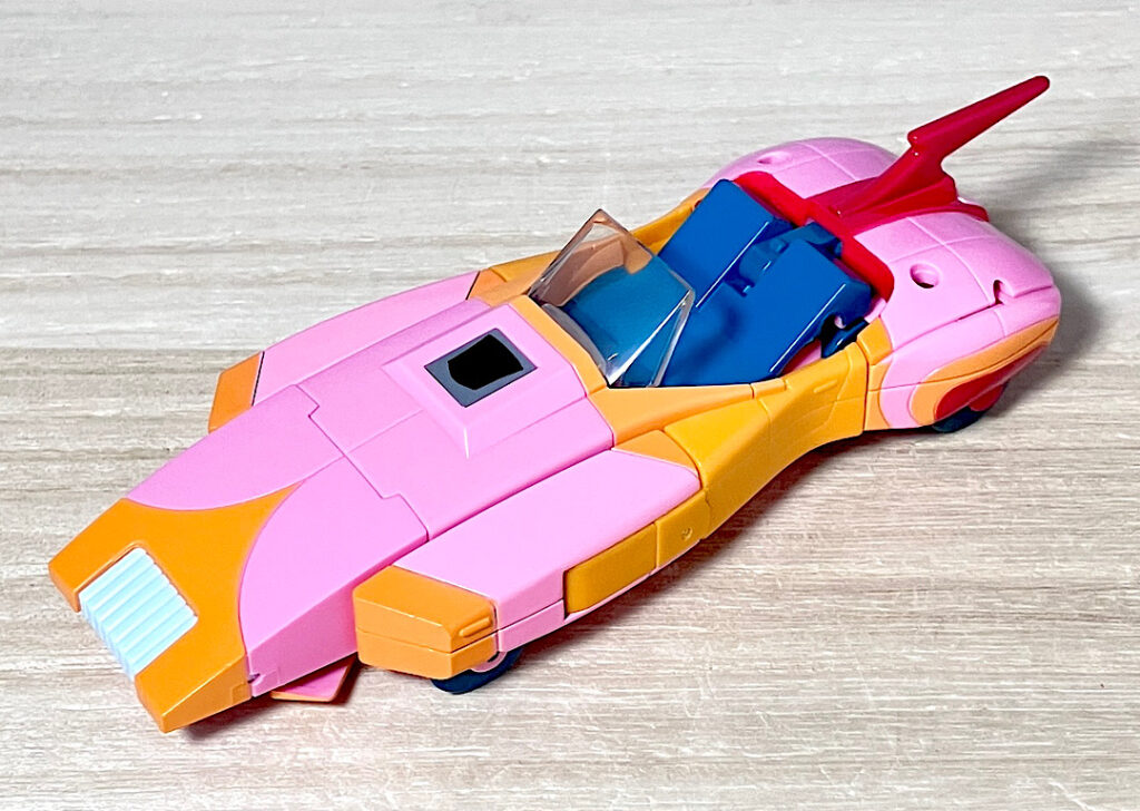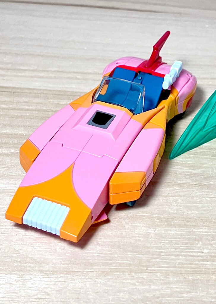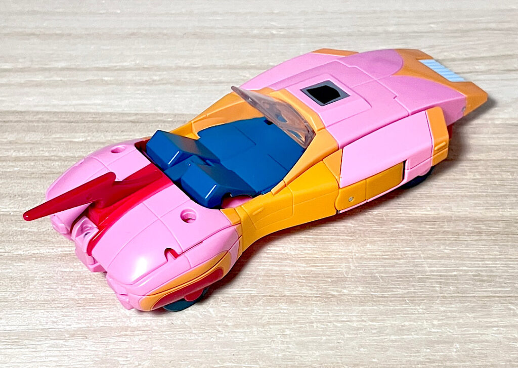 【ビークルモード】パッケージから出してビークルから行きましょう。ビークルも当時試作が作られており、それをベースにしたデザインです。いわゆる当時の「2010」組は、ロボモードは野暮ったくてビークルはそこそこ出来が良いというアイテムが多いんですよね。アーシーについても、下手したら今でも通用しそうなくらいよくできた流線型SFカーです。