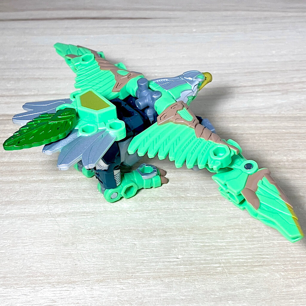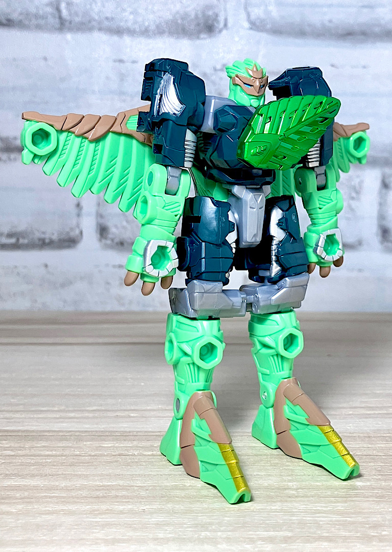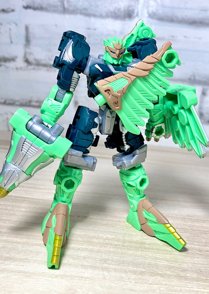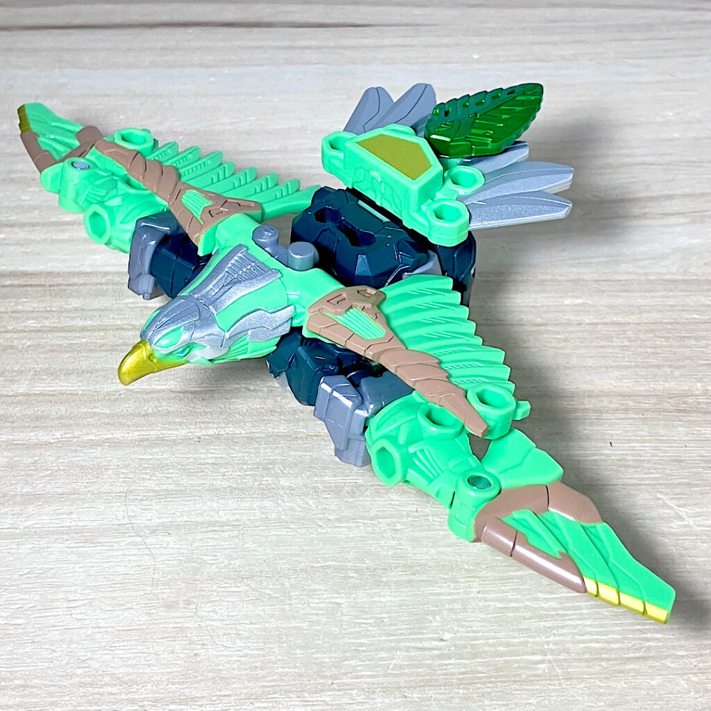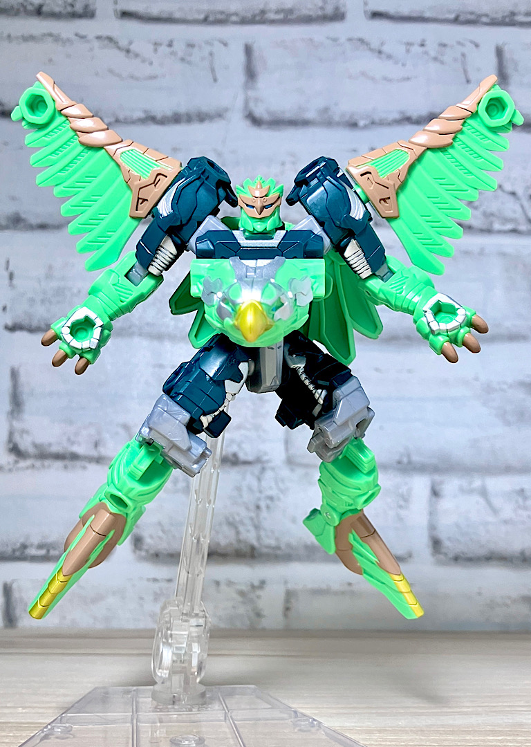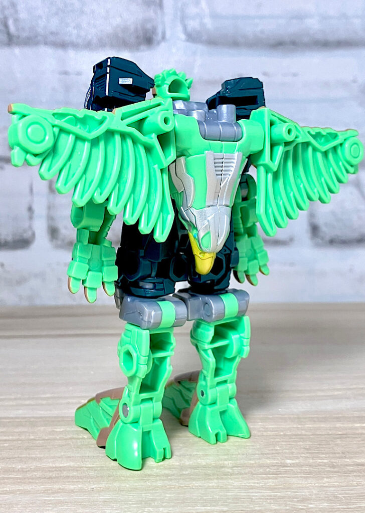【ロボットモード】素体にワシの頭部と翼、そしてエナジーを取り付けてロボットモード完成。待ちに待った動物族の空中キャラで、恐竜族サンダービークと基本的な構造は同じ。爽やかなグリーンが目に優しいです。