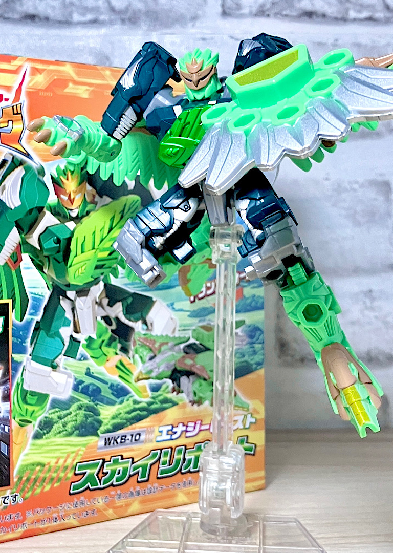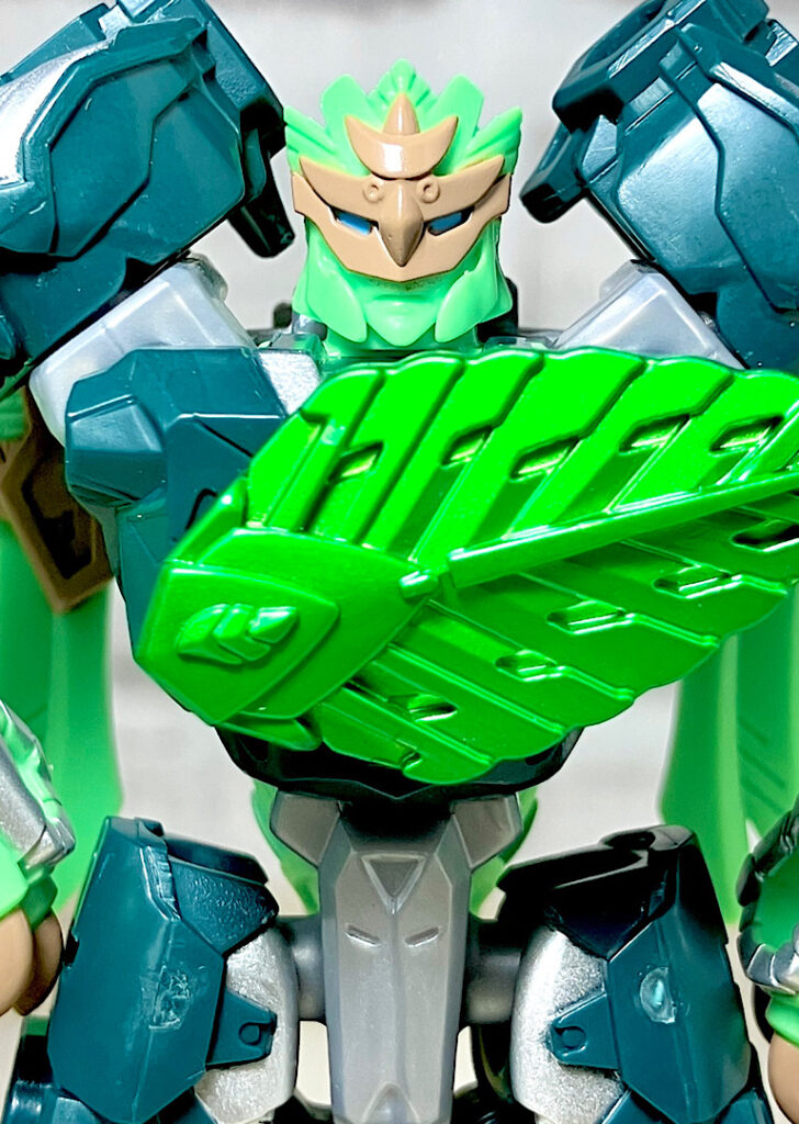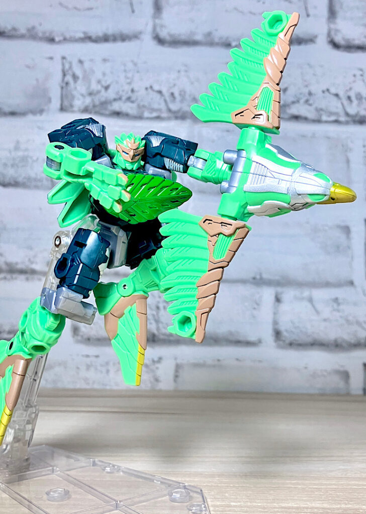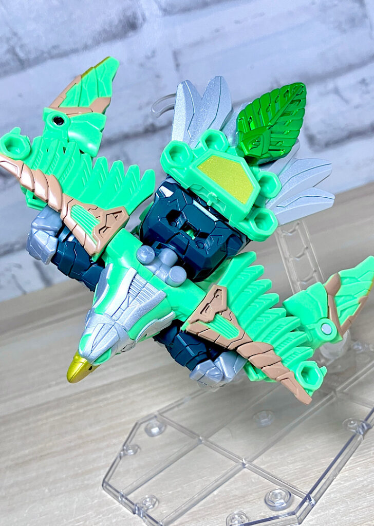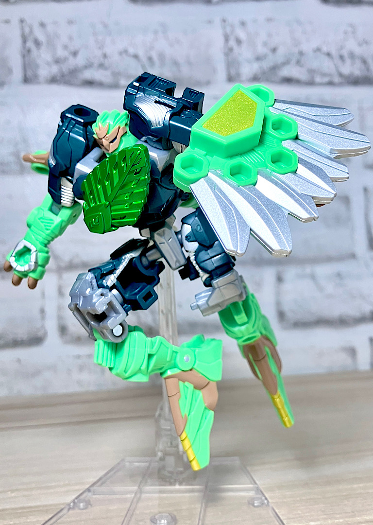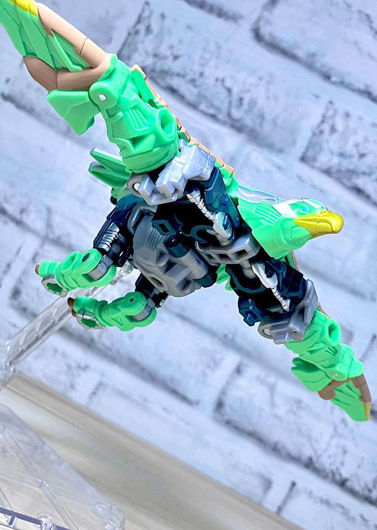 【ロボットモード】素体にワシの頭部と翼、そしてエナジーを取り付けてロボットモード完成。待ちに待った動物族の空中キャラで、恐竜族サンダービークと基本的な構造は同じ。爽やかなグリーンが目に優しいです。