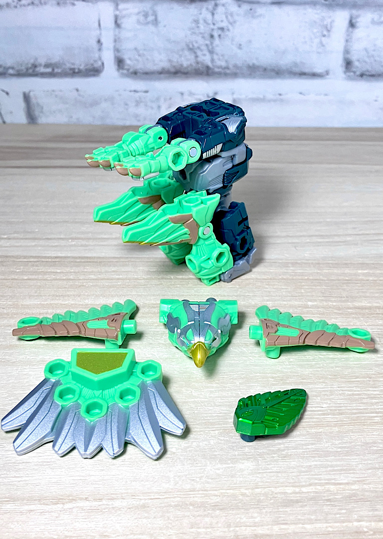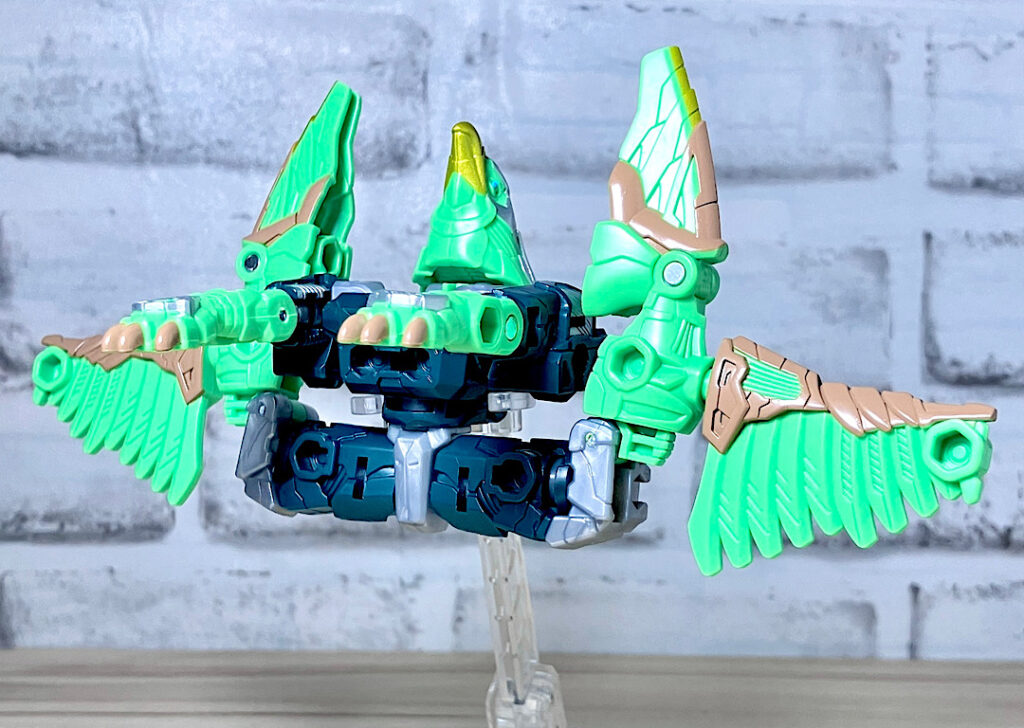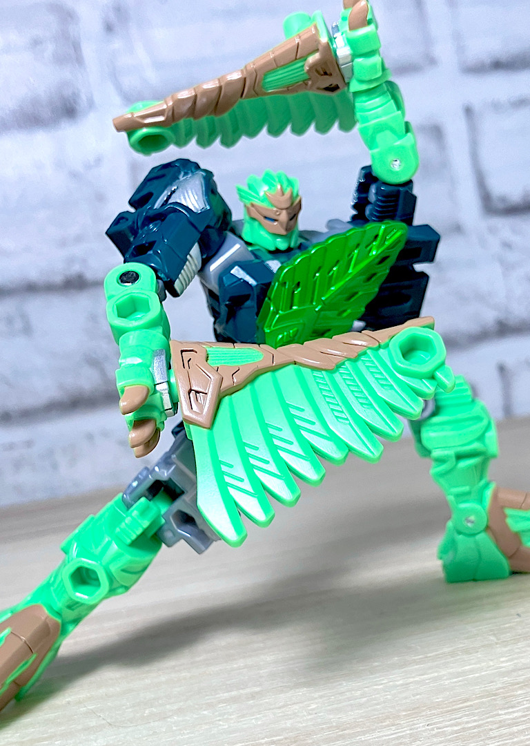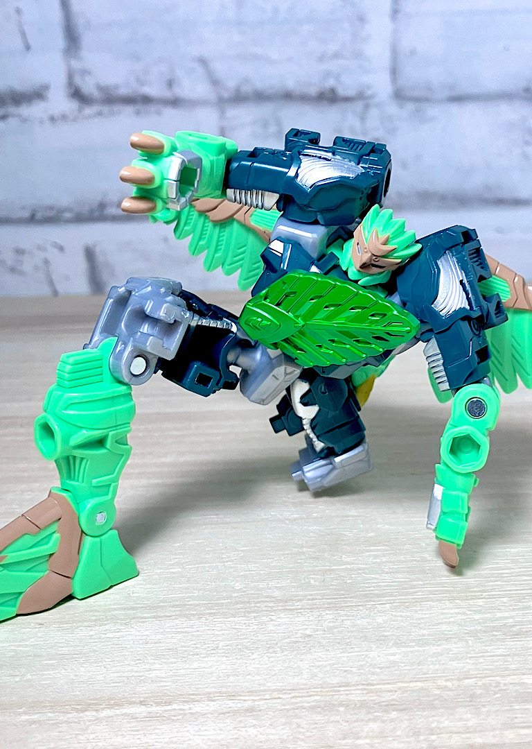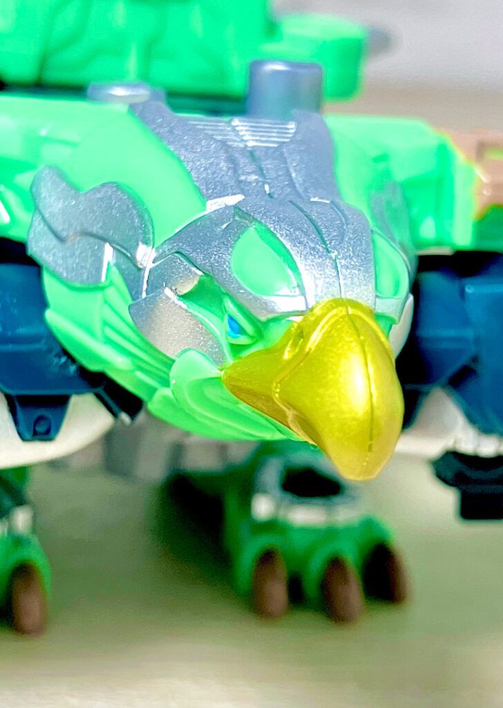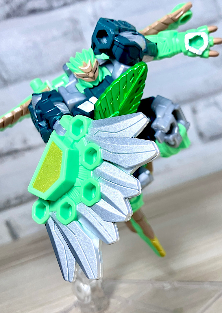 【ロボットモード】素体にワシの頭部と翼、そしてエナジーを取り付けてロボットモード完成。待ちに待った動物族の空中キャラで、恐竜族サンダービークと基本的な構造は同じ。爽やかなグリーンが目に優しいです。