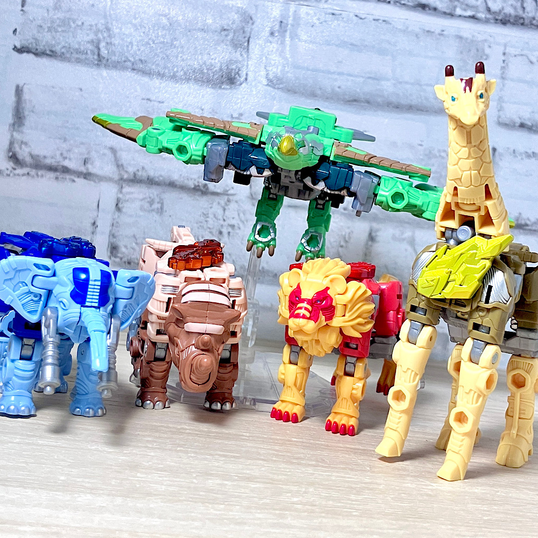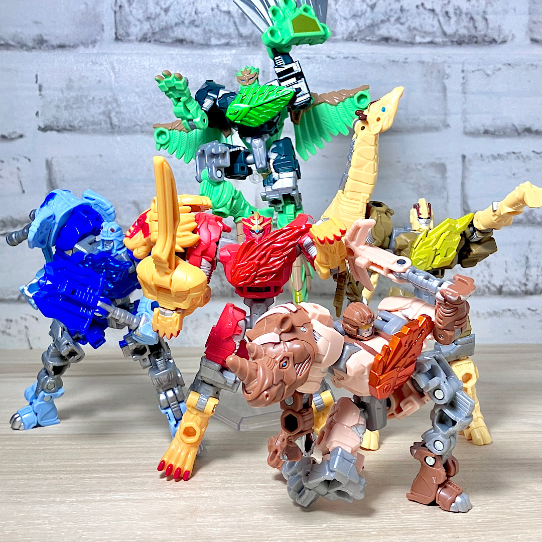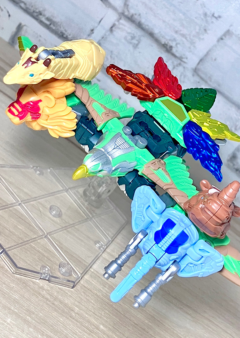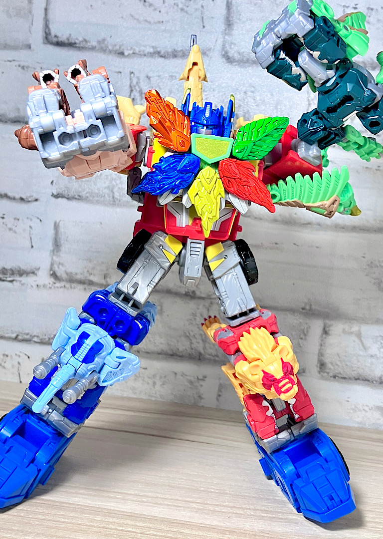 【フロント&リア】というわけで、動物族の6体合体もついに完成です。カラフルな見た目とごちゃごちゃくっついている感が男児心をくすぐる、これぞオモチャ!!そして何よりもここまで集めてきた達成感と開放感がたまりません。