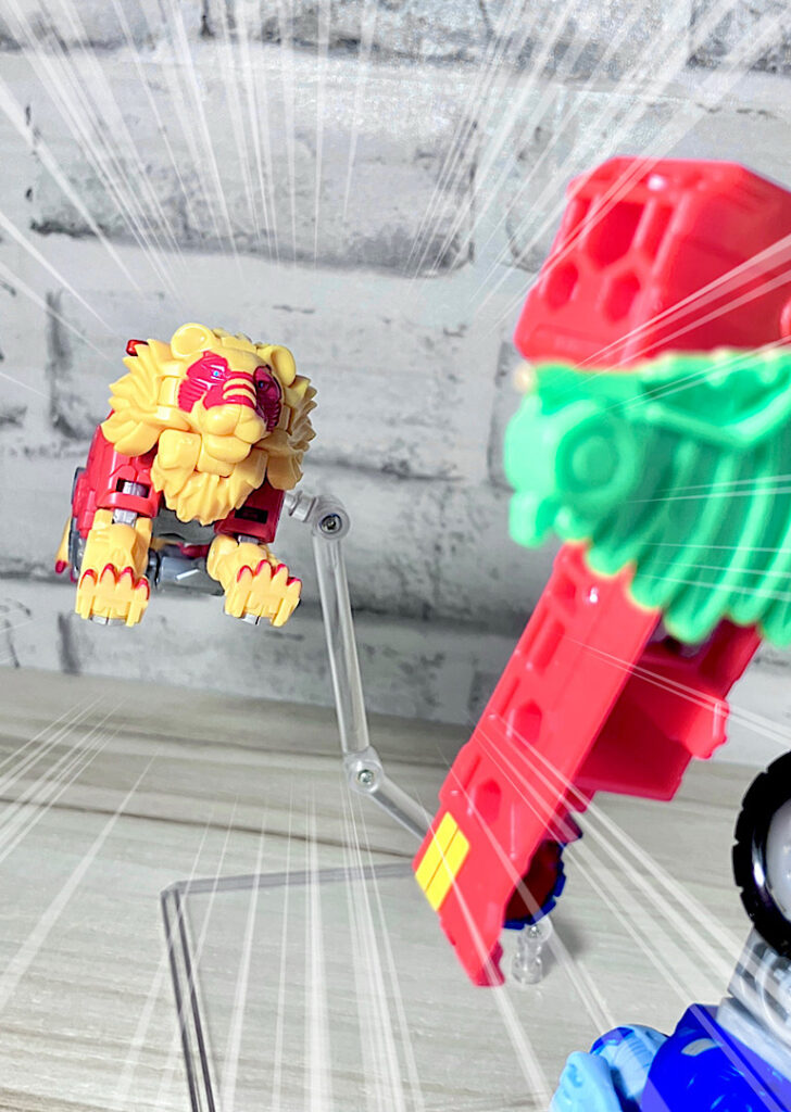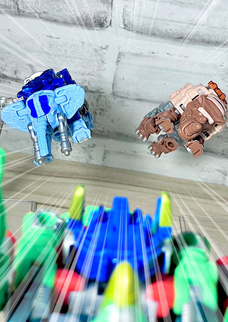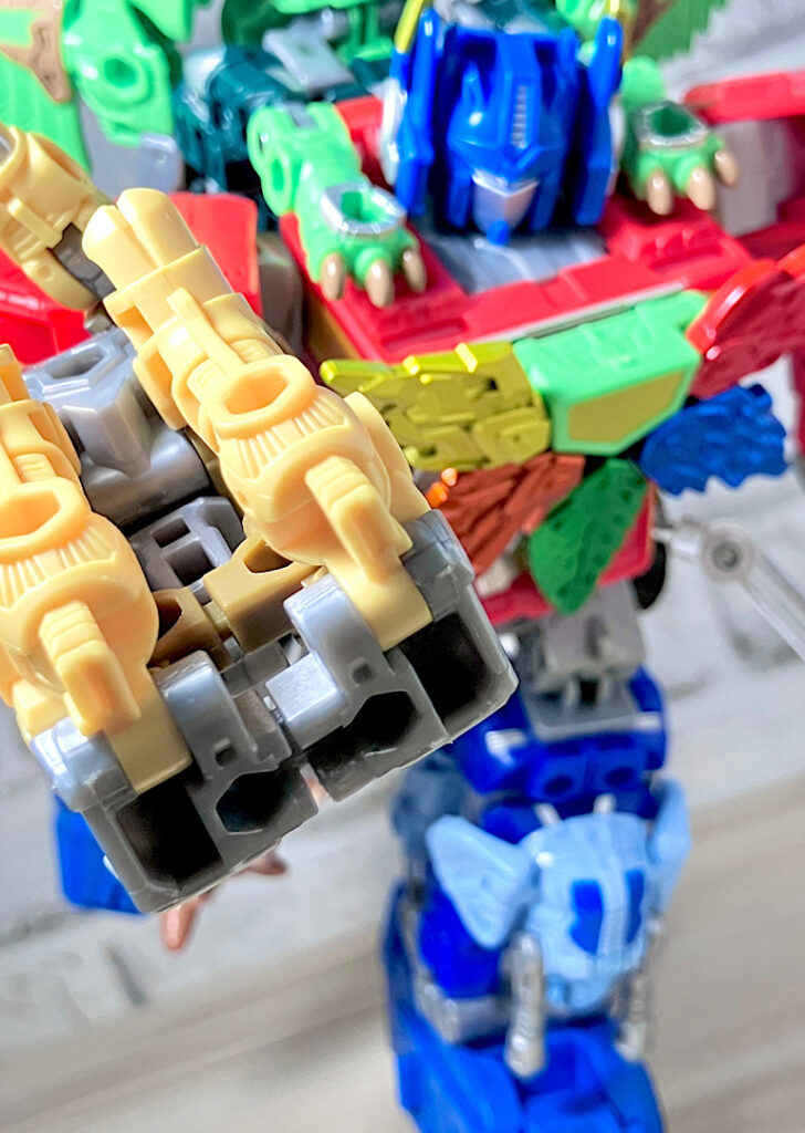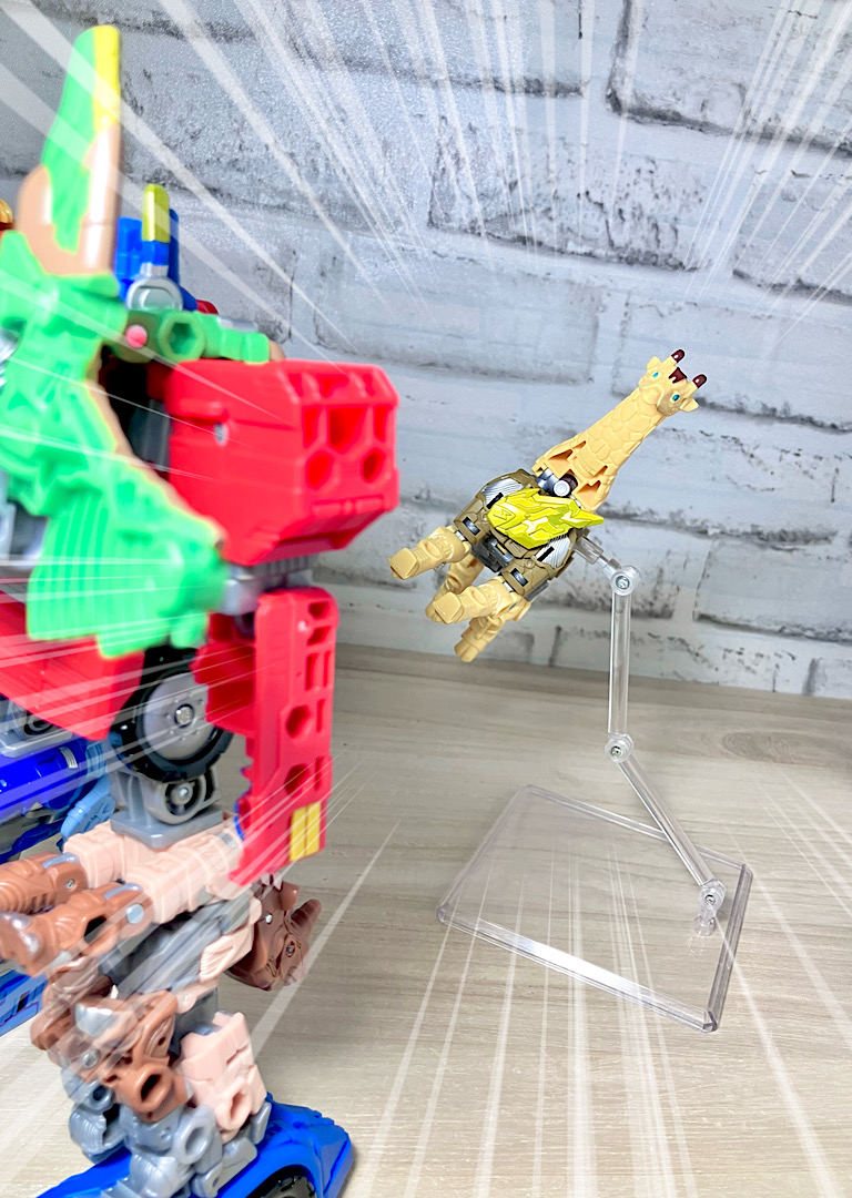 【フロント&リア】というわけで、動物族の6体合体もついに完成です。カラフルな見た目とごちゃごちゃくっついている感が男児心をくすぐる、これぞオモチャ!!そして何よりもここまで集めてきた達成感と開放感がたまりません。