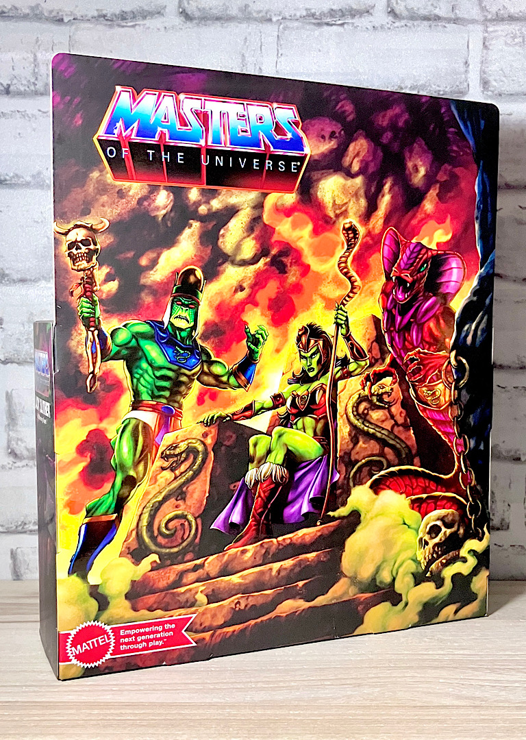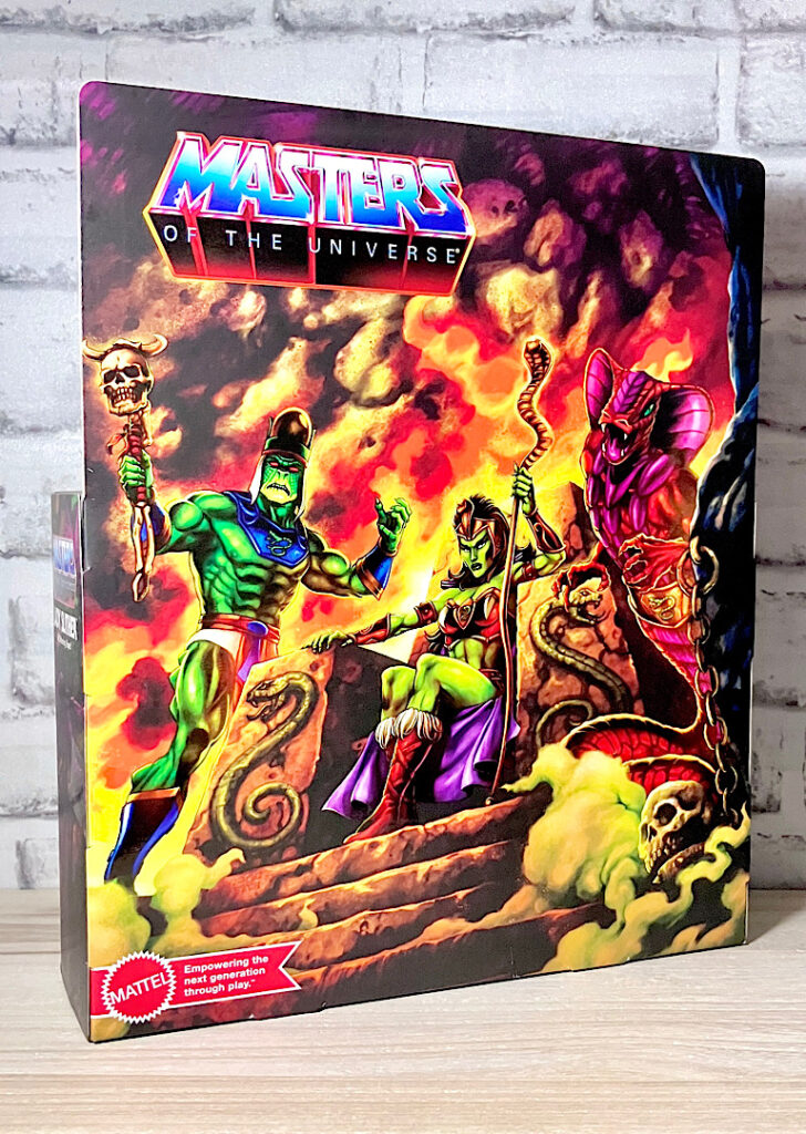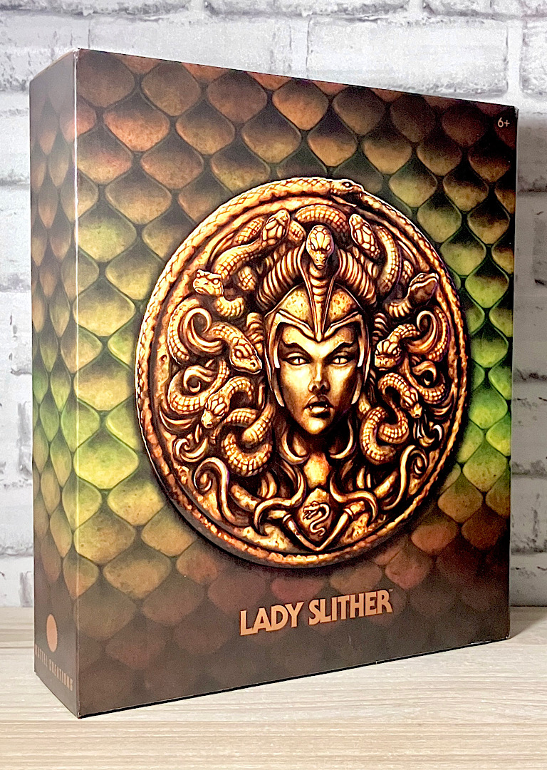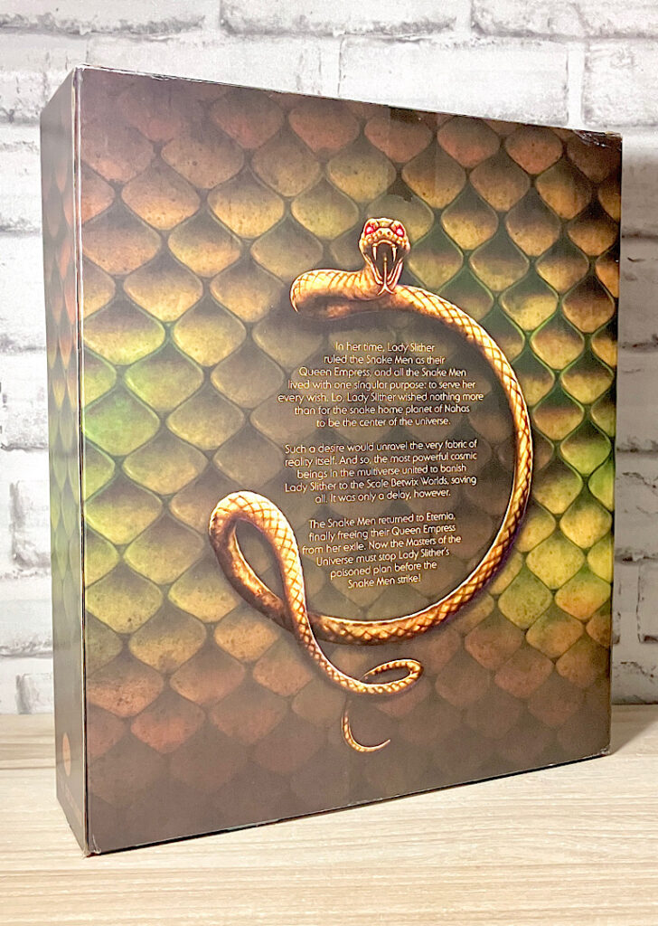 【パッケージ】ヘビのウロコ模様の中央にメデューサを思わせる女怪人が配された豪華ボックス。レディスリザーは「CLASSICS」シリーズのコミックにて2013年に初登場したスネークマンの女性司令官。キングヒス不在のスネークマンを率いて暗躍する姿が描かれファンの注目を集めましたが、残念ながらフィギュア化はされませんでした。そして10年の時を経てオリジンズでついに立体化!マテル直販のクリエイションズ限定です。