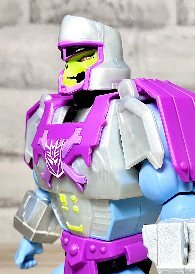 【アップ】メガトロンの特徴的なヘルメットをかぶったスケルター。眉毛?部分もちゃんとあります。あと胸のエンブレムもスケルター×ディセプティコンになってて面白い!