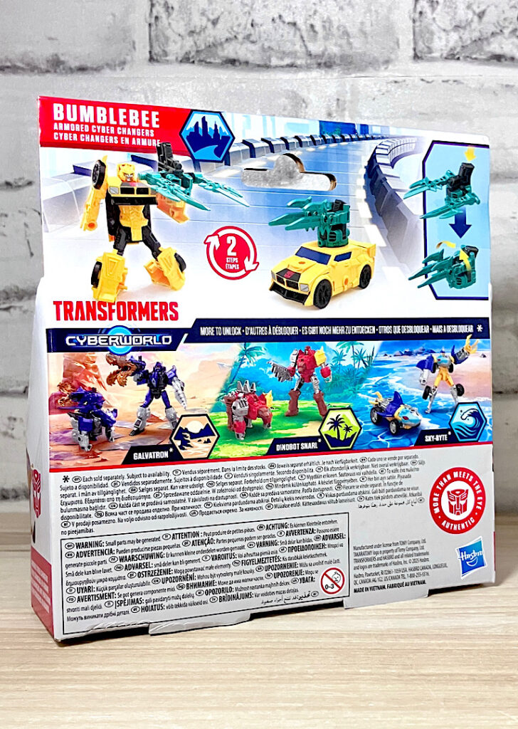 【パッケージ】TF イチの人気者バンブルビーは、まずはアーマードCCにラインナップです。キッズ向けアメトイらしいオープンパッケージ。驚きの「2ステップ」という敷居の低さがアピールされていますね。なおサイバーワールドの戦場は「シティ」。