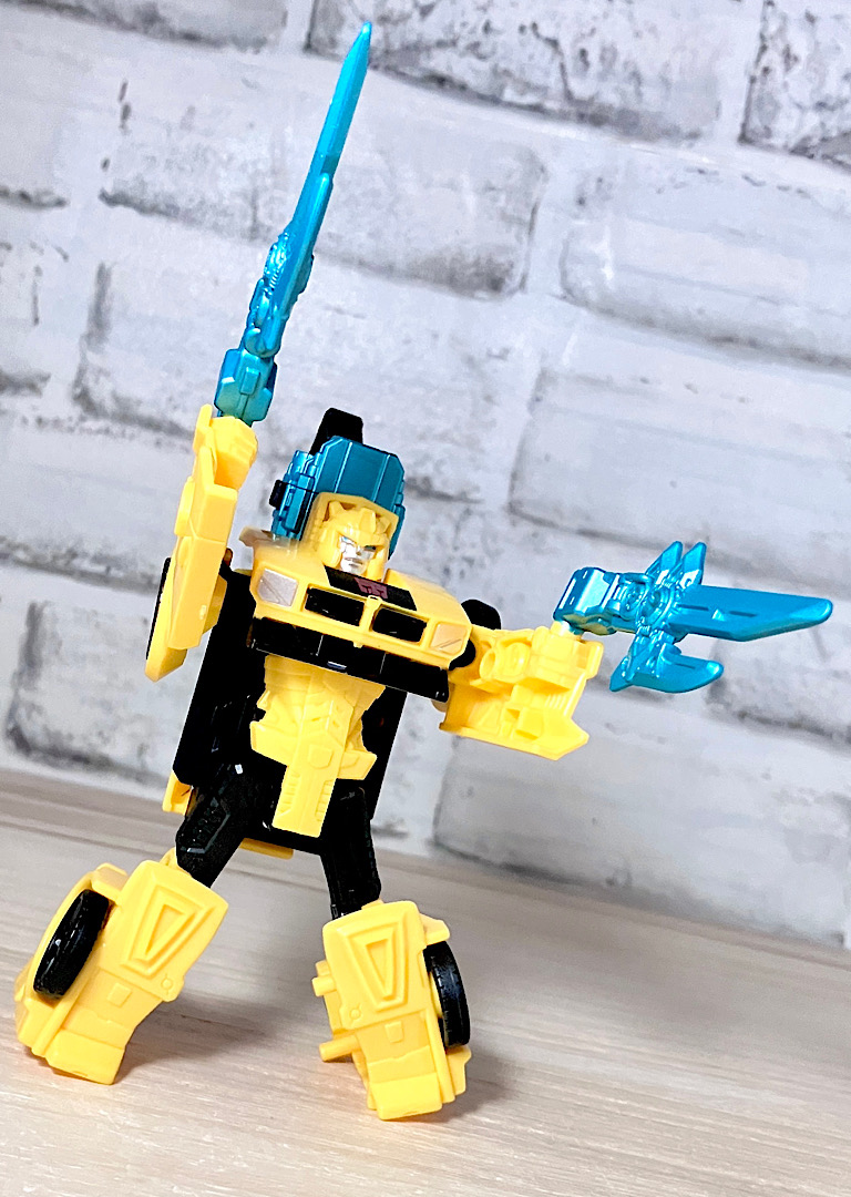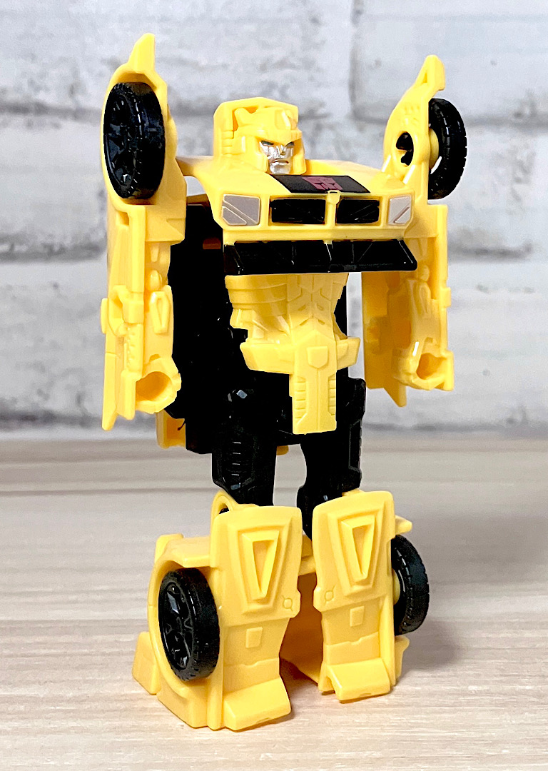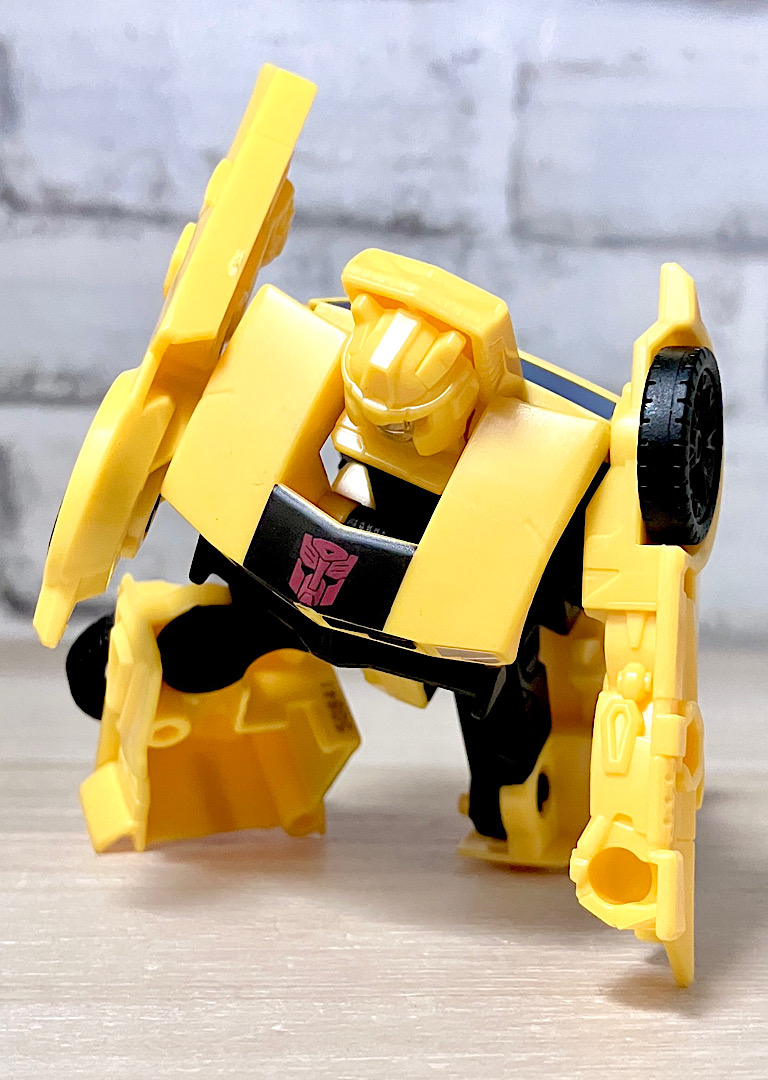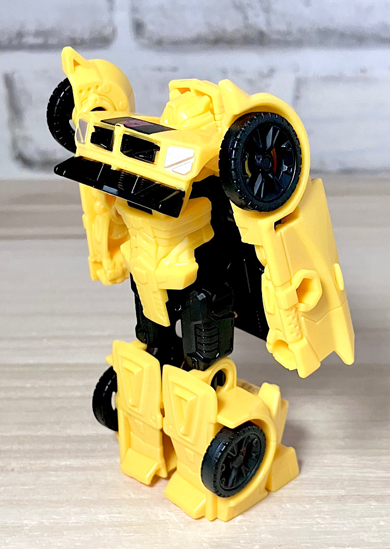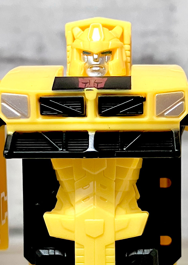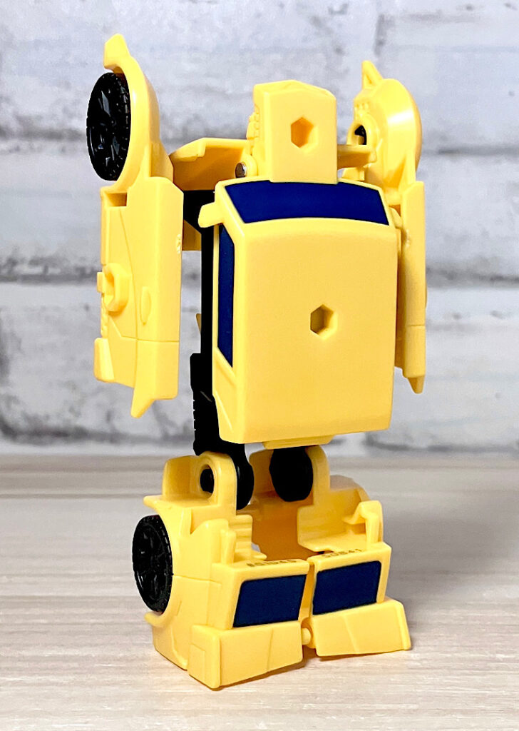 【ロボットモード】ちょっと太ましいコロンとした体型ですが、誰がどう見てもバンブルビーな黄色いカーロボット。頭部はG1型ヘルメットです。