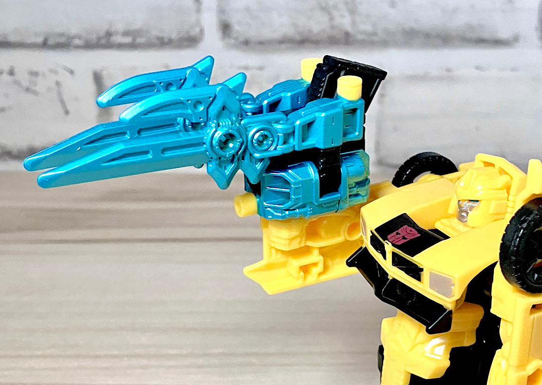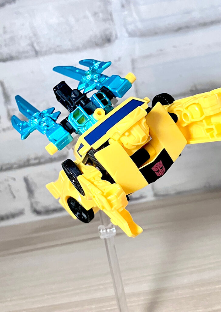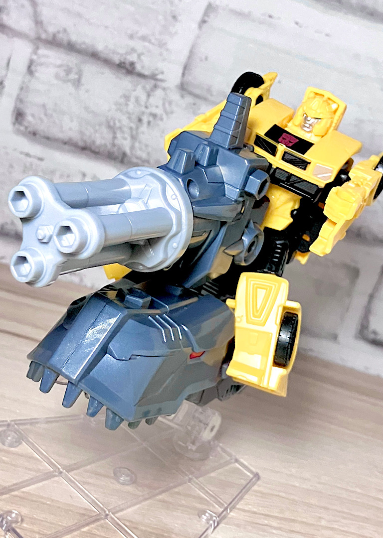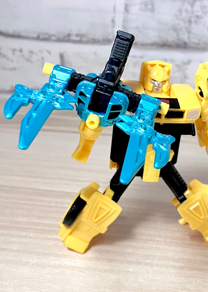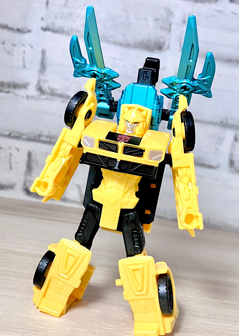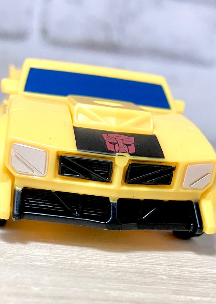 【ロボットモード】ちょっと太ましいコロンとした体型ですが、誰がどう見てもバンブルビーな黄色いカーロボット。頭部はG1型ヘルメットです。