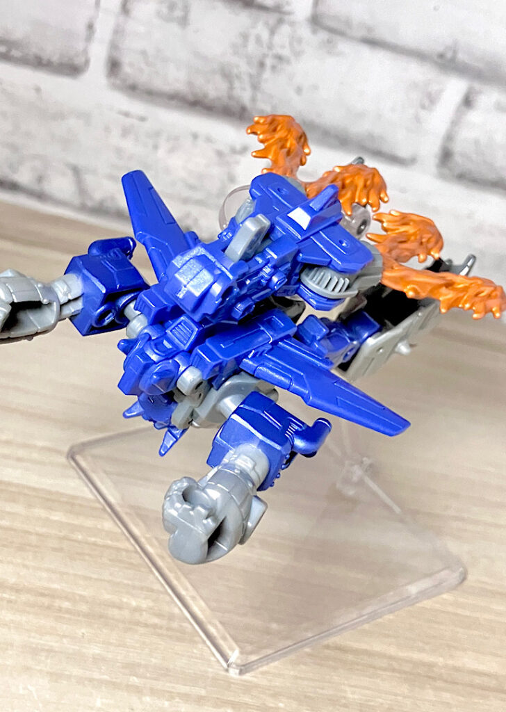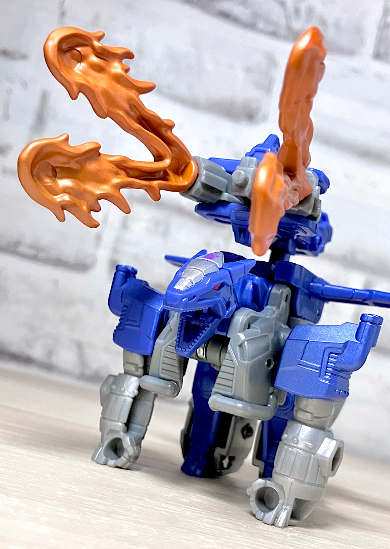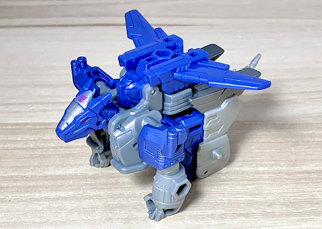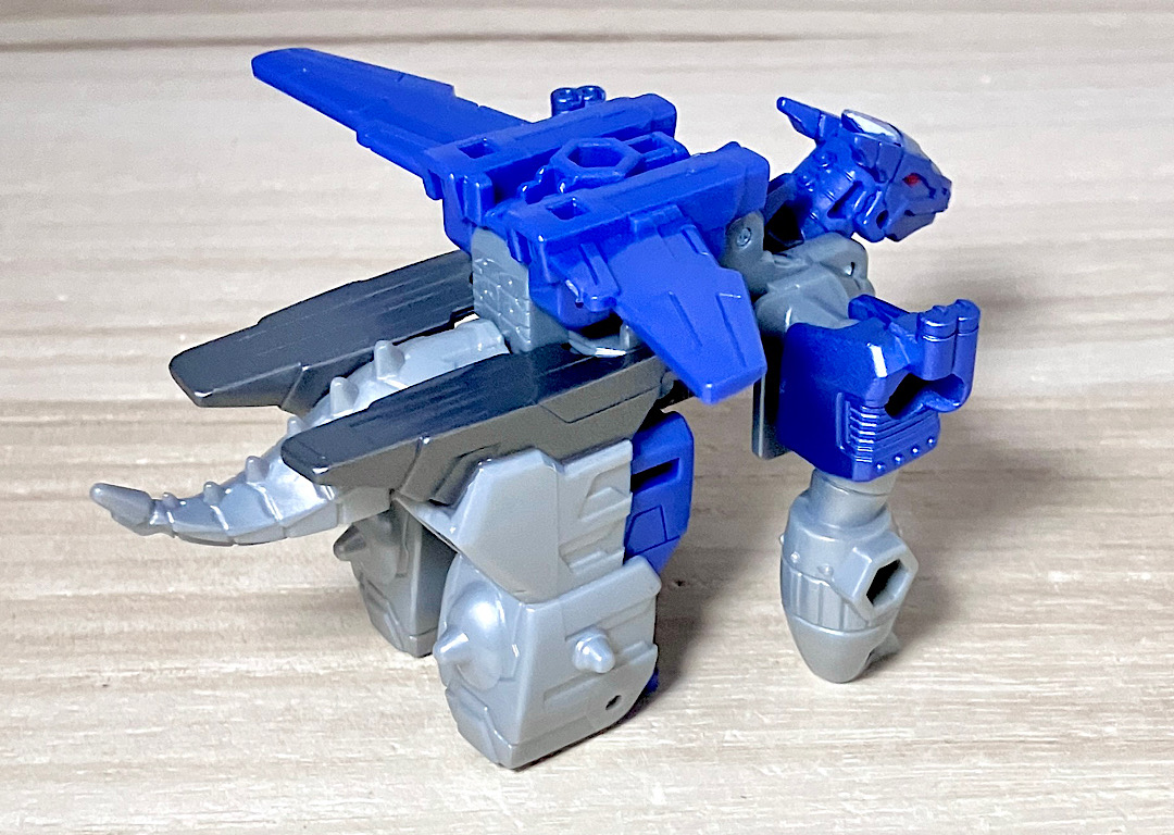 【ビーストモード】ドラゴンに変形。ウイングが付いてちょっとひねったデザインです。ロボの腕がそのまんまなのはキッズ向け簡易アイテムということで多めに見ましょう。ドラゴンのガルバトロンというと、もしかしてビーストウォーズが元ネタ?