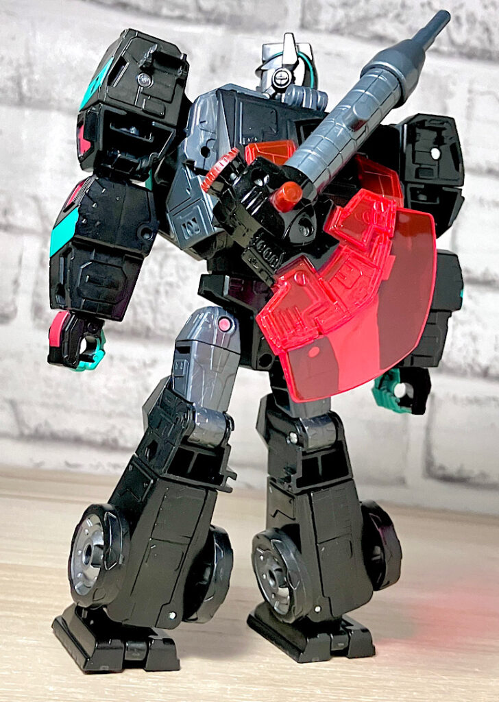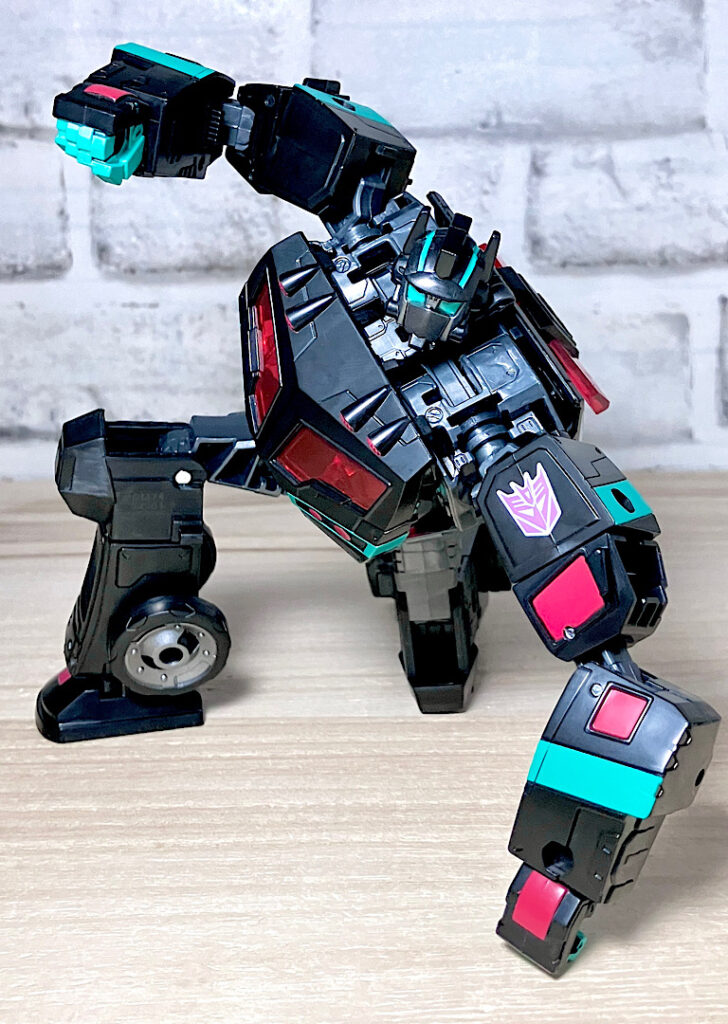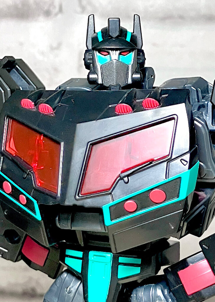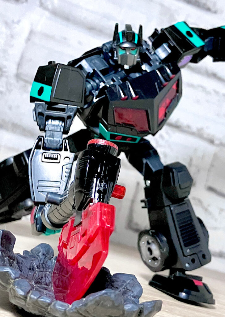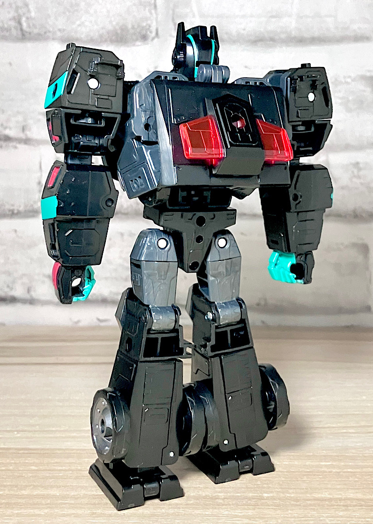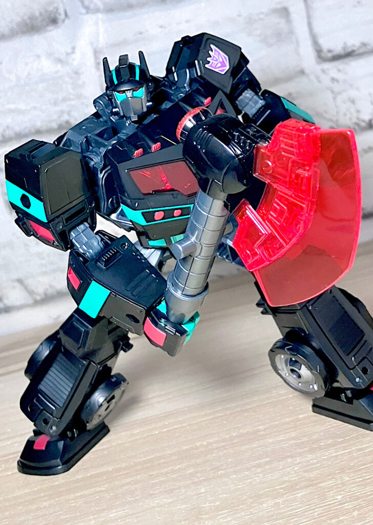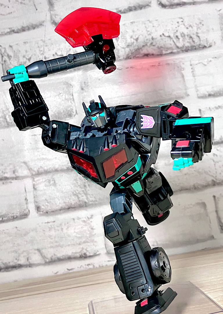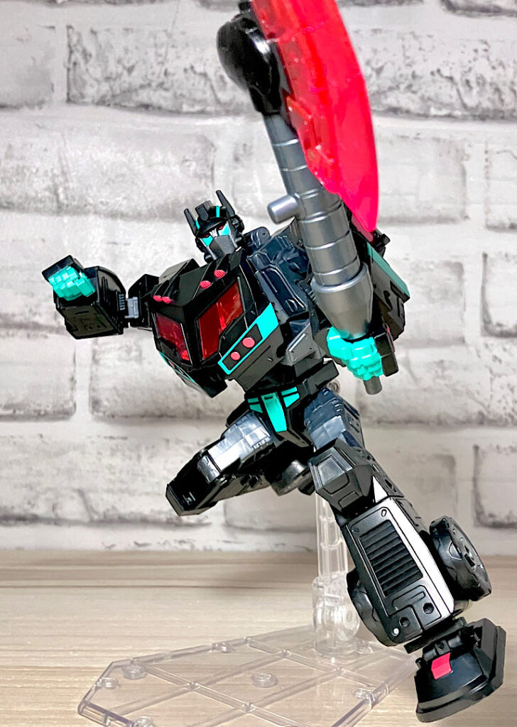 【ロボットモード】アニメイテッドユニバースのネメシスプライム。ディセプティコンによって作られたオプティマスのクローンのようです。レガシーユナイテッド版の順当なリカラーということで、間違いないカッコよさ。赤クリアの窓や若竹色の差し色がやっぱり似合います。