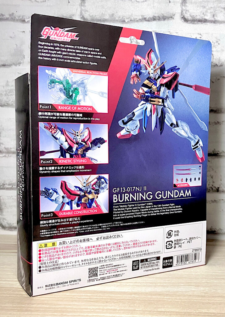 【パッケージ】ガンダムユニバースはワールドワイド展開を狙い、アメトイで標準的な6インチサイズ+過度なギミックやアクセサリを抑制した比較的低価格なコレクションライン。内部フレームを一新したリニューアルスタートWAVE2には、海外でも人気のバーニングガンダムがラインナップ!
