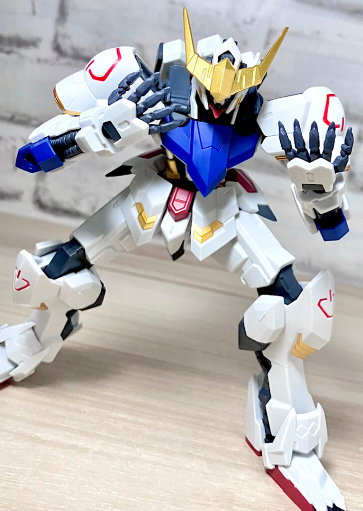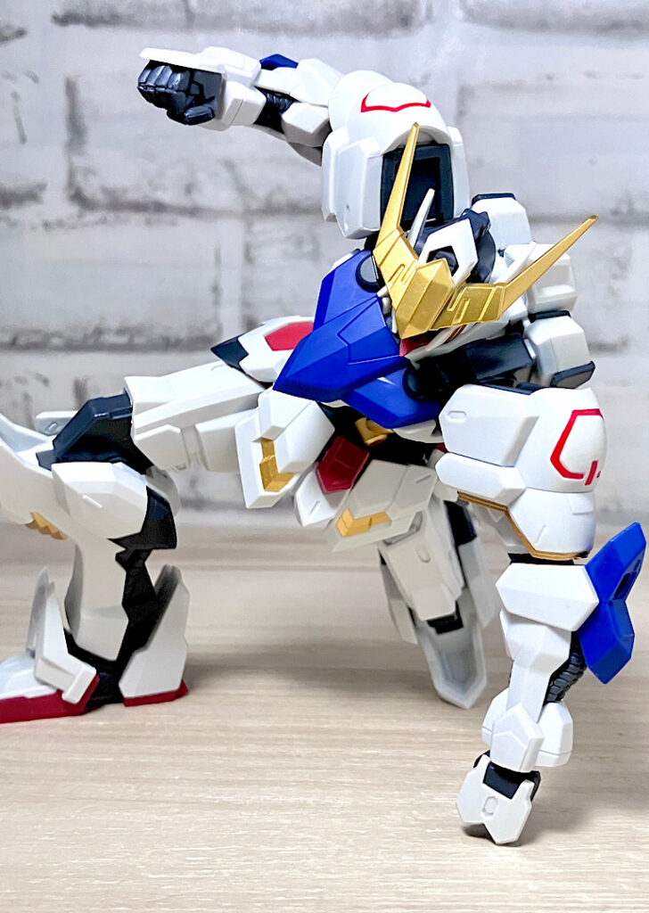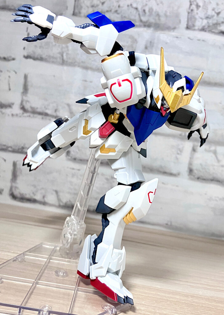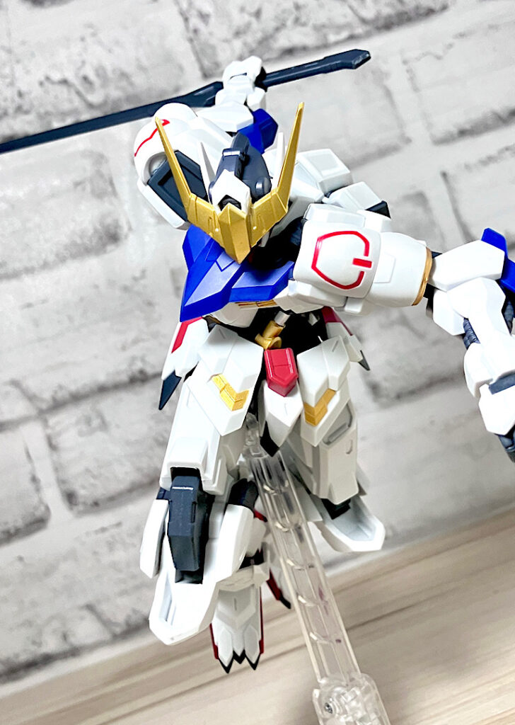 【可動】新型フレームにより素体はグリグリ動きます。バルバトスはそんなに装飾が多くないので腰のパーツポロリは少ないですが、上腕部を包むような肩パーツが腕周りを動かす時に干渉しがちです。