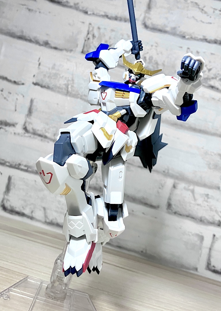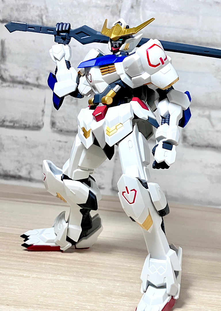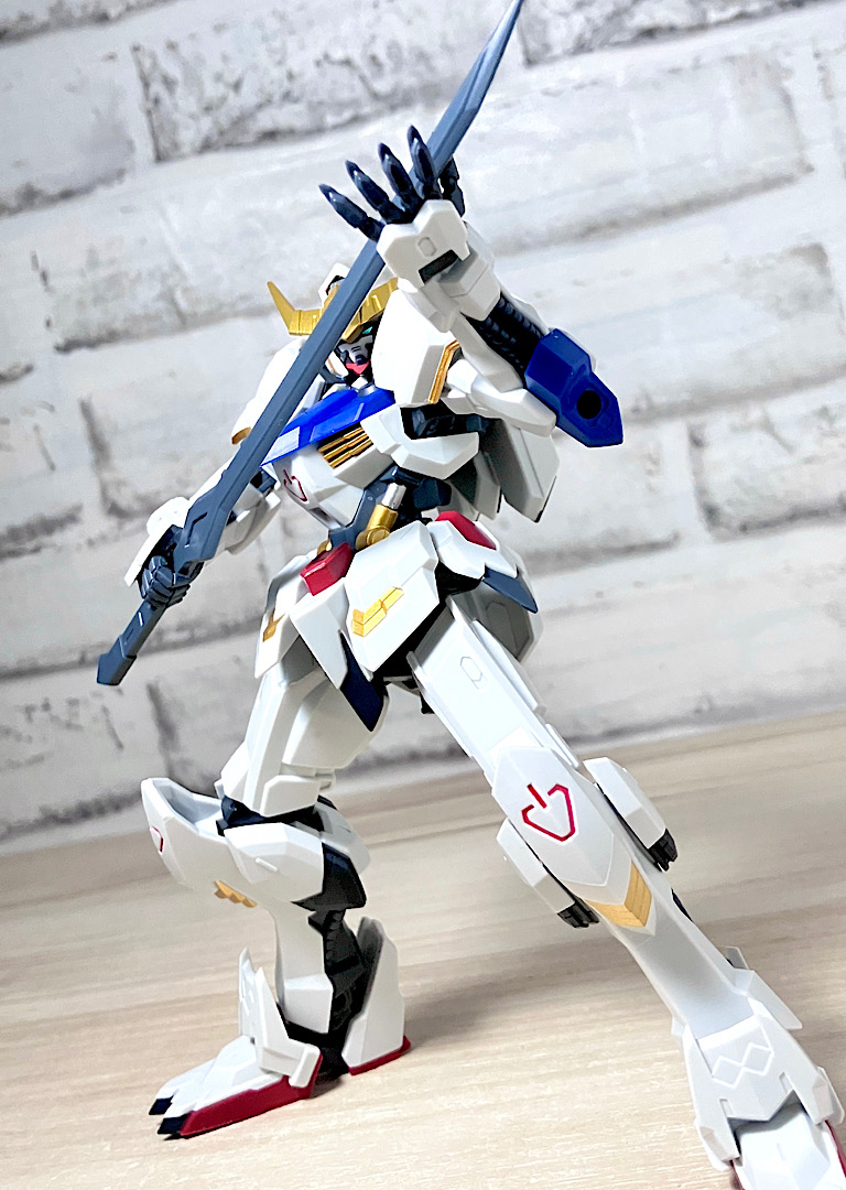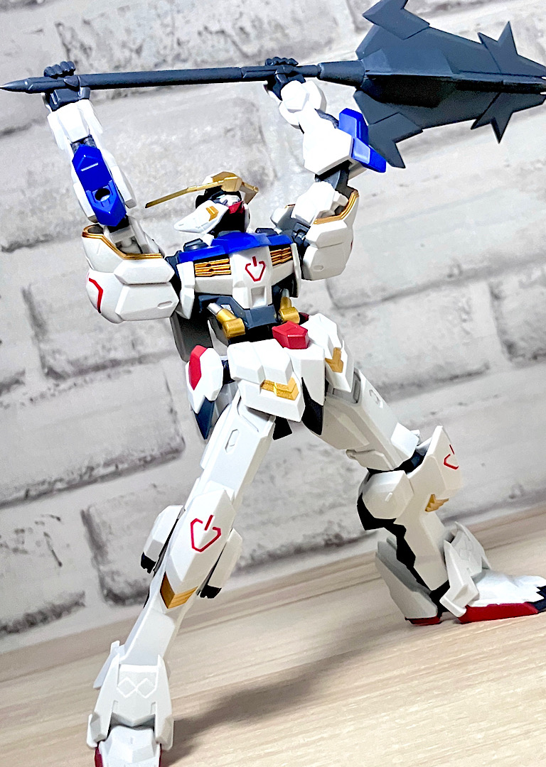 【可動】新型フレームにより素体はグリグリ動きます。バルバトスはそんなに装飾が多くないので腰のパーツポロリは少ないですが、上腕部を包むような肩パーツが腕周りを動かす時に干渉しがちです。