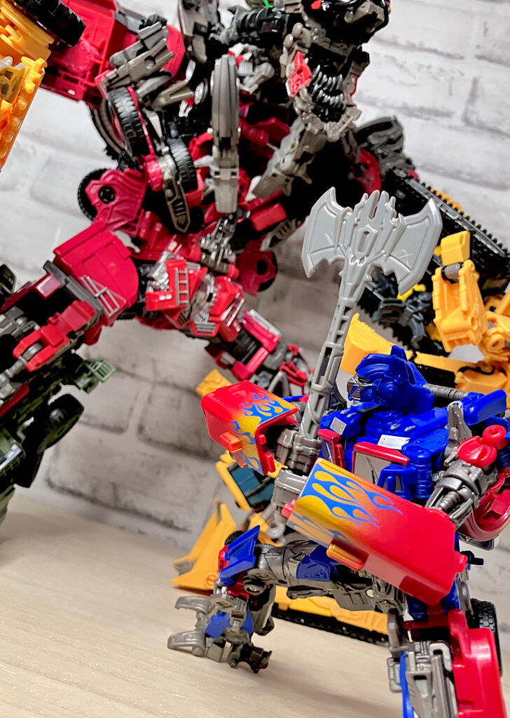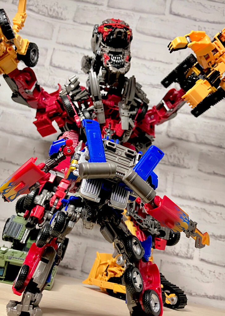 【フロント&リア】というわけでROTFデバステーターがついに完成!!8体のTFが組み合わさったデカさや重量感はもちろん、実写ならではのゴチャゴチャ感が加わって完成した時の満足感が半端ではなく、変な笑いが込み上げてきます。実際かなり複雑な変形と合体を経るため組み上げるまでにかなり時間がかかり、一般販売の変形ロボット玩具としてはトップクラスの難易度を誇るでしょう。