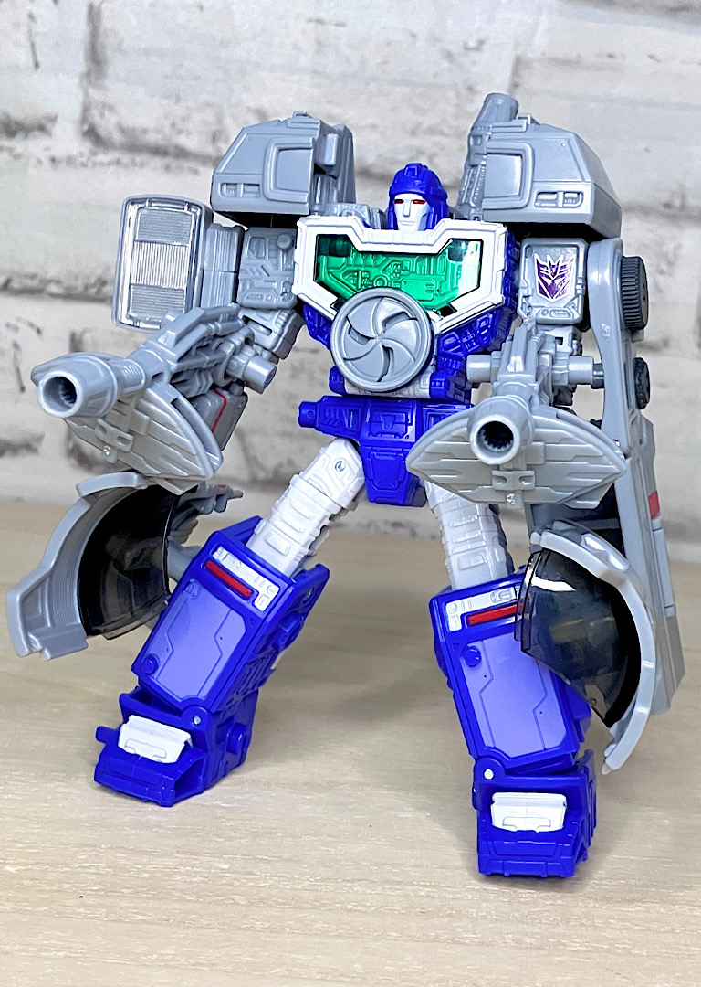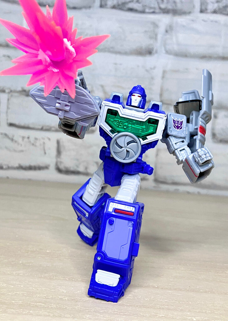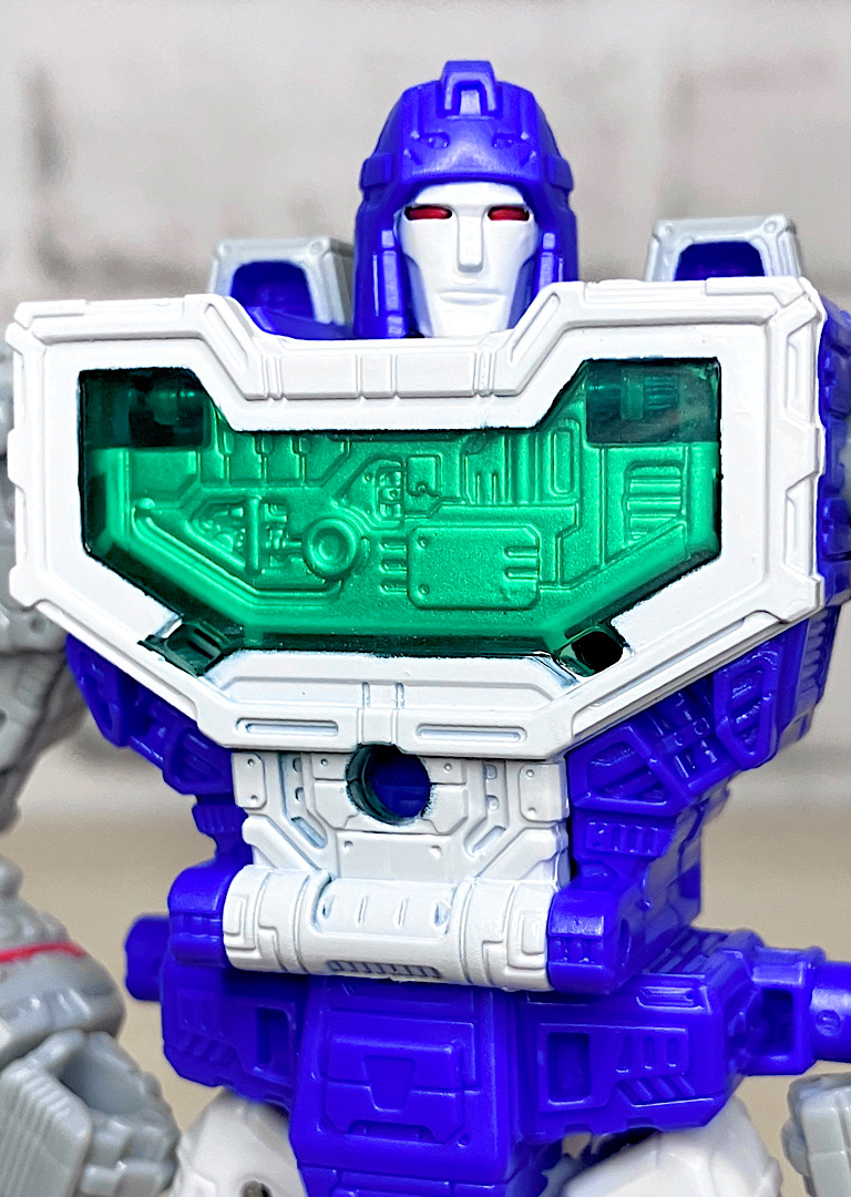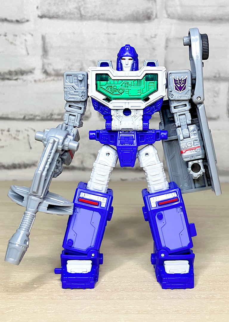 まずはこちら肩に大きなシールドを装備!これはG1トイを意識した3パック版に付いていたパーツで、個体名「スペクトロ」用の装備です。