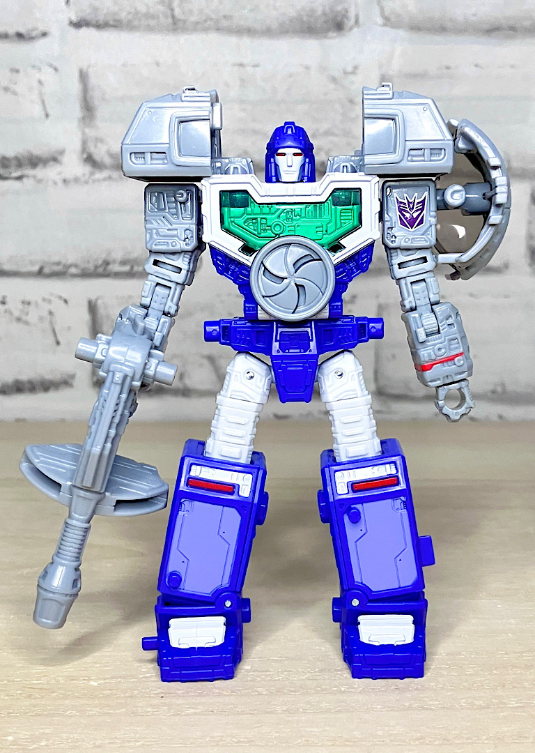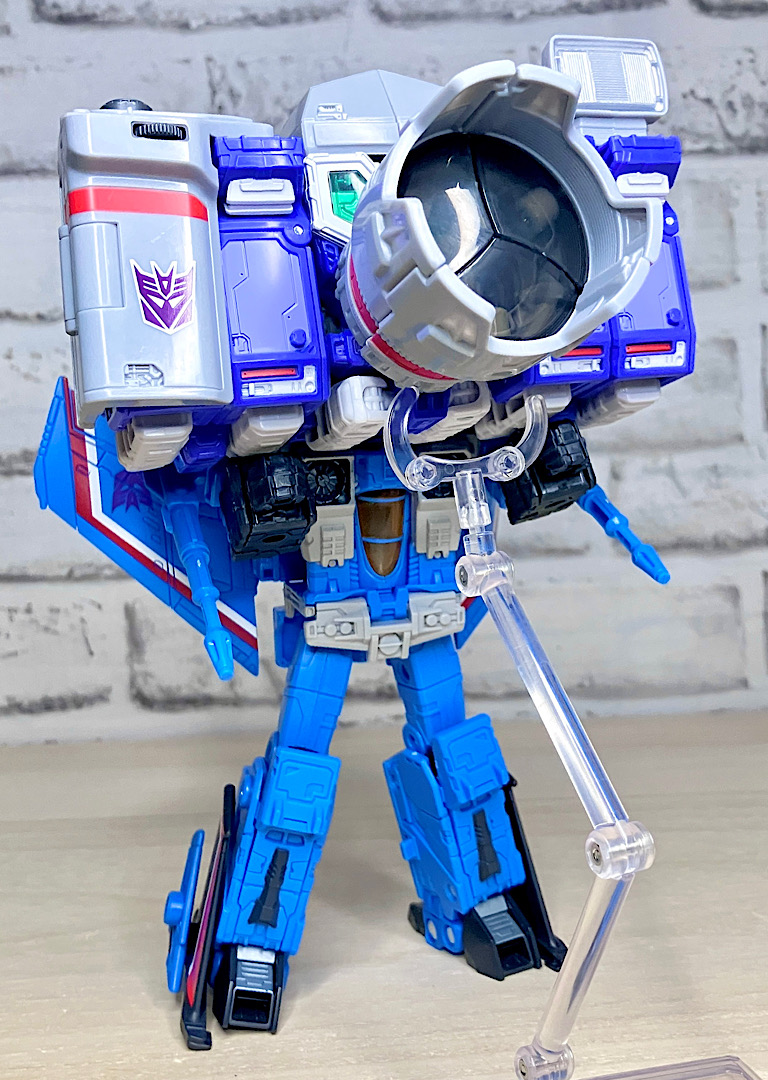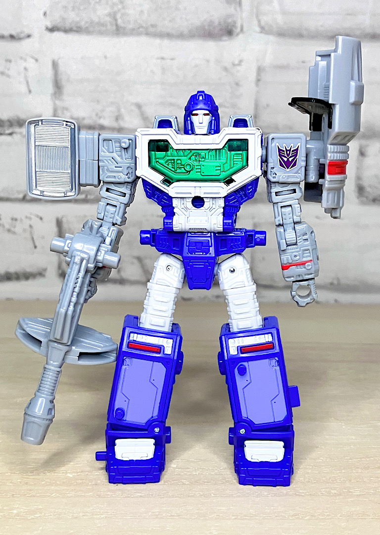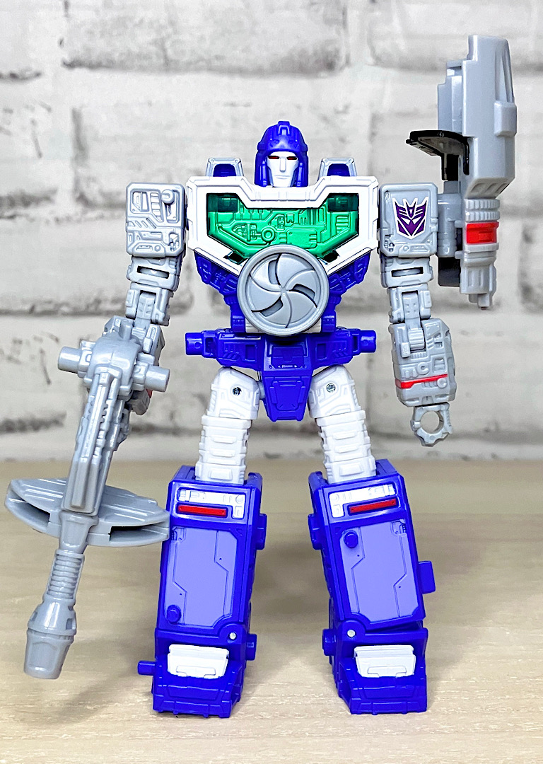 まずはこちら肩に大きなシールドを装備!これはG1トイを意識した3パック版に付いていたパーツで、個体名「スペクトロ」用の装備です。
