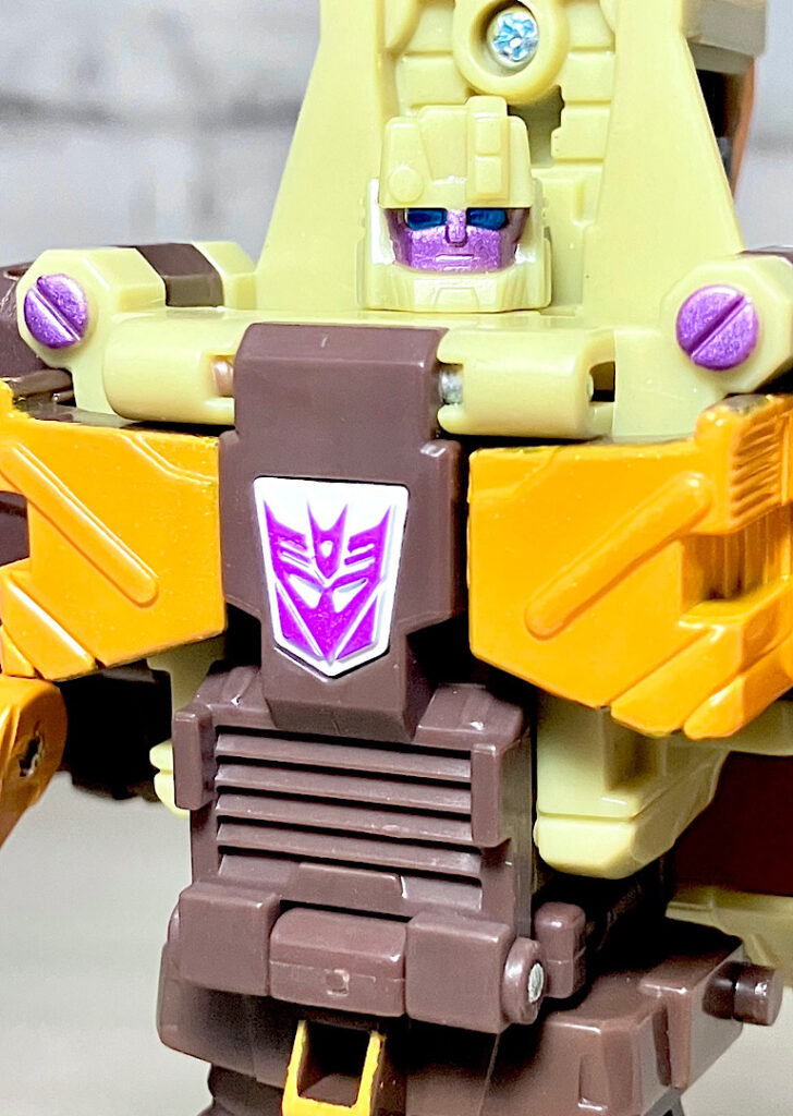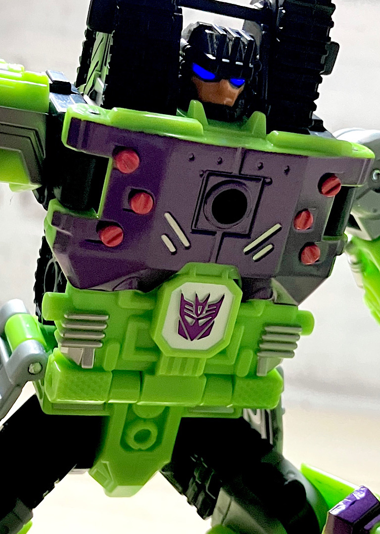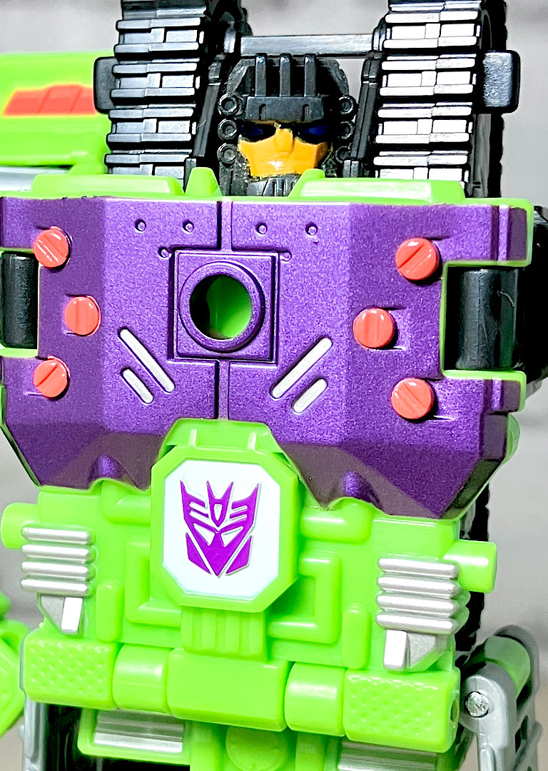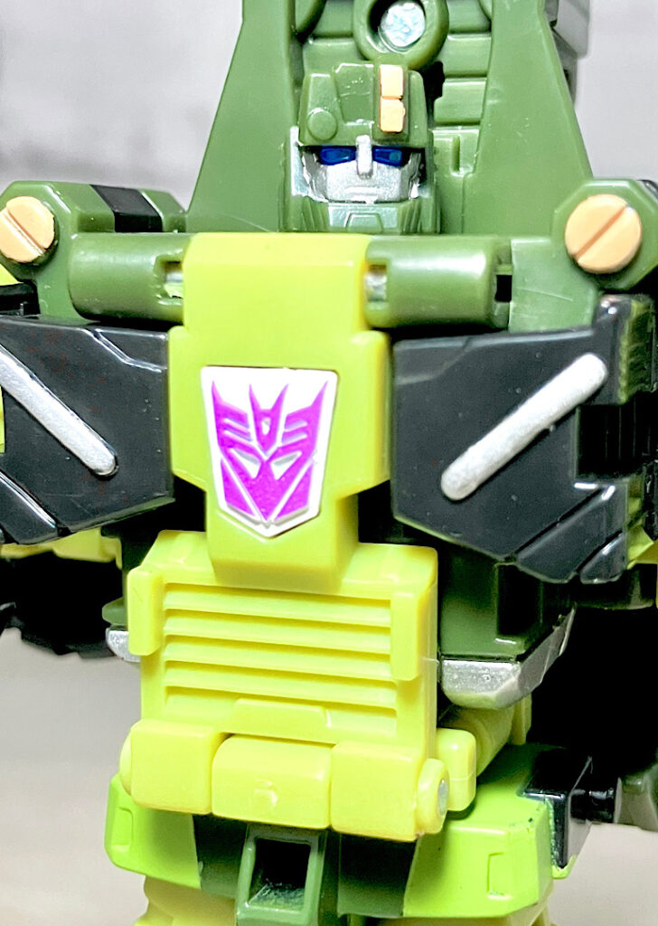 【アップ】キャラとしてはG1デバステーターを意識していますが、頭部デザインは全く異なるガスマスク系。同じスパリン合体戦士のブルーティカスに合わせたデザインなのかもしれません。