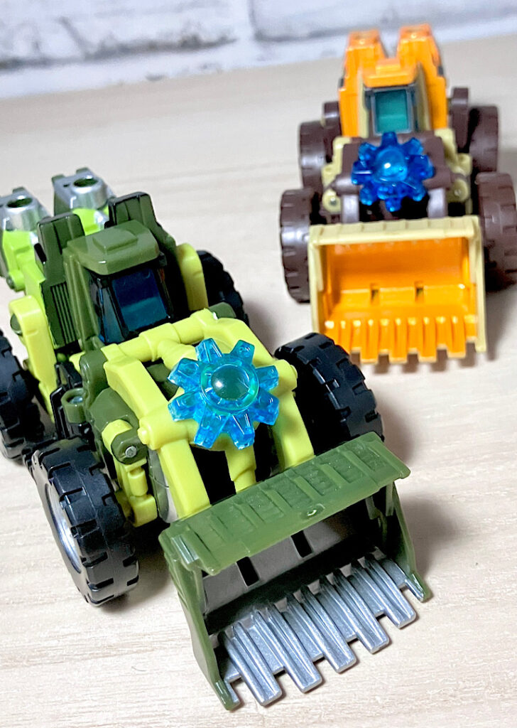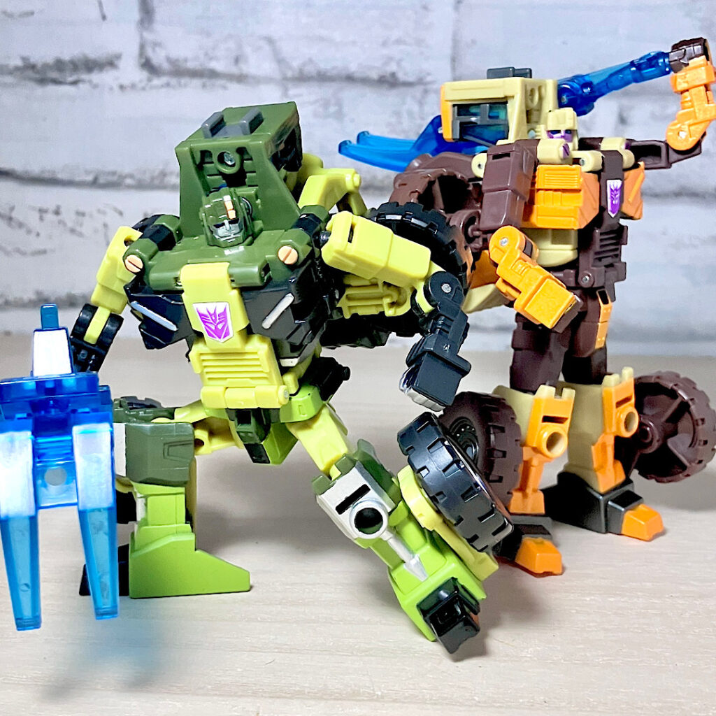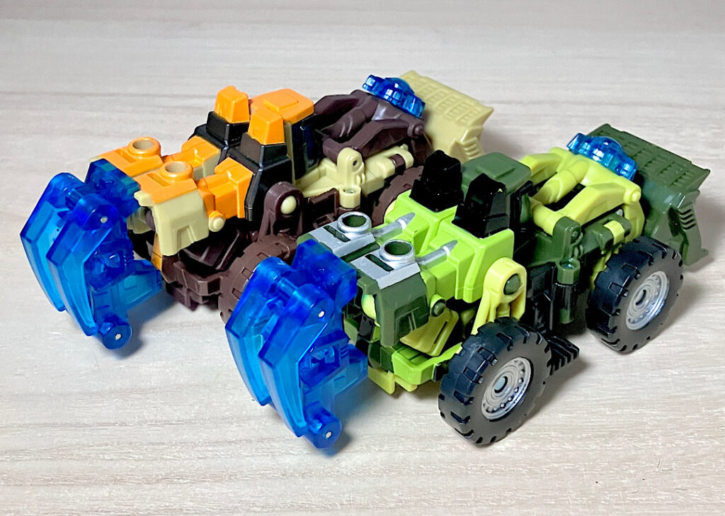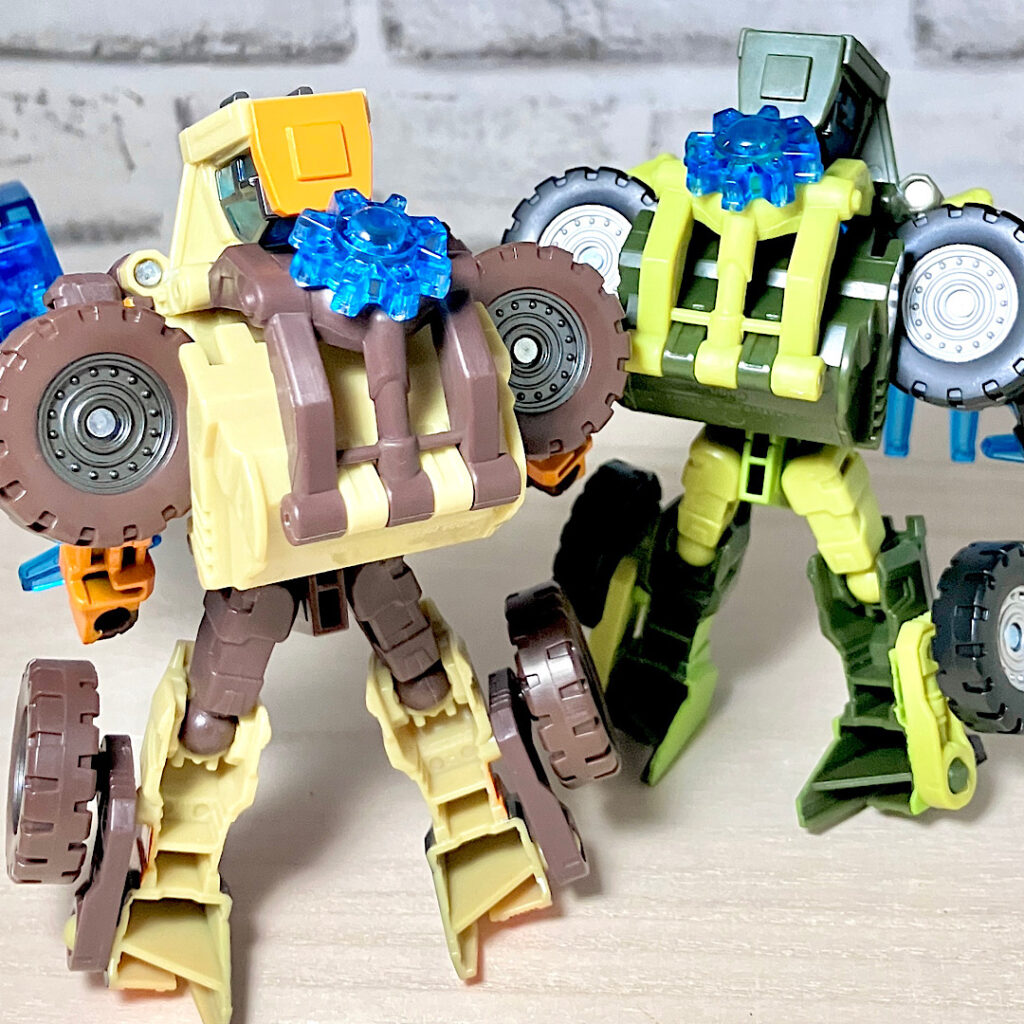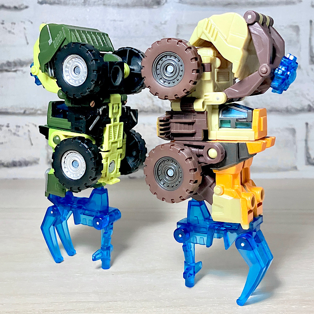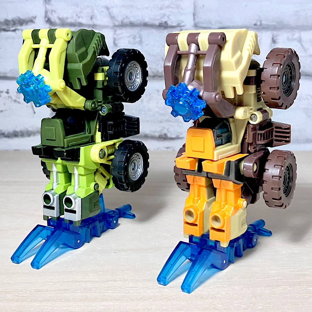 【ロボットモード】同型の2体で、緑がスクラッパー、ブラウンがボーンクラッシャーです。4つ配置された巨大なホイールがイカつくてステキ。