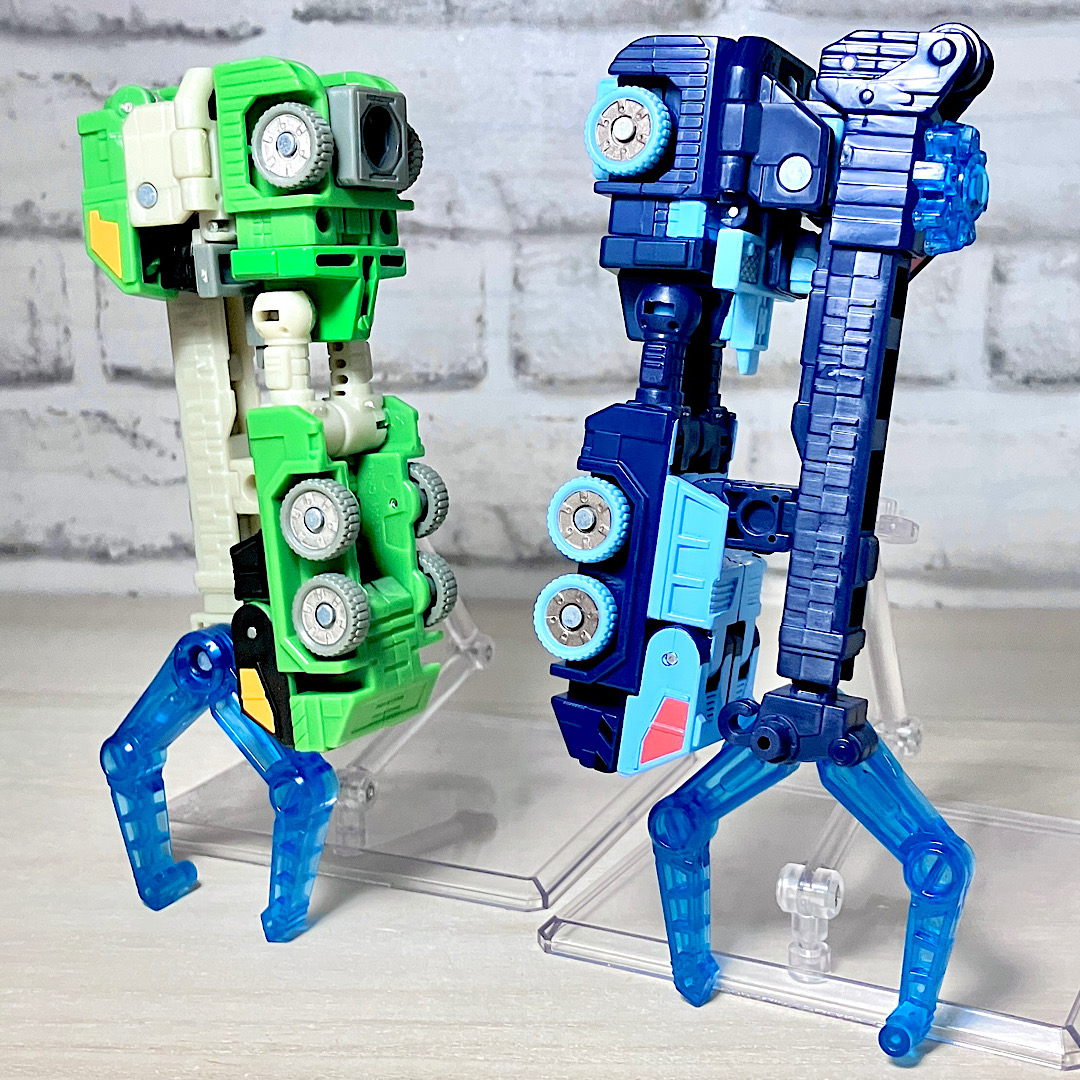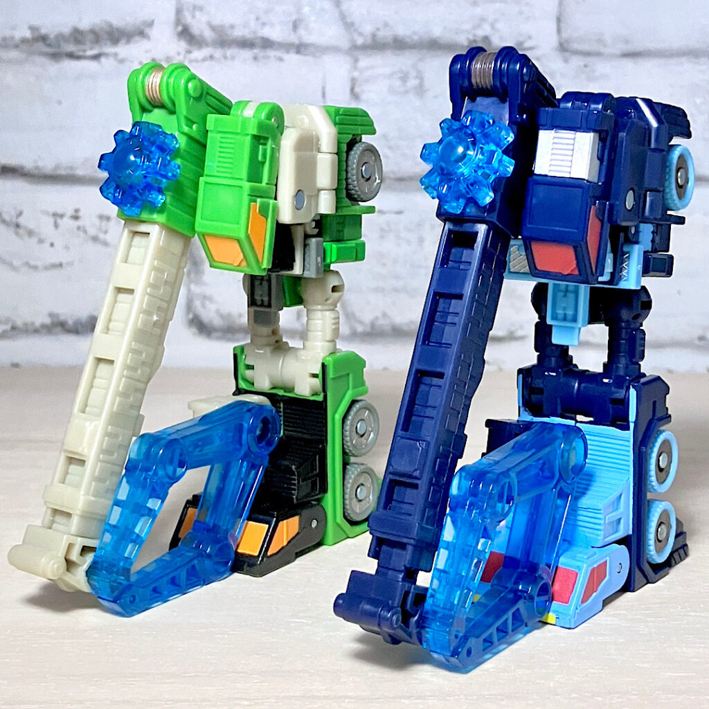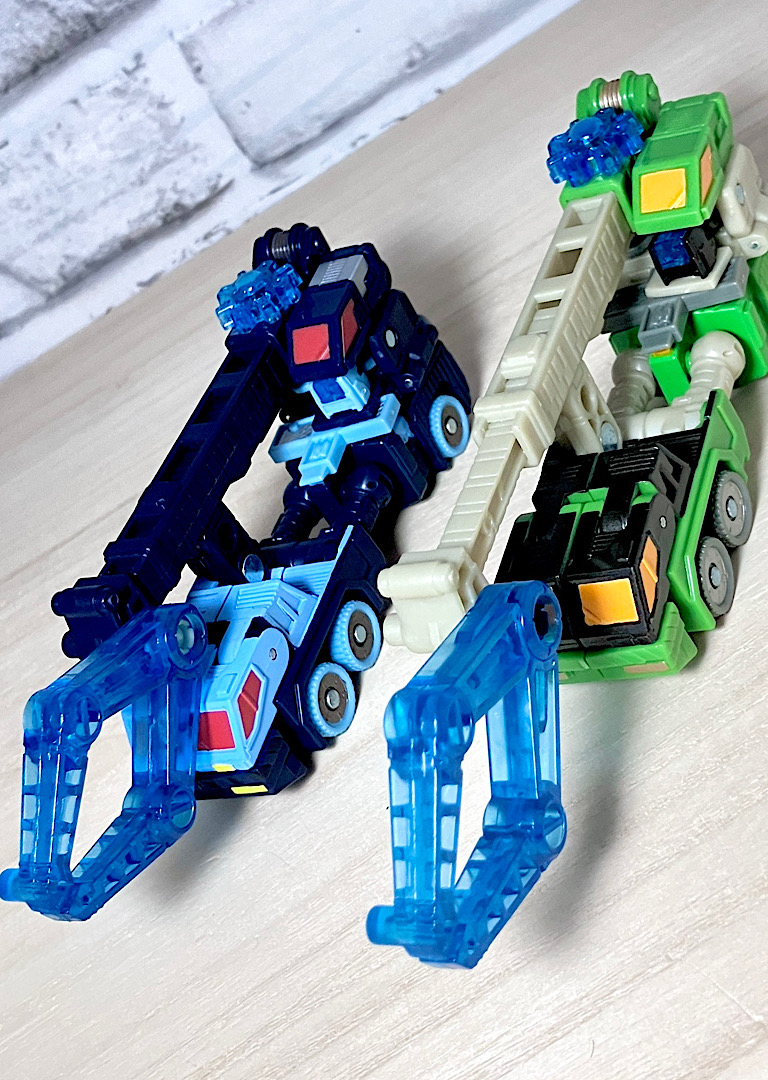 【ロボットモード】やはり同型の2体で、青い方がロングハウル、緑がグレン。ホイルローダー組とはうってかわってひょろっとした体形で、片手がクレーンそのままというこれまた変わったデザインです。