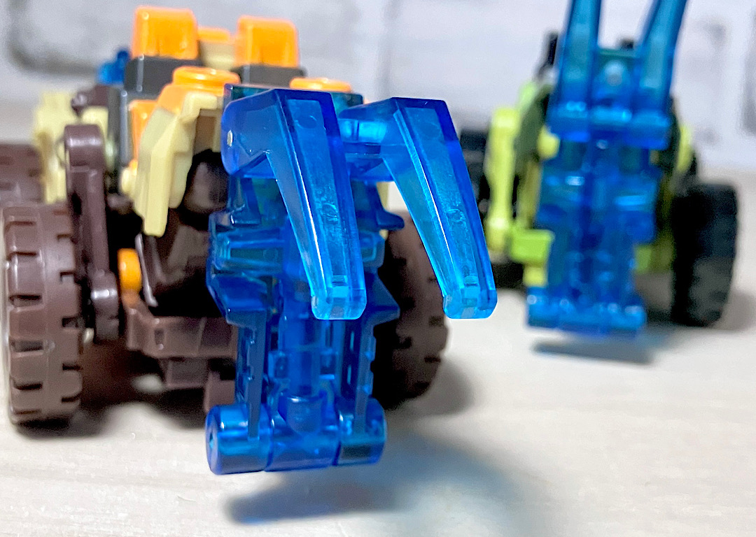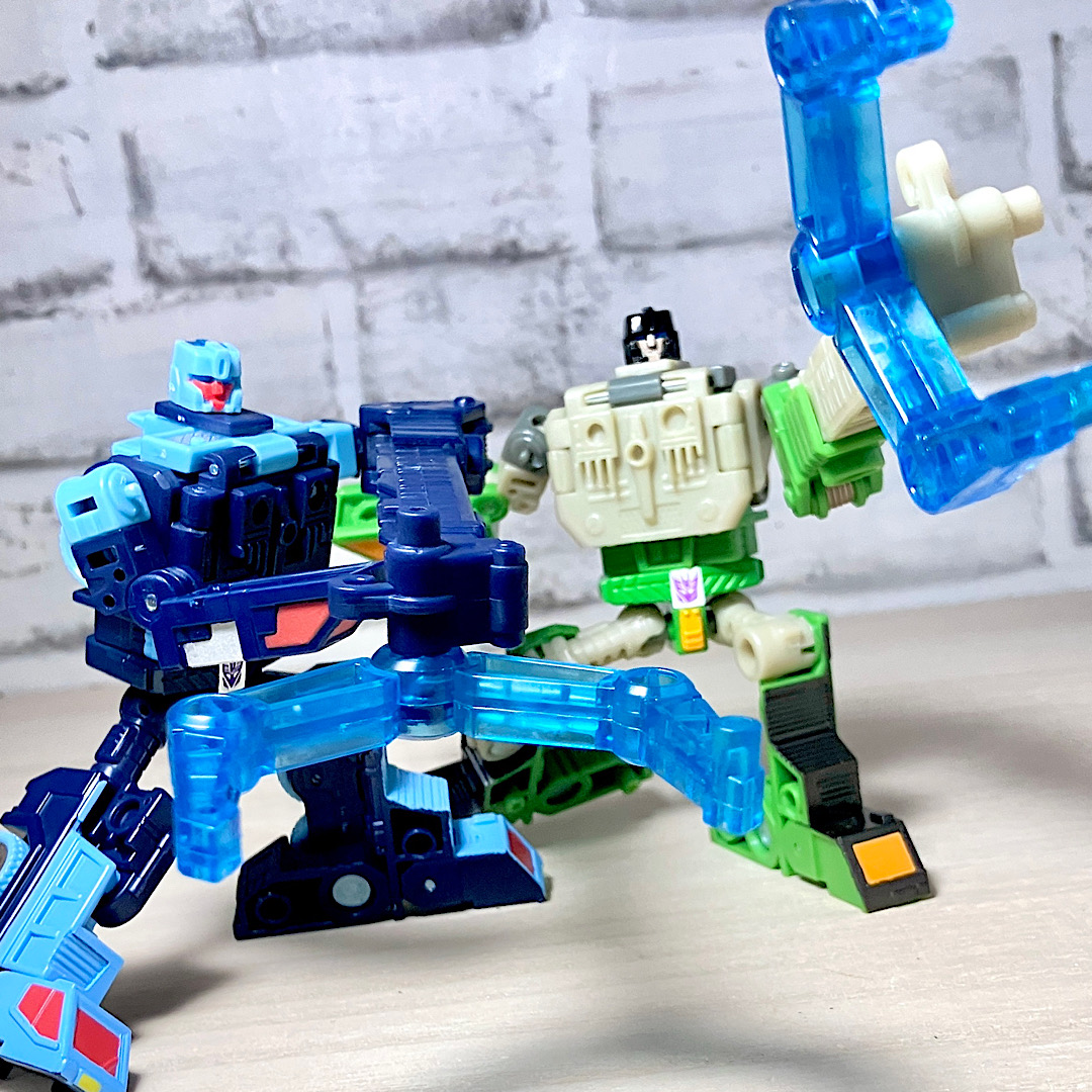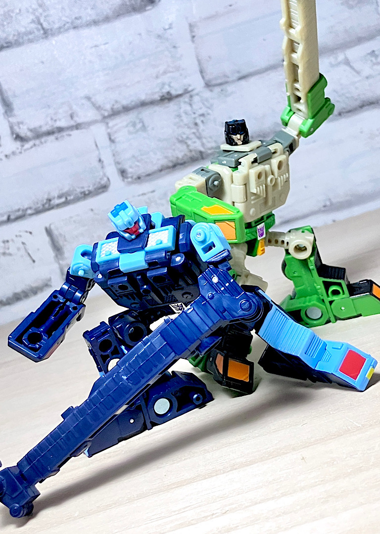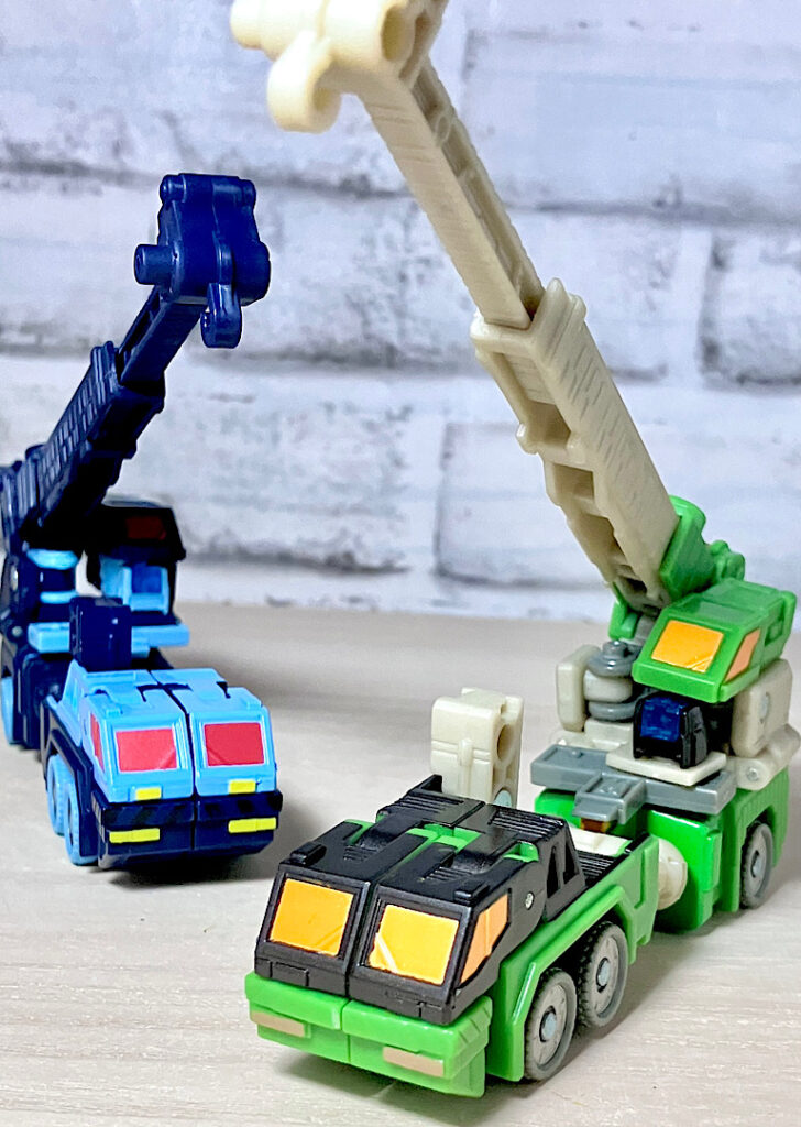 【ロボットモード】やはり同型の2体で、青い方がロングハウル、緑がグレン。ホイルローダー組とはうってかわってひょろっとした体形で、片手がクレーンそのままというこれまた変わったデザインです。
