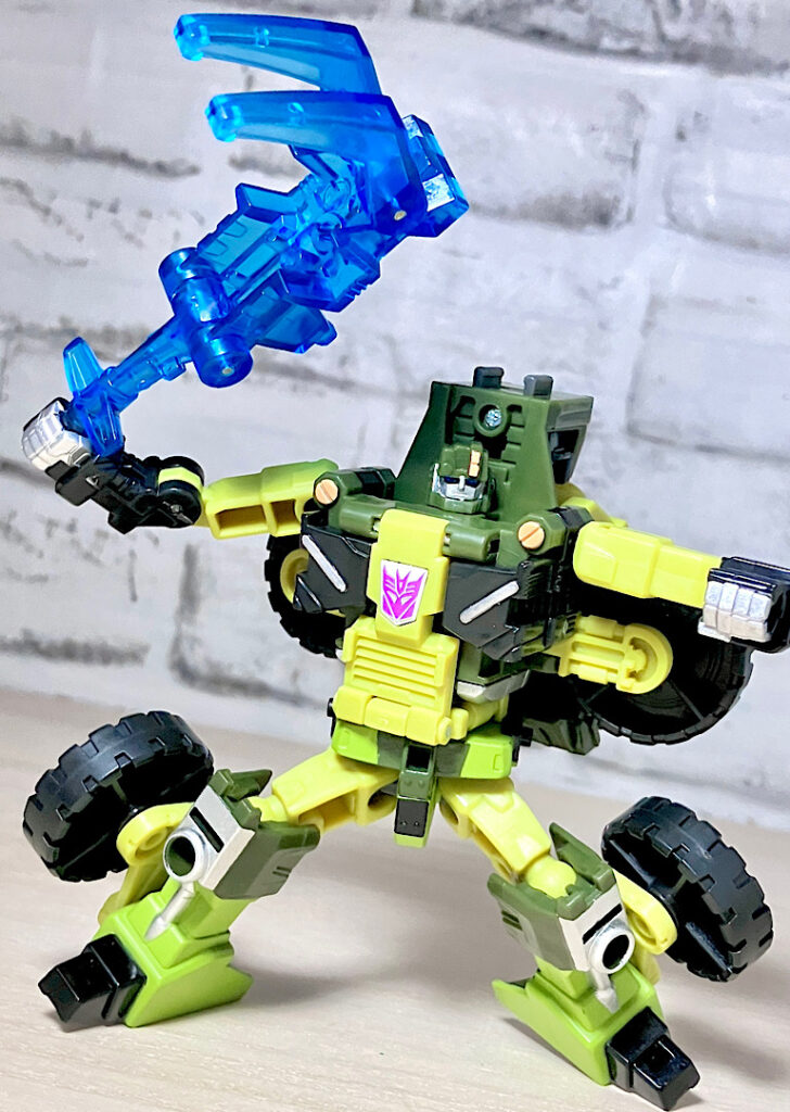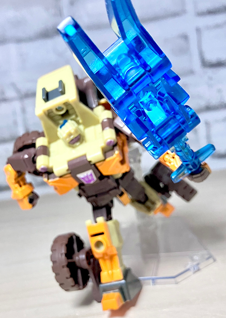エネルゴンウェポンやエネルゴンスターは、ロボットモードでももちろん使用可能。ウェポンはクロー状の武器ですね。農具にも見えてしまいますが…。