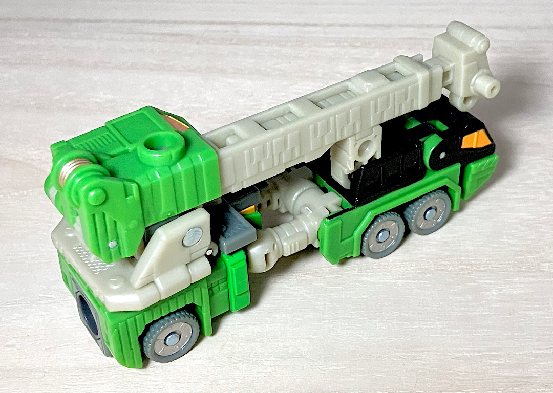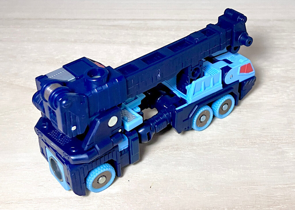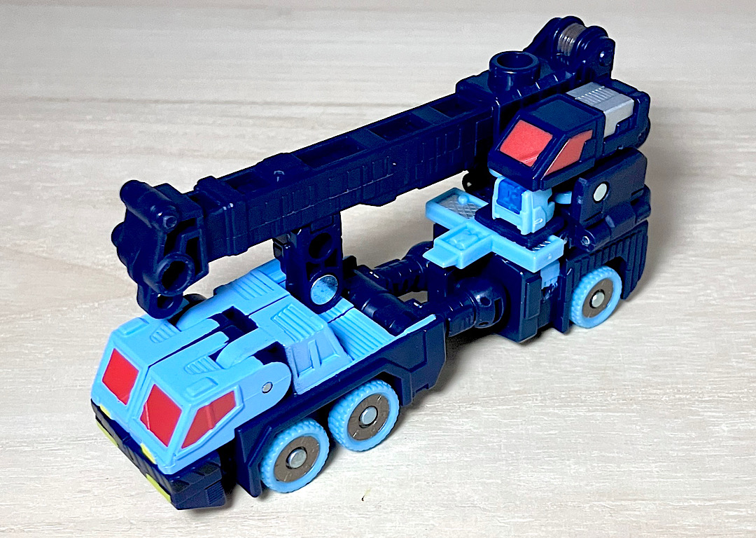 【ビークルモード】クレーン車に変形。グレンはともかくロングハウルのライトブルーなカラーは建設ロボとして珍しいカラーリングですね。