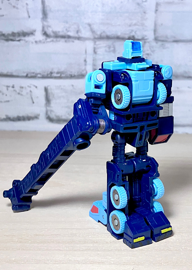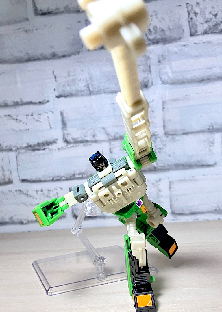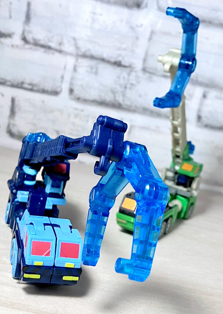 アクション面ではヒジが無いので限定的。ただクレーン車組は変形を崩すことで擬似的に関節を生み出すことができます。