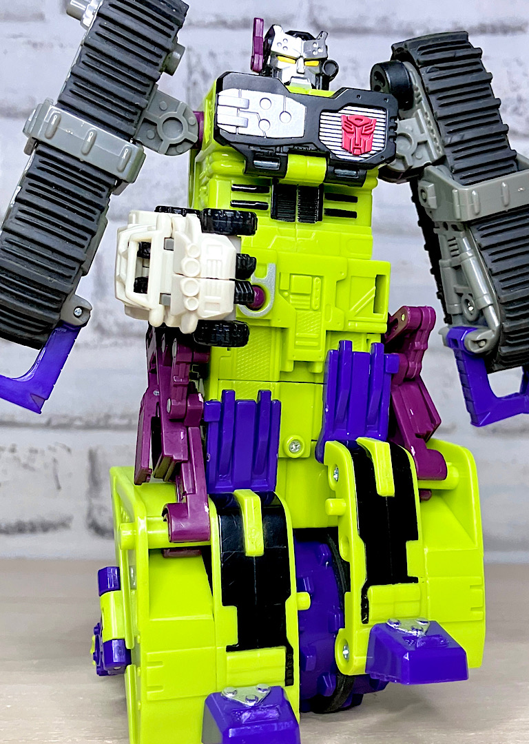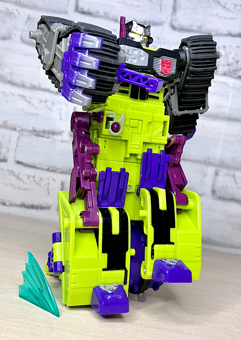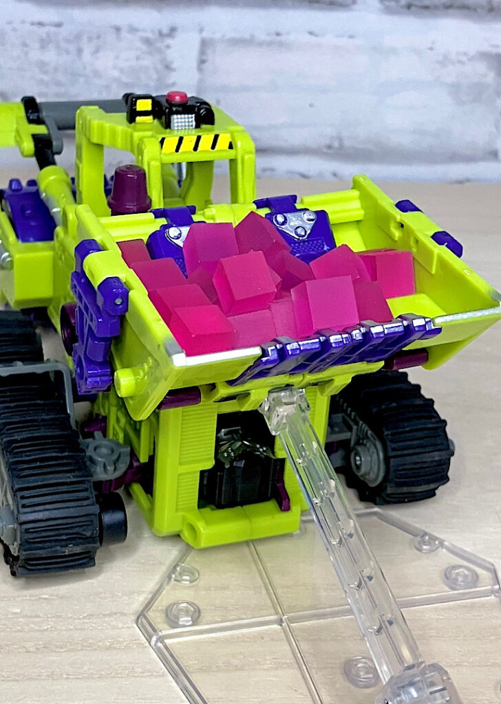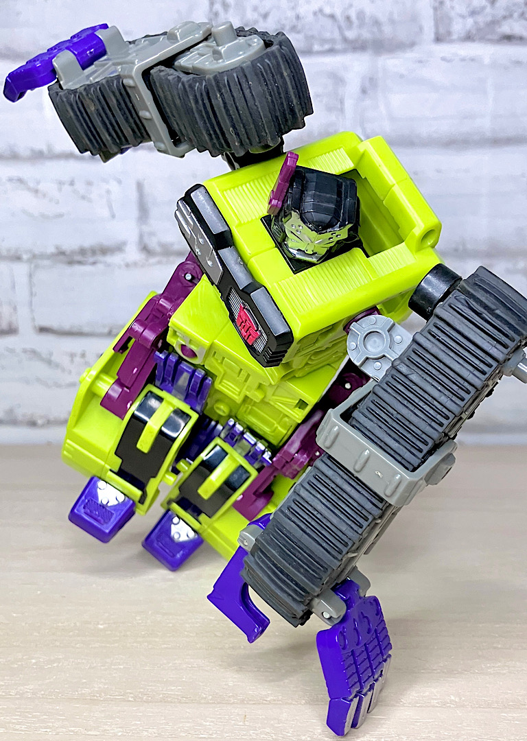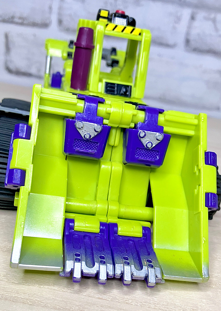緑の建機モチーフということで明らかにG1デバステーターを意識したデザインですが、特に合体などはしない単体TF。そんなことよりギミックを優先した特殊なアイテムのため、脚部は前面にパネルが付いただけのほぼ見立てみたいなものになっちゃっています。