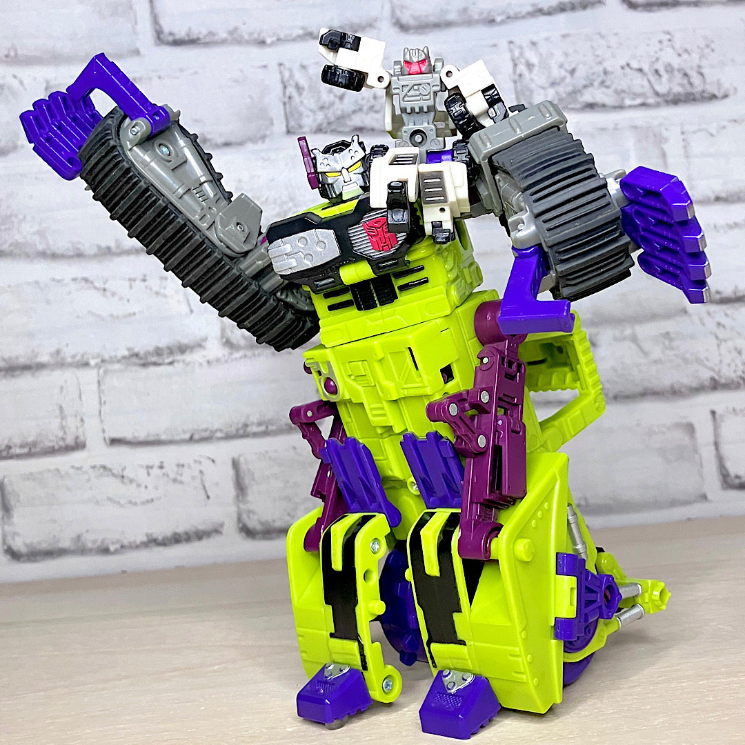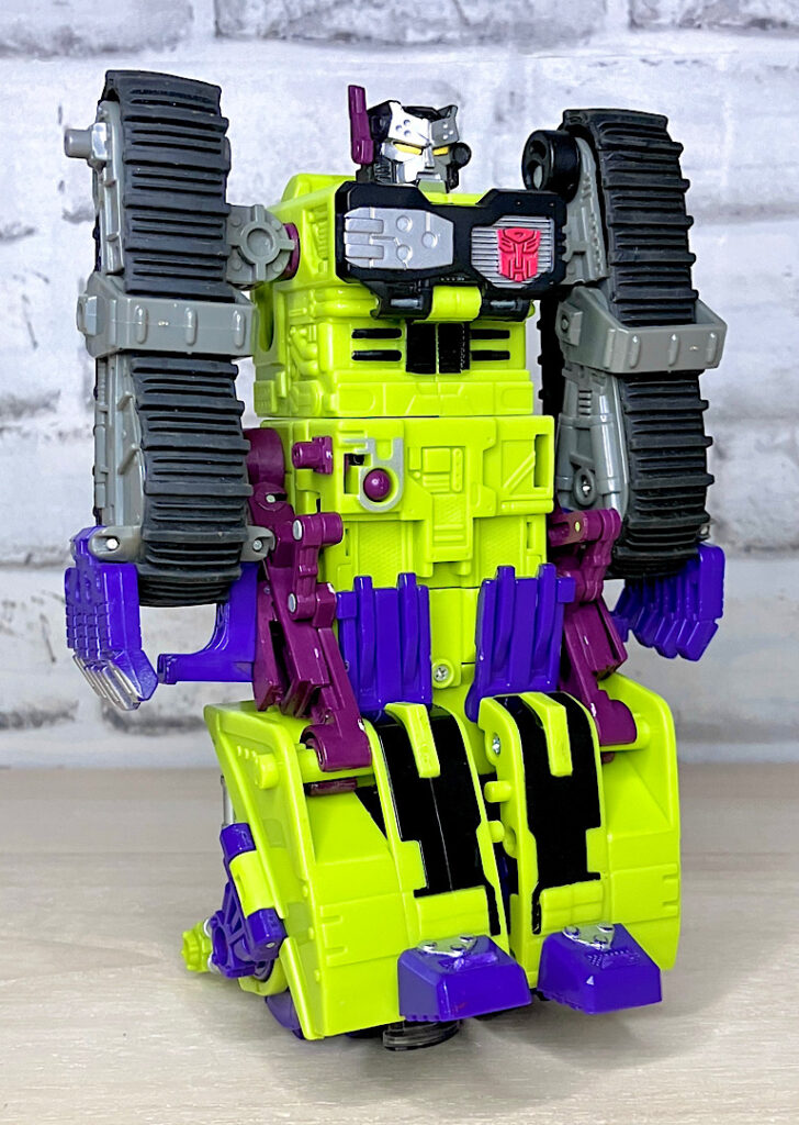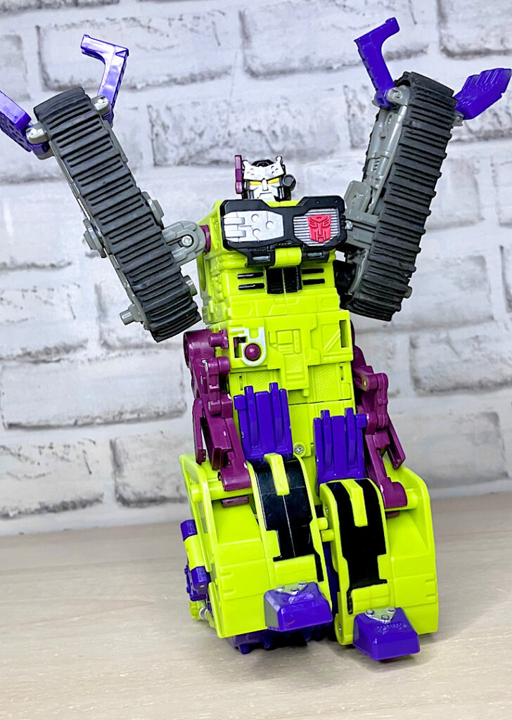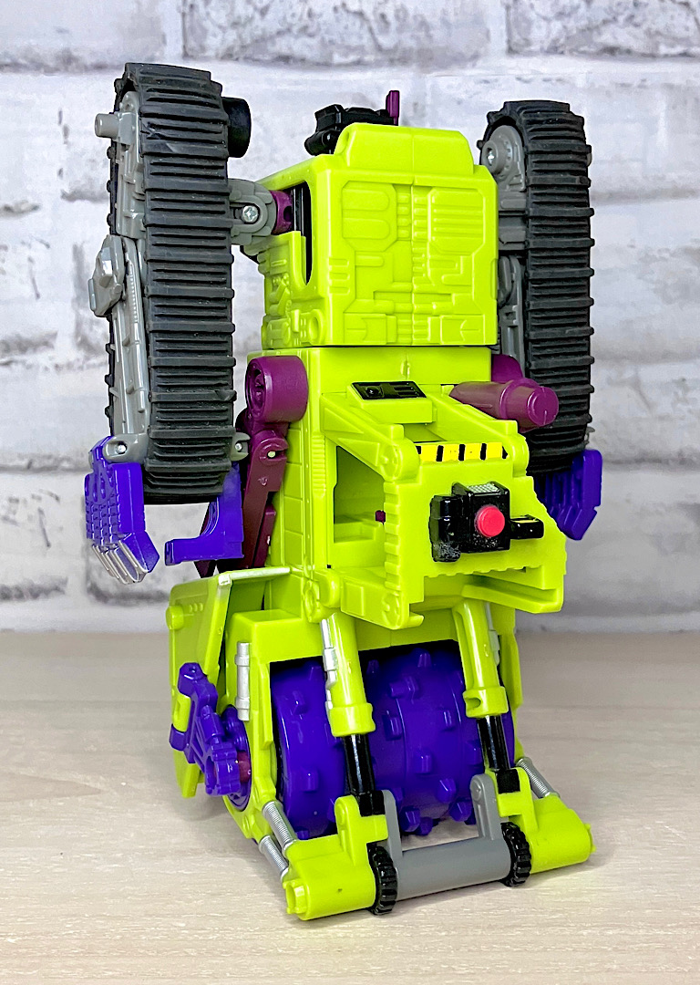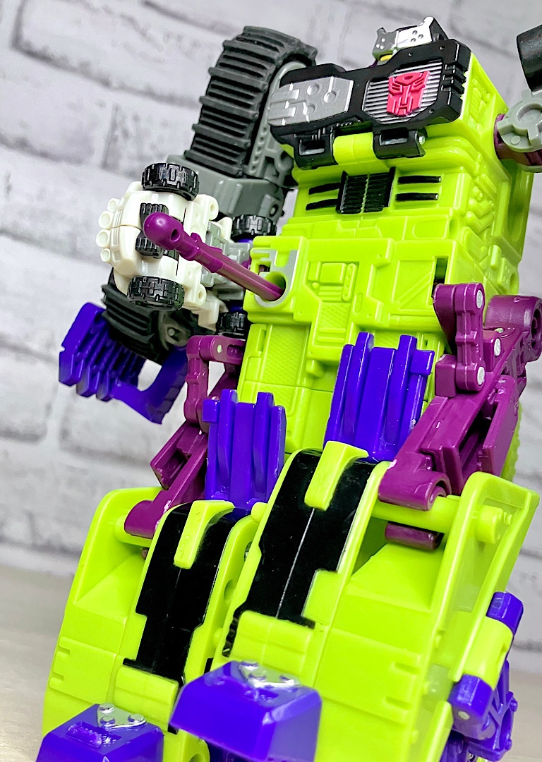 緑の建機モチーフということで明らかにG1デバステーターを意識したデザインですが、特に合体などはしない単体TF。そんなことよりギミックを優先した特殊なアイテムのため、脚部は前面にパネルが付いただけのほぼ見立てみたいなものになっちゃっています。