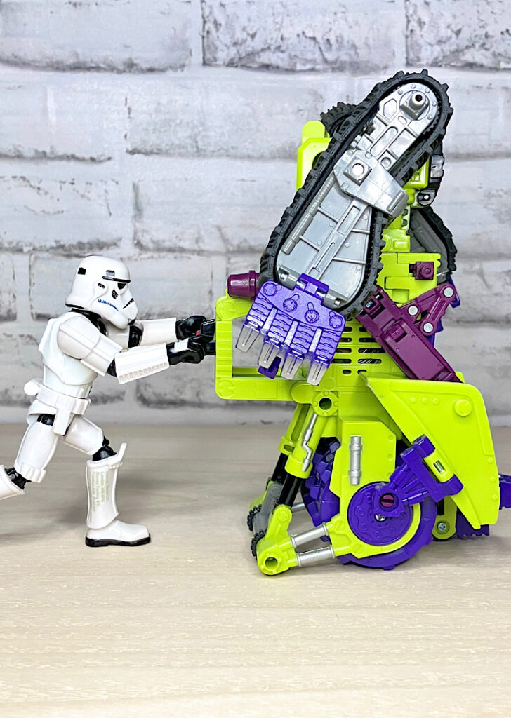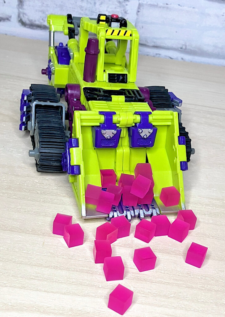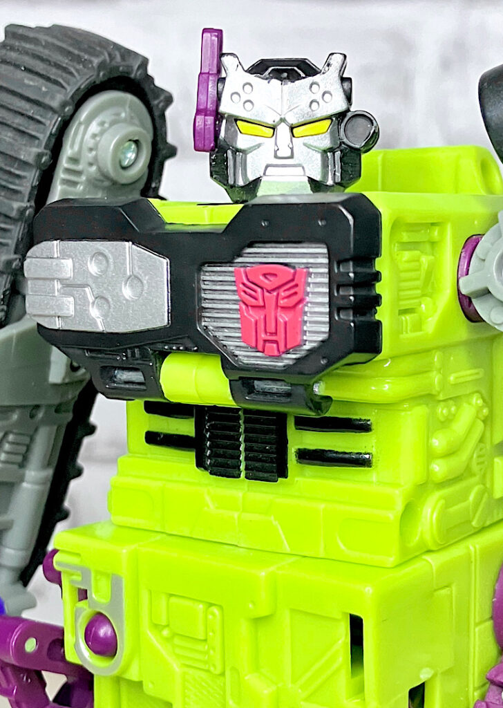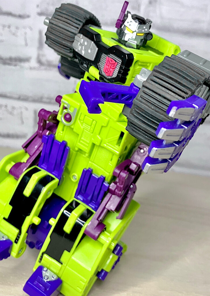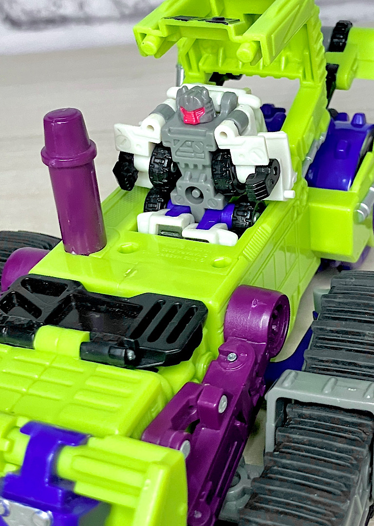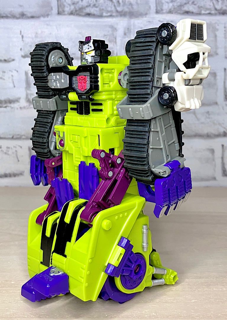 緑の建機モチーフということで明らかにG1デバステーターを意識したデザインですが、特に合体などはしない単体TF。そんなことよりギミックを優先した特殊なアイテムのため、脚部は前面にパネルが付いただけのほぼ見立てみたいなものになっちゃっています。