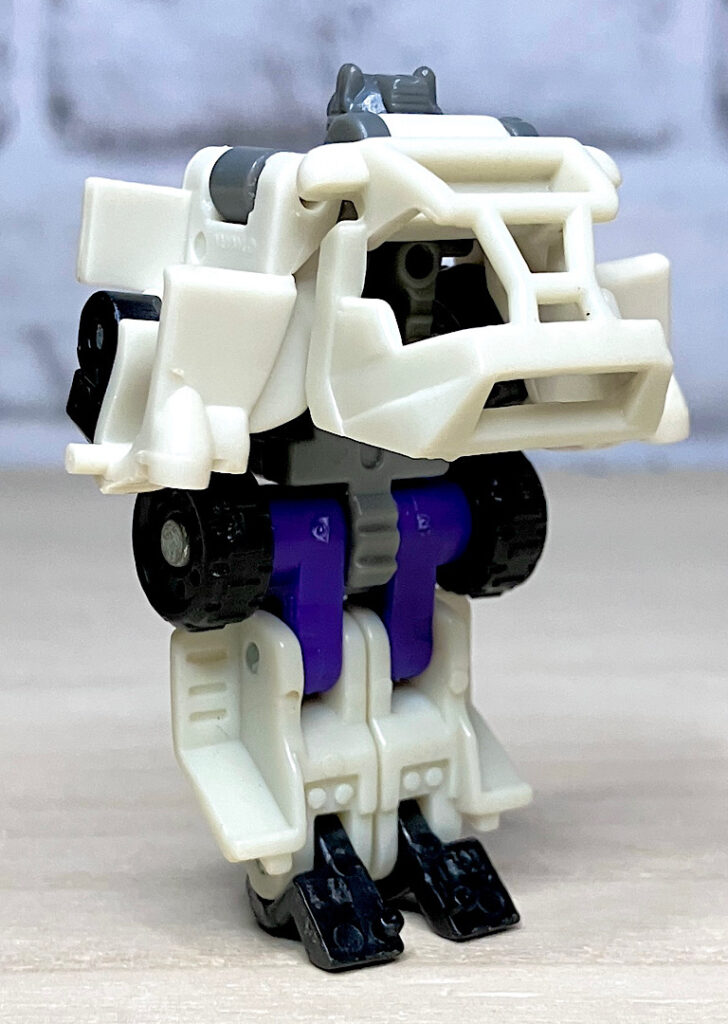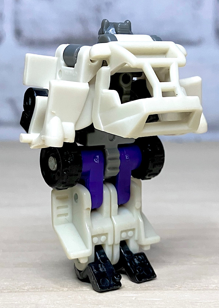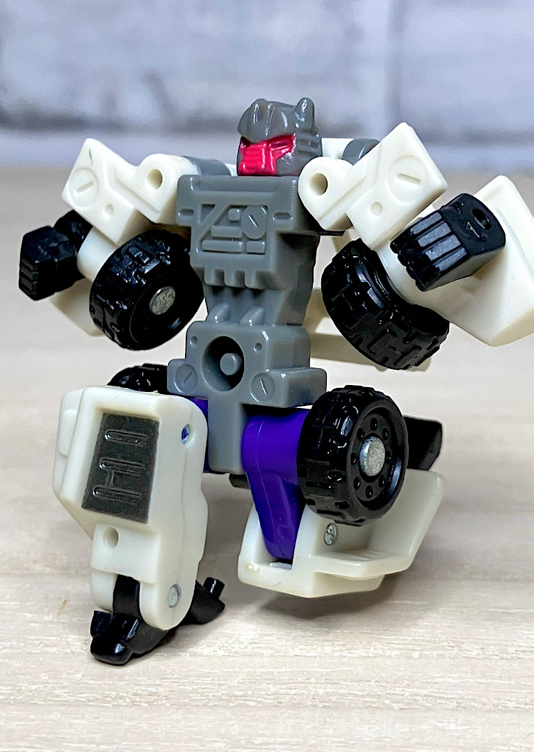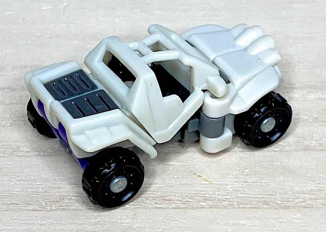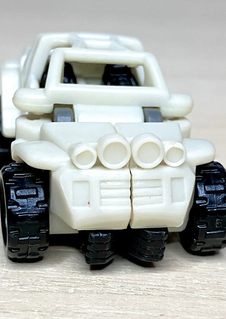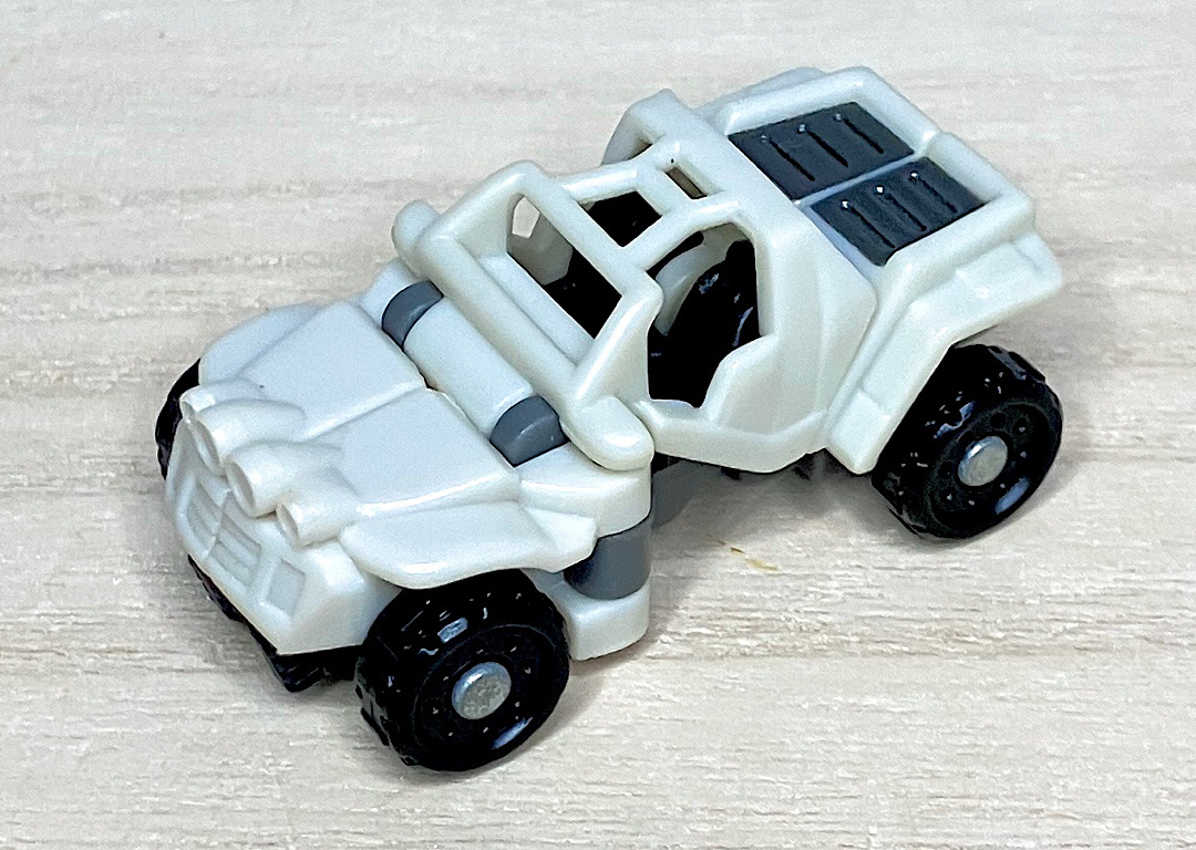 白いバギーに変形。シンプルな構造で、コロ走行以外に特にギミックはありません。