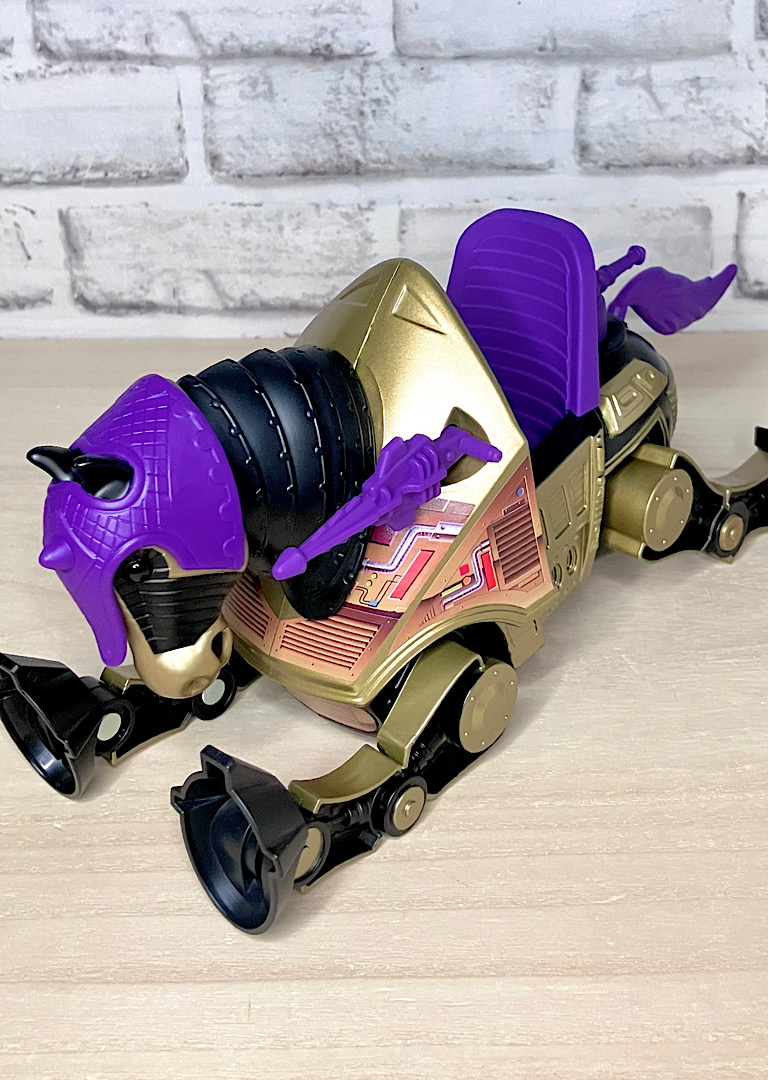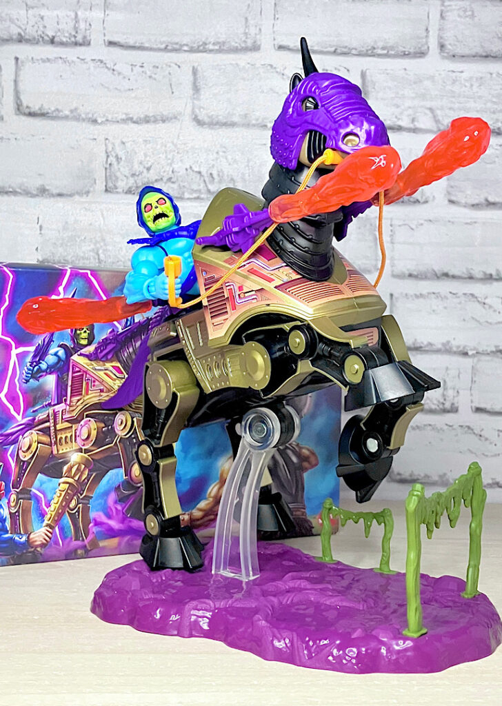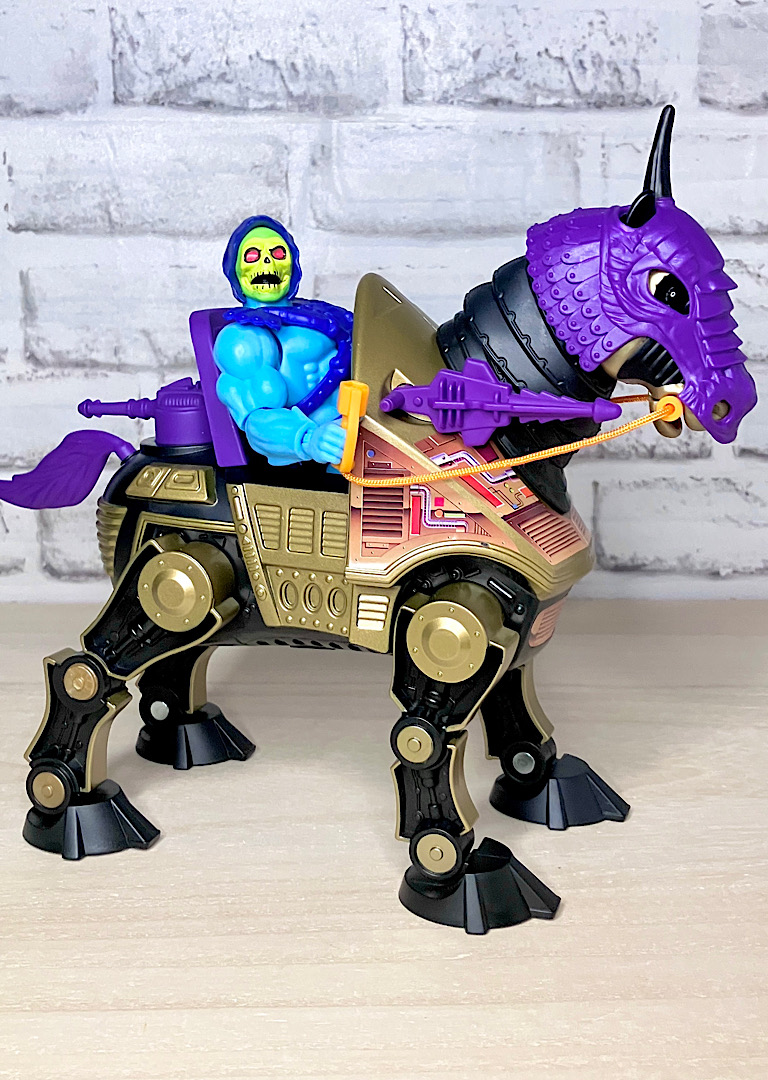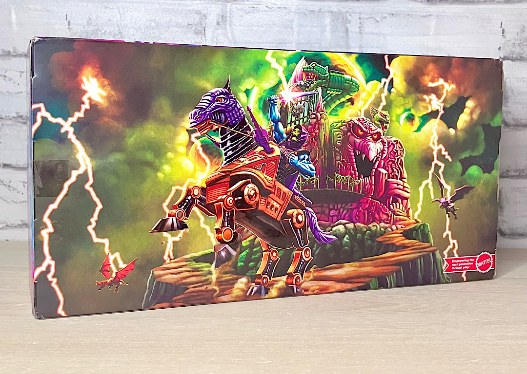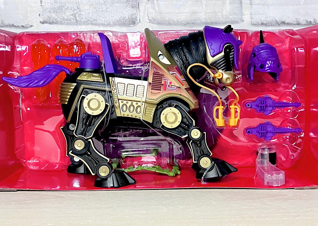 【パッケージ】ヒーマンたちが乗る馬型メカ・ストライダーと対になるスケルター陣営の馬型メカ。メタな話をすると要するにリカラー商品です。オリジナルトイは1985年に発売されましたが、フィルメーションアニメでの活躍は特にありませんでした。また、オリジンズでは2024年にマテル直営サイトクリエイションズでの限定リリースとなりました。