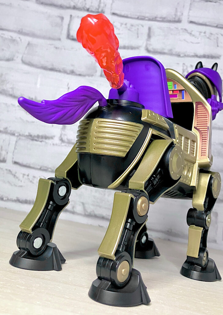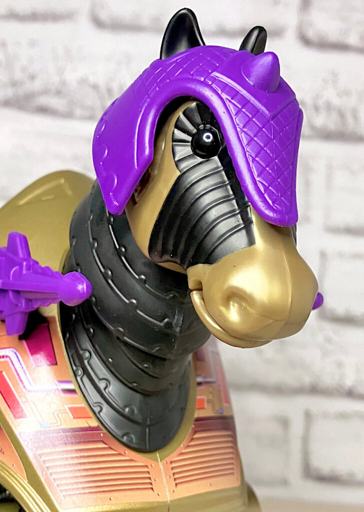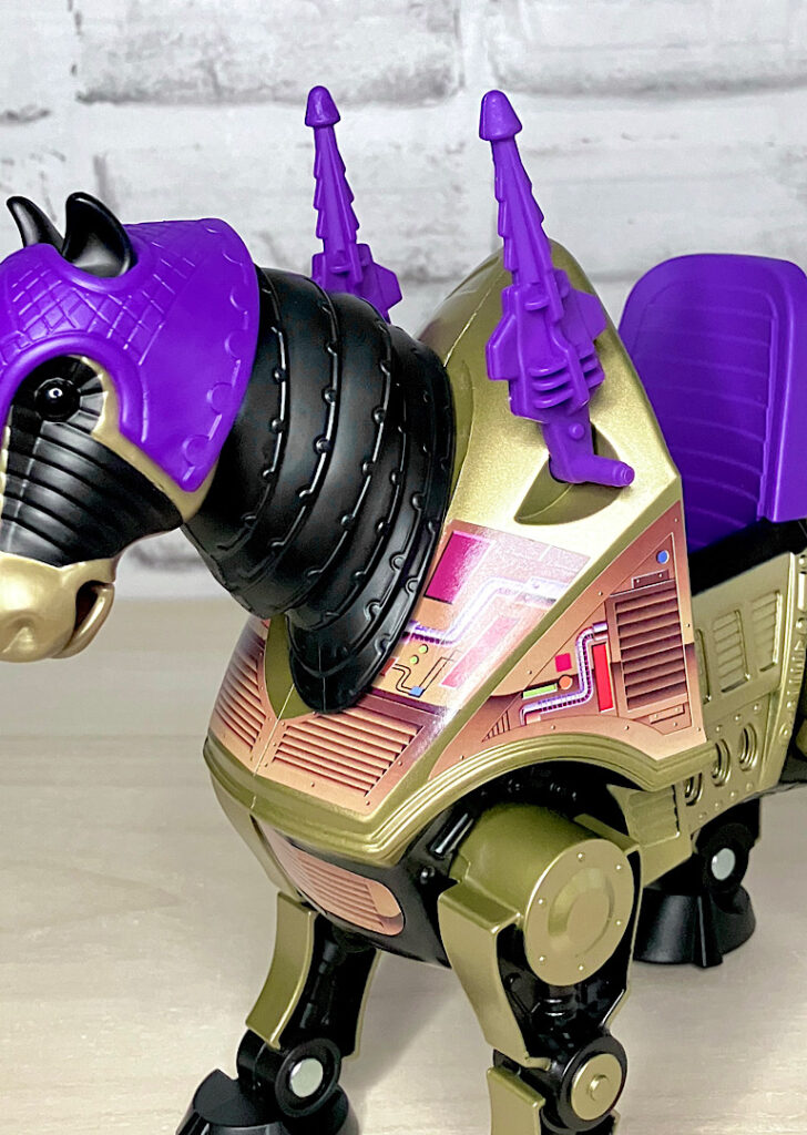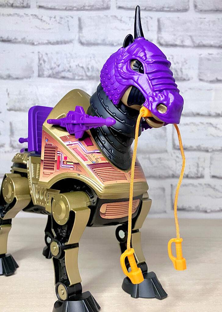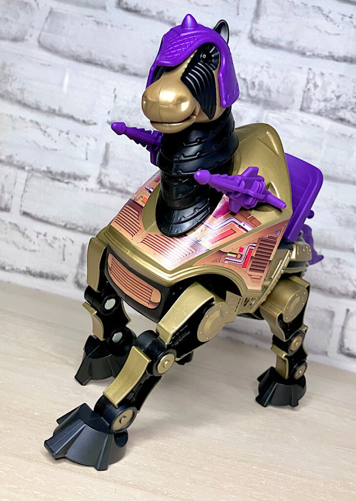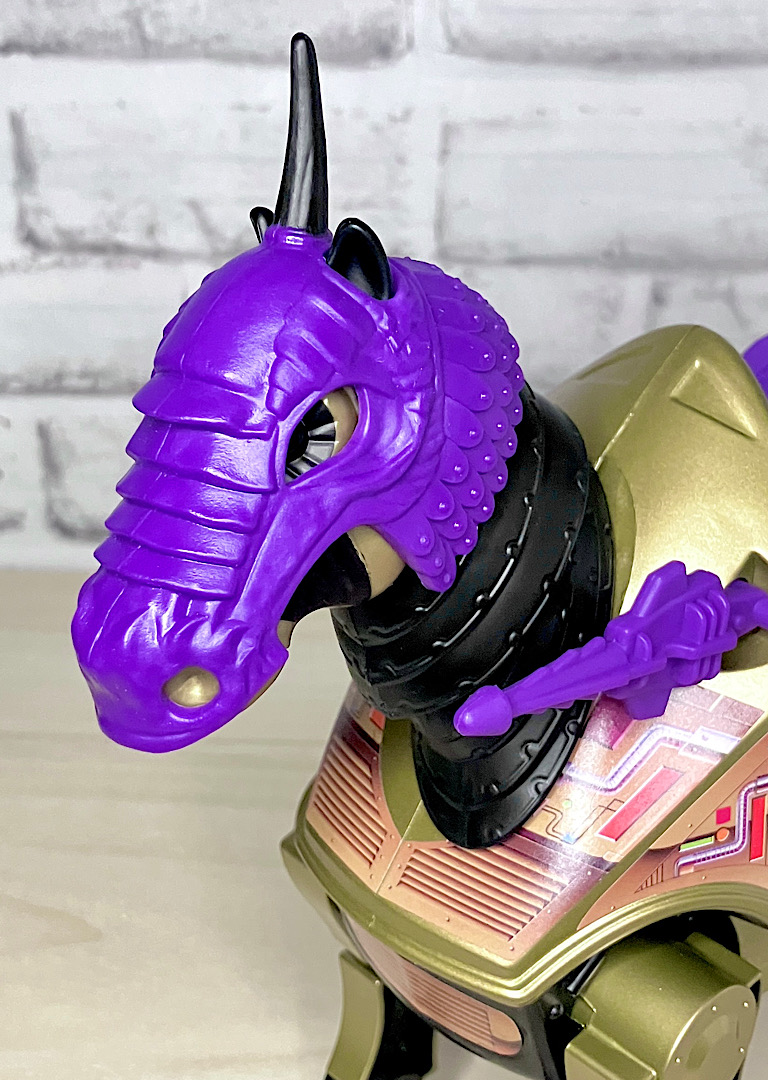 【パッケージ】ヒーマンたちが乗る馬型メカ・ストライダーと対になるスケルター陣営の馬型メカ。メタな話をすると要するにリカラー商品です。オリジナルトイは1985年に発売されましたが、フィルメーションアニメでの活躍は特にありませんでした。また、オリジンズでは2024年にマテル直営サイトクリエイションズでの限定リリースとなりました。
