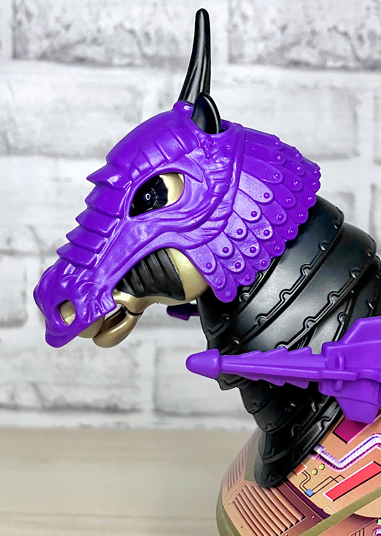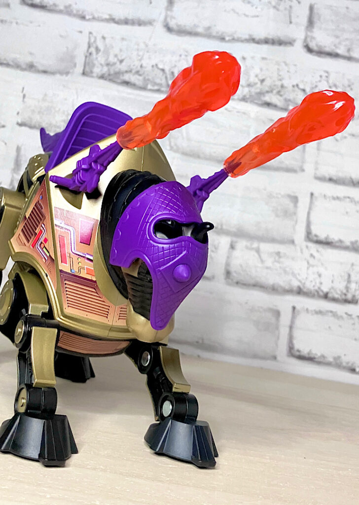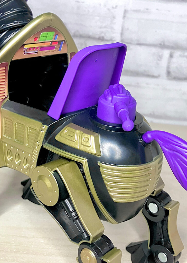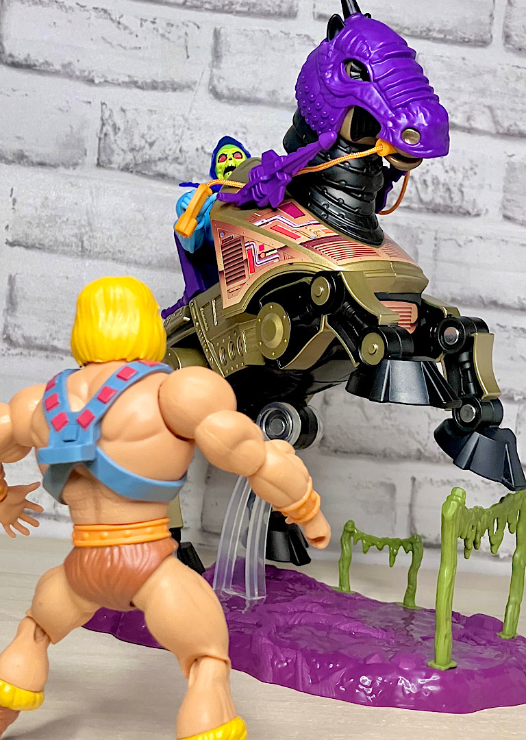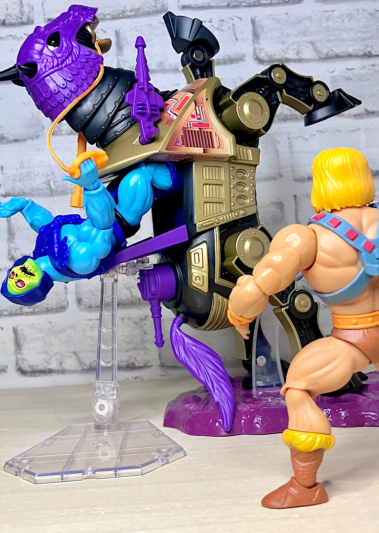 【パッケージ】ヒーマンたちが乗る馬型メカ・ストライダーと対になるスケルター陣営の馬型メカ。メタな話をすると要するにリカラー商品です。オリジナルトイは1985年に発売されましたが、フィルメーションアニメでの活躍は特にありませんでした。また、オリジンズでは2024年にマテル直営サイトクリエイションズでの限定リリースとなりました。